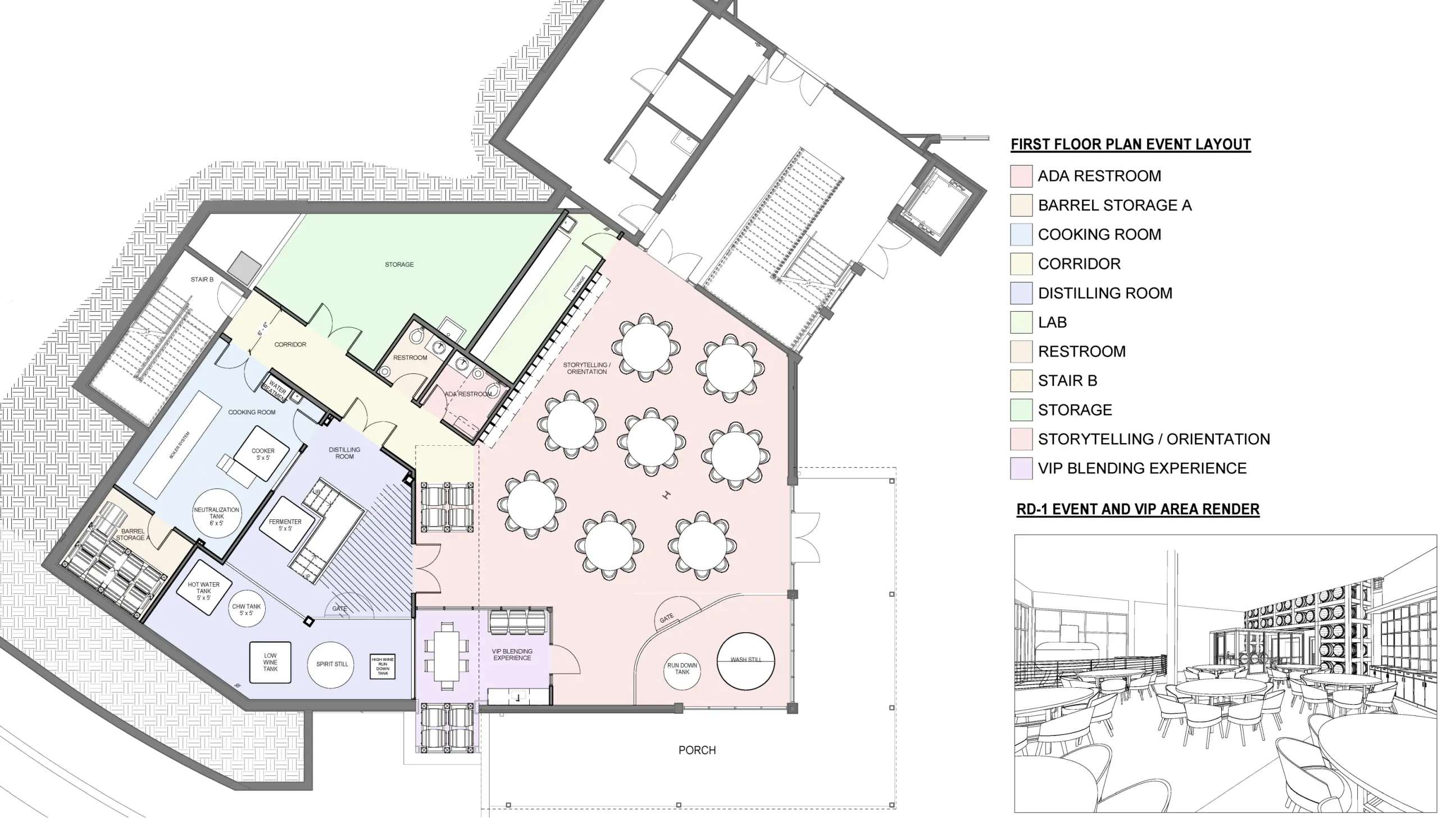 The RD1 Distillery at The Commons, designed by Lord Aeck Sargent, seamlessly integrates Lexington’s rich bourbon heritage with contemporary innovation in wood finishing. The two-story, 10,215-square-foot facility features outdoor seating areas on both levels, providing scenic views of a historic water tower, a prominent landmark within the entertainment district. The distillery offers visitors an engaging experience with interactive exhibits highlighting bourbon milestones, a comprehensive fermentation-to-distillation tour, and an R&D lab for wood finishing. Additionally, the space includes four private tasting rooms, a VIP speakeasy, a craft cocktail bar, a gift shop, and private event areas, all meticulously crafted to enhance the visitor's journey through RD1’s bourbon portfolio.