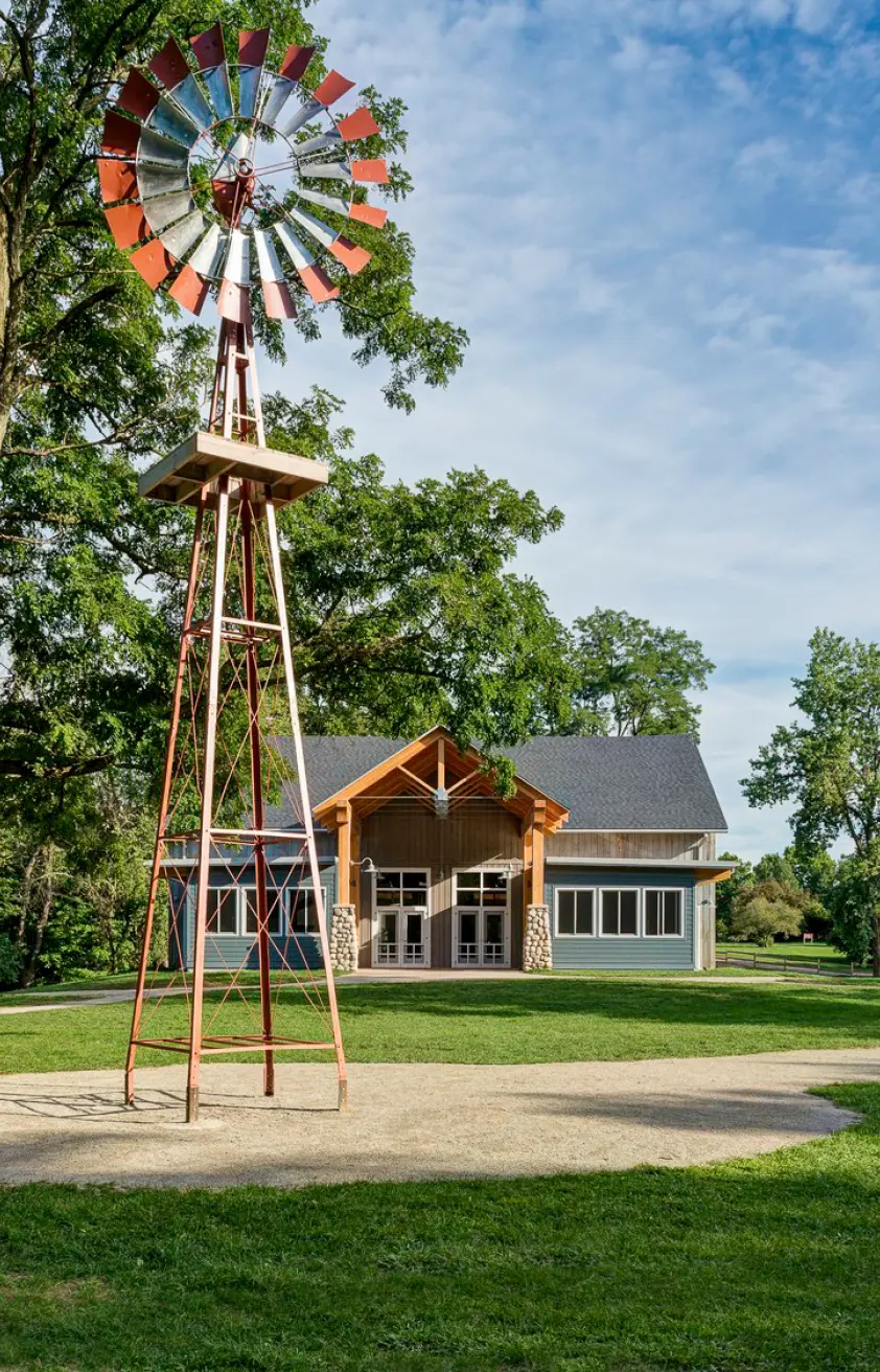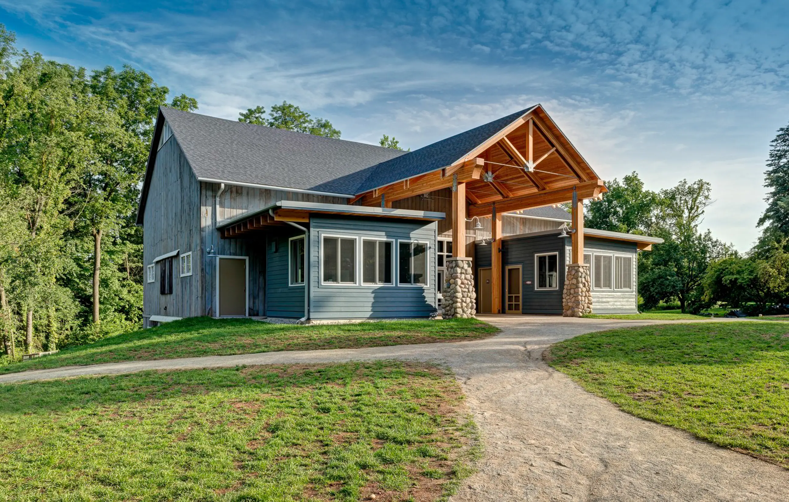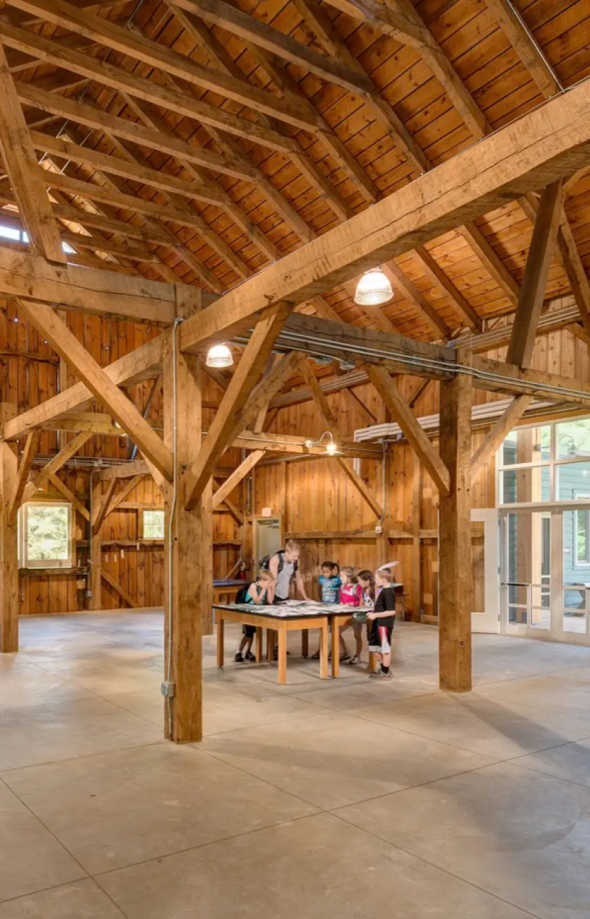 Lord Aeck Sargent, in collaboration with Byce & Associates and Johnson Hill Land Ethics Studio, contributed to the redesign of the Kalamazoo Nature Center’s (KNC) Camp facilities, emphasizing the integration of sustainable design with educational purposes. The project involved the creation of several new structures including a gate house, entry drive, camp program center, open-air amphitheater, camp pavilions, and a variety of outdoor play elements like a treehouse and a zip line canopy tour. This design allowed for an immersive experience in nature while also utilizing sustainable design strategies such as rainwater harvesting for irrigation, vegetated roofing, and site-harvested materials. The new facilities enhance the KNC Camp's mission to connect children with nature through hands-on experiences, ensuring that the built environment supports environmental education in a setting that encourages both exploration and play. The rehabilitated structures, such as the Timber-Frame Barn, incorporate green design strategies like natural cross-ventilation and recycled materials, ensuring a minimal environmental footprint while offering durable, functional spaces for educational activities.