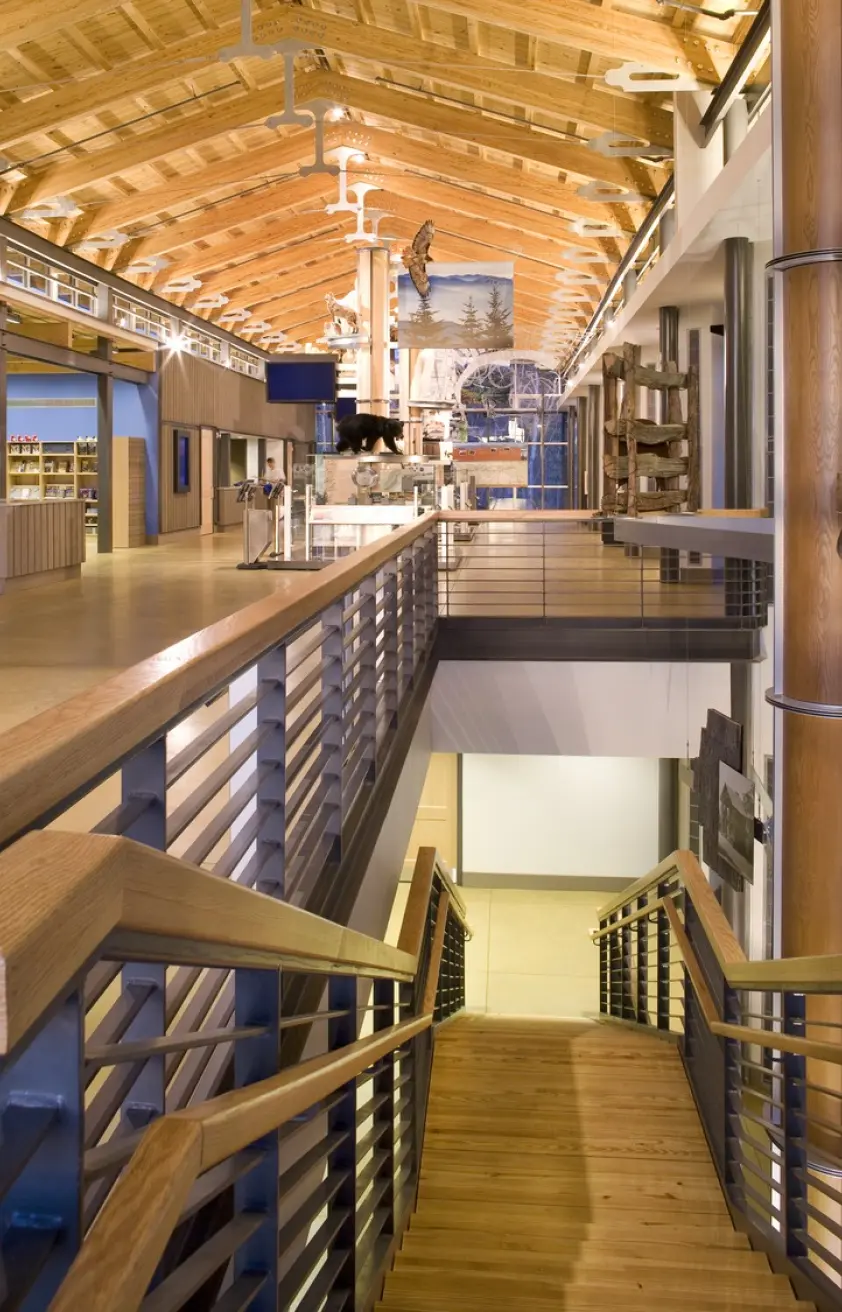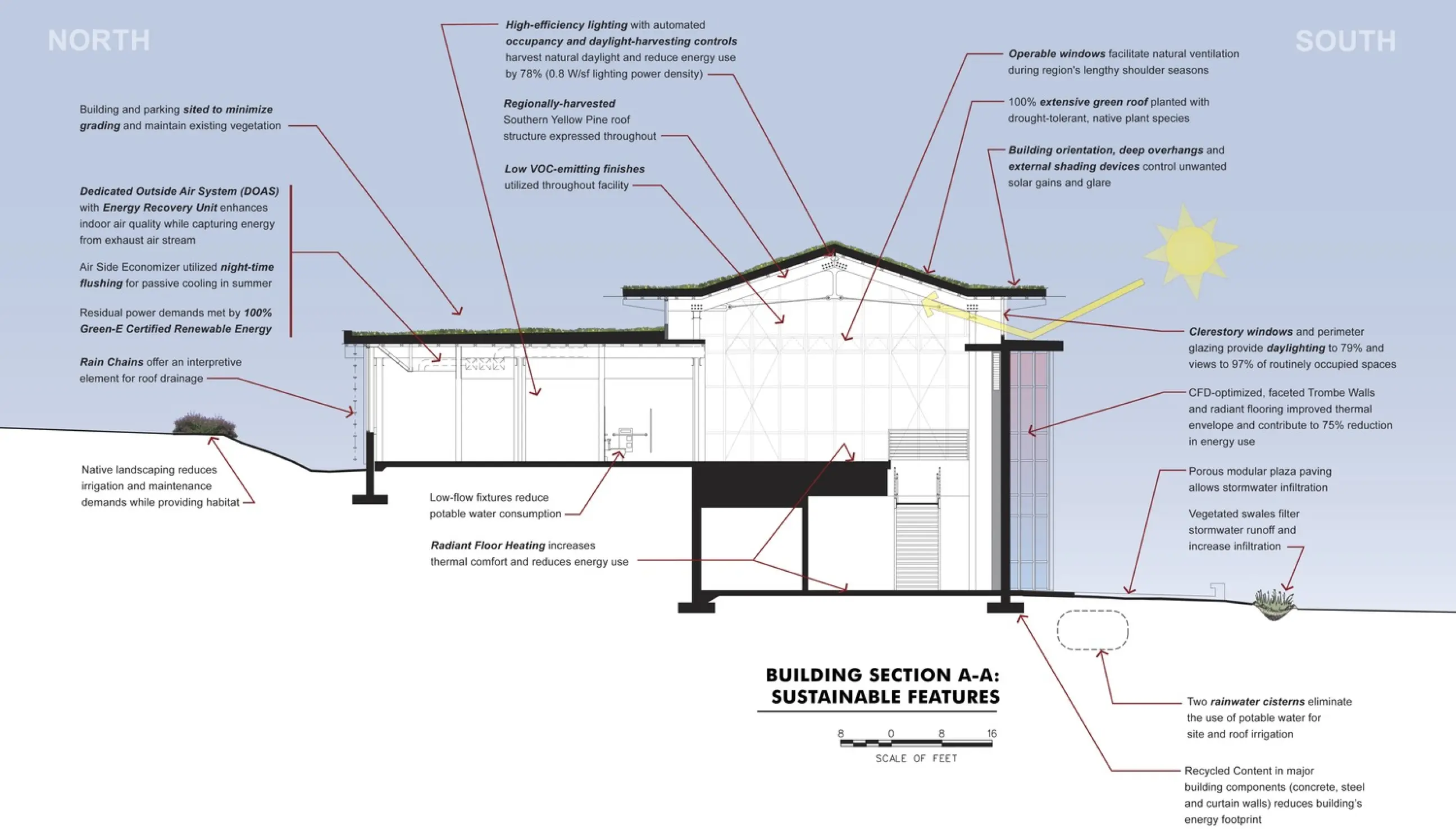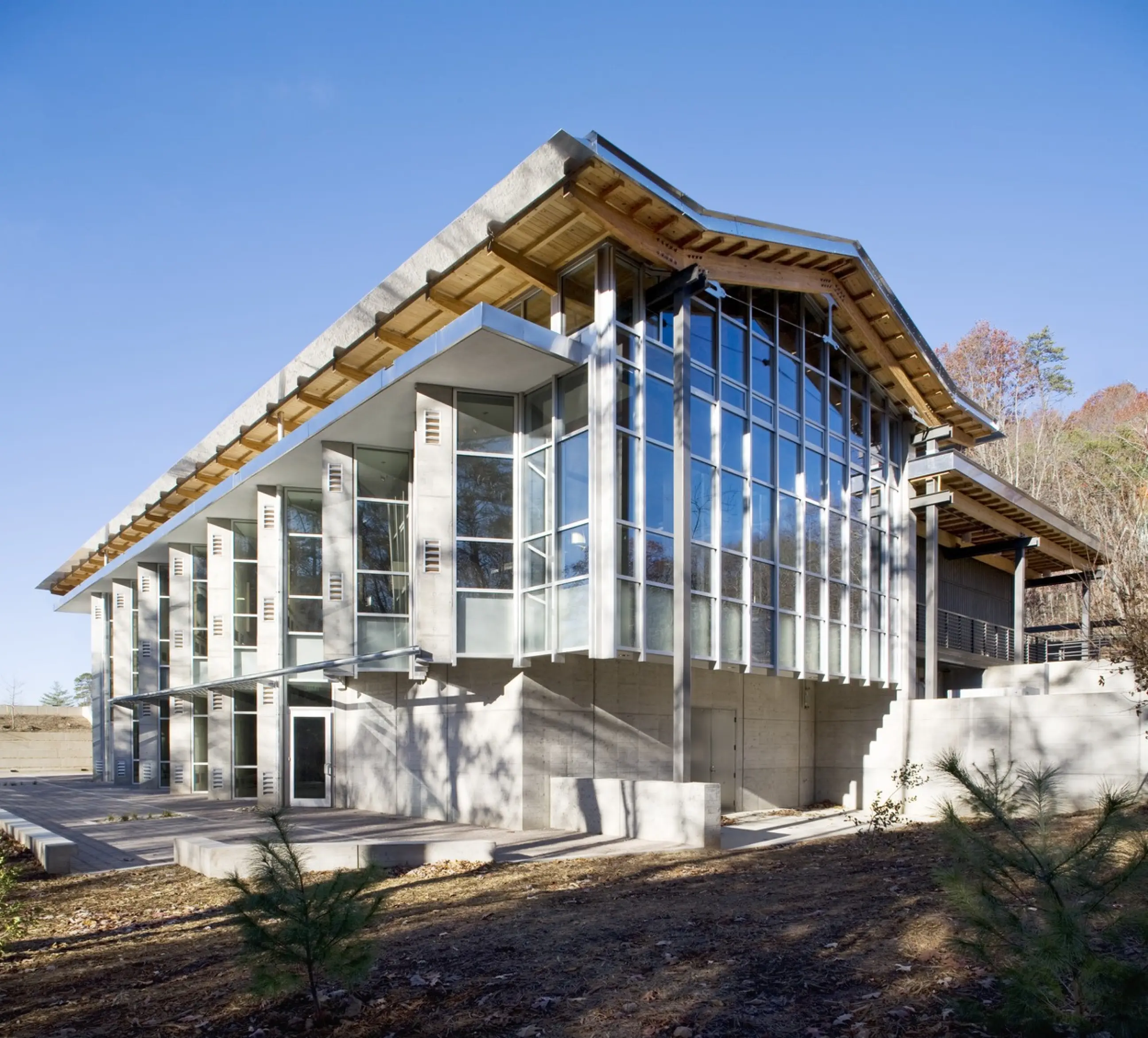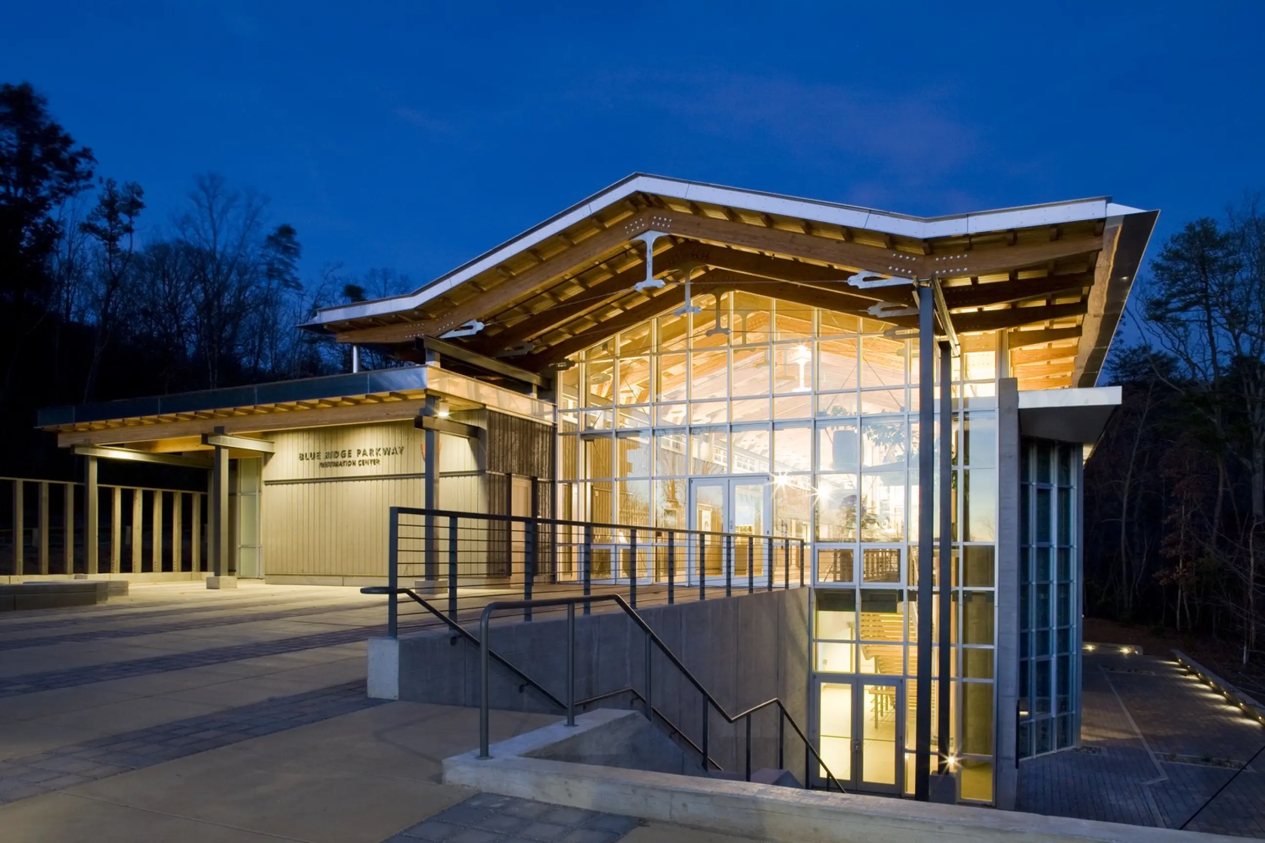 The Blue Ridge Parkway Visitor Center, designed in collaboration with the National Park Service, exemplifies a sustainable approach that integrates innovative ecological and architectural strategies within its unique mountainous setting. The two-story structure, carefully nestled into the hillside to minimize site disturbance, features a green roof, Trombe walls, and passive solar strategies to harmonize with the surrounding landscape and reduce environmental impact. The design optimizes building performance using computational fluid dynamics, thermal analysis, and daylight modeling to enhance energy efficiency. The facility’s passive solar Trombe walls, vented for seasonal climate control, contribute to natural ventilation and thermal comfort, while horizontal shades and clerestories facilitate daylight harvesting. The green roof, planted with native species, serves as a functional element in stormwater management, alongside bio-retention areas that filter runoff. The project further mitigates ecological impact by utilizing sustainable materials with low embodied energy, and incorporating recycled content in construction. A 100% garden roof and minimal parking expansion exemplify a commitment to preserving the site’s natural ecosystems, fostering habitats for native wildlife. The result is a LEED Gold-certified facility that showcases sustainable design principles in a regionally sensitive, modern vernacular form, reflective of the area’s cultural and environmental heritage.