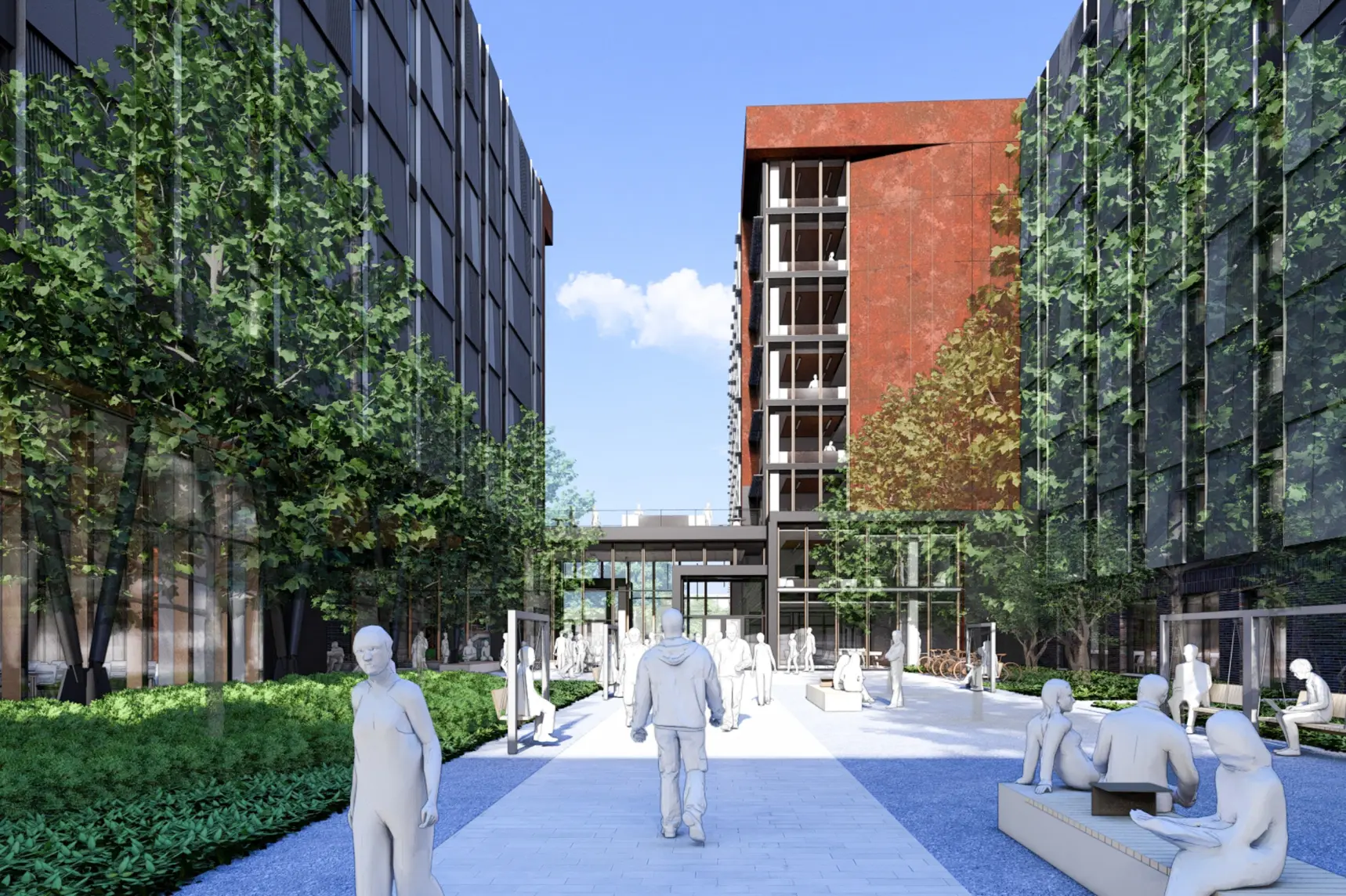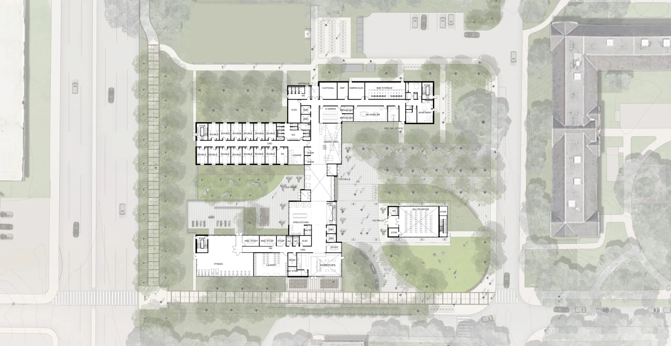 The Georgia Tech First Year Residence Hall, located on Curran Street, is designed to accommodate 862 beds with a focus on community engagement. The program features communal indoor and outdoor spaces including a “front porch” area for relaxation and connection to the campus ecosystem, while ensuring resident safety and future connections to the Westside neighborhood of Atlanta.