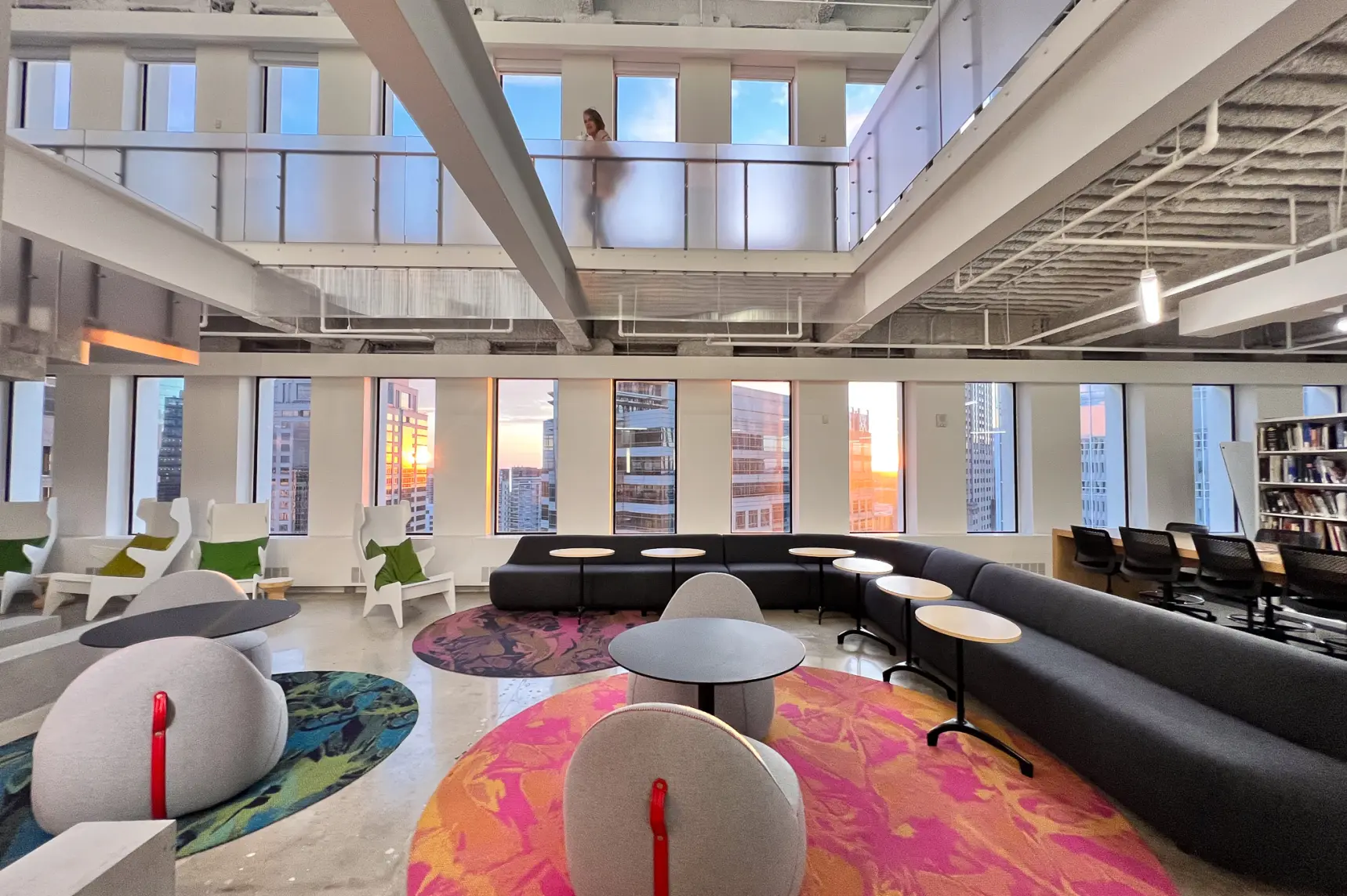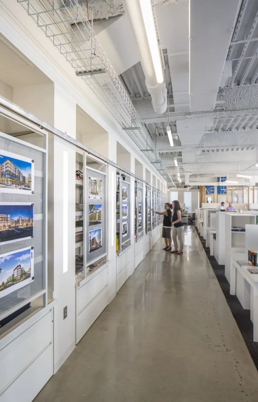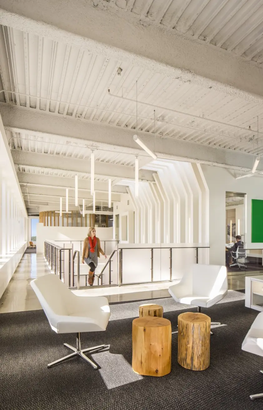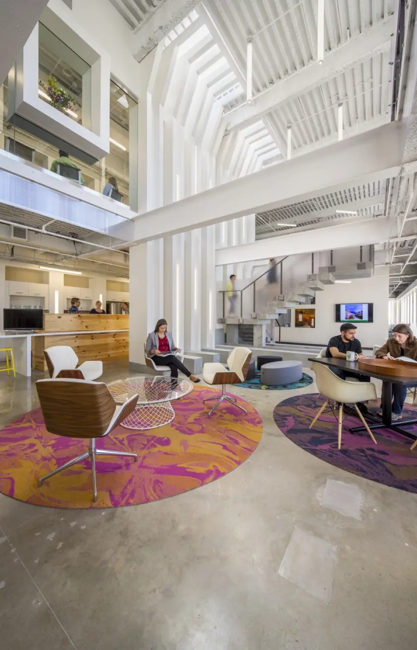The relocation of the architectural firm's office to the top two floors of a 1970s-era building in Colony Square was approached with sustainability at the forefront. The project integrates various environmentally conscious strategies, including LED fixtures with daylight harvesting, reducing the lighting power density by 53%, and maximizing natural daylight. The design features flexible workspaces and open office layouts, with a focus on promoting movement and collaboration through a monumental stair connecting the two floors. To encourage alternative transportation, the office includes bicycle storage and showers, supporting low-carbon commuting options. Water-saving fixtures, such as low-flow toilets and pressure-reducing valves, achieve a 41% water reduction. Materials were thoughtfully chosen, with many reclaimed from the previous office, and 28% of new materials sourced regionally. The design also minimizes energy consumption by incorporating EnergyStar-rated appliances and efficient HVAC systems.