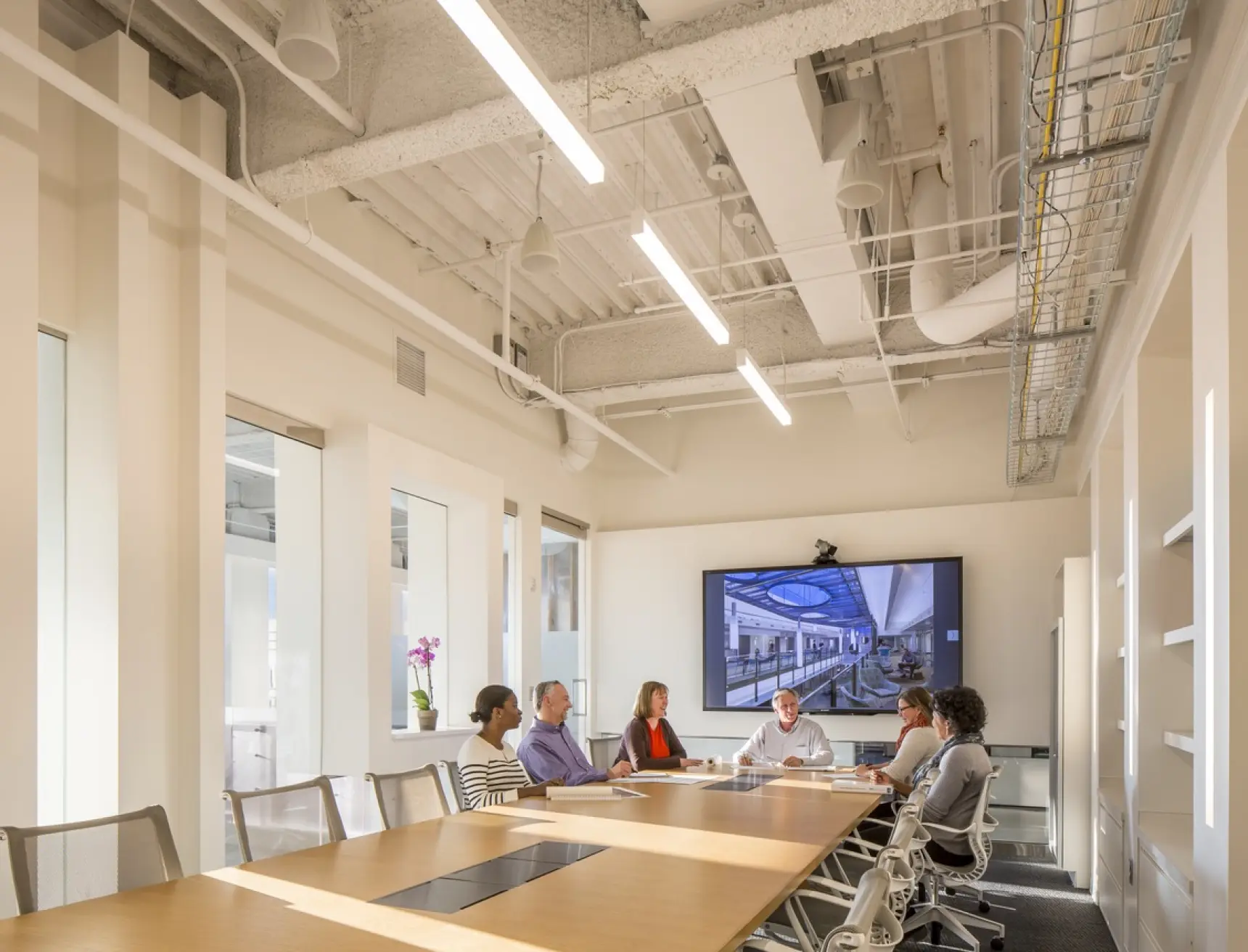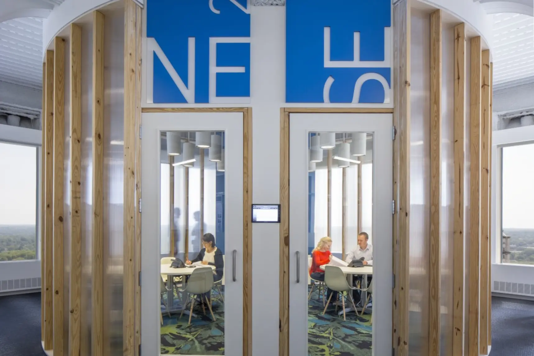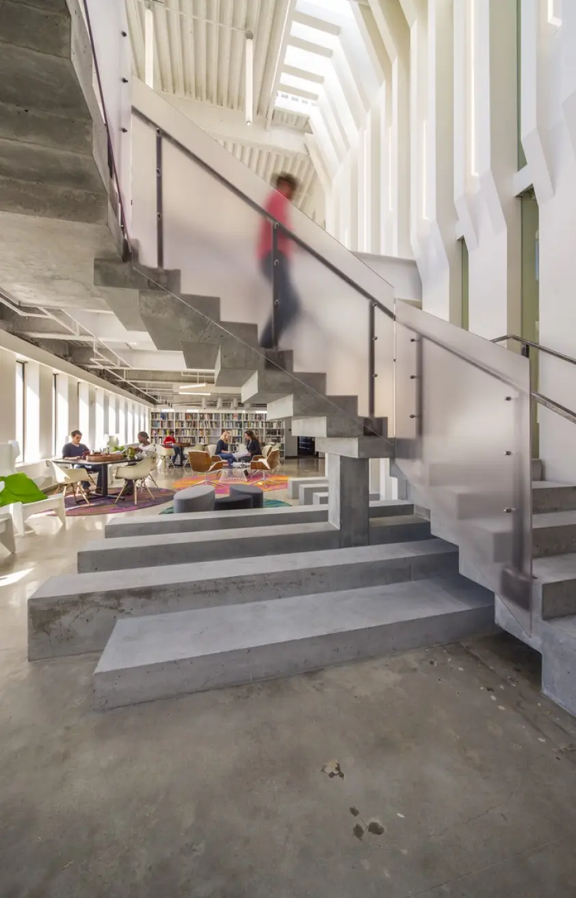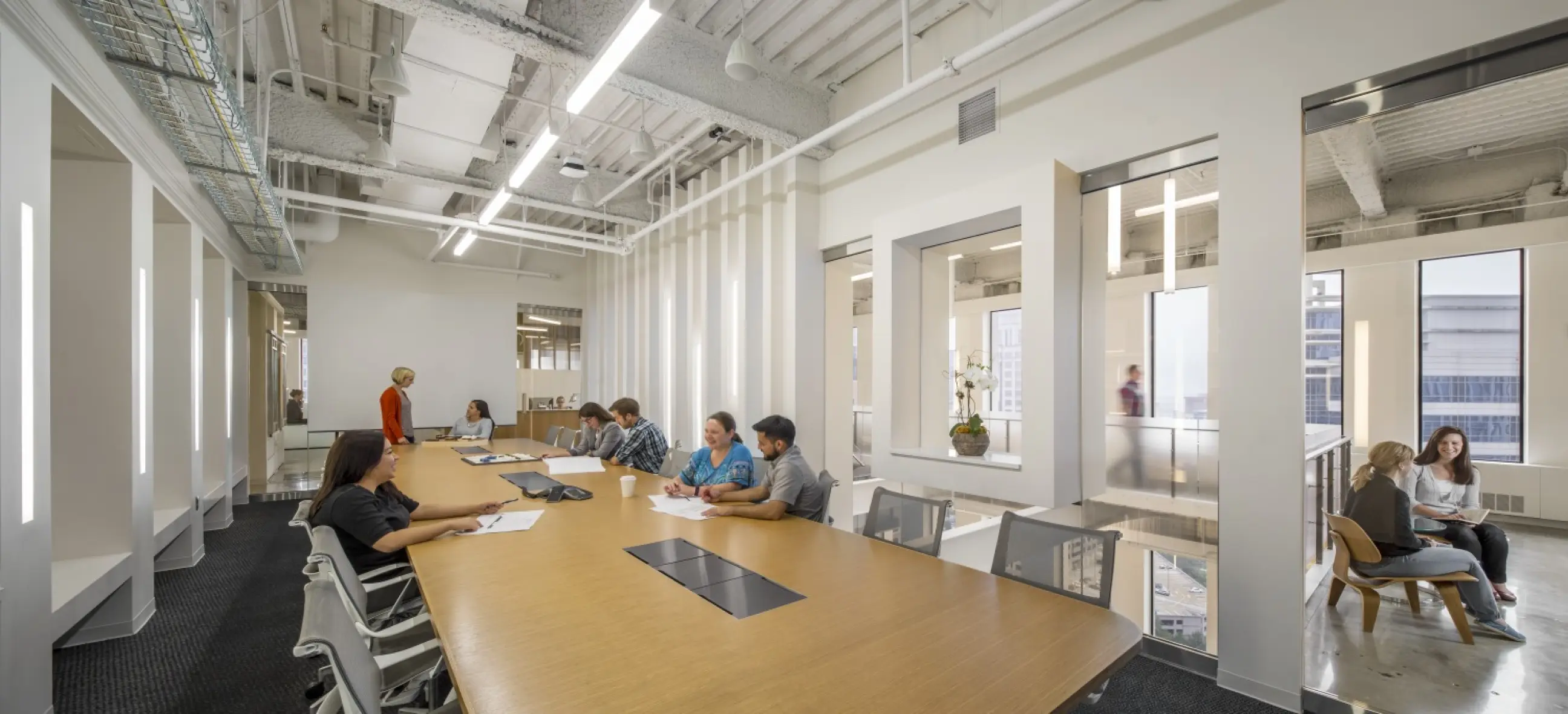 The relocation of the architectural firm's office to the top two floors of a 1970s-era building in Colony Square was approached with sustainability at the forefront. The project integrates various environmentally conscious strategies, including LED fixtures with daylight harvesting, reducing the lighting power density by 53%, and maximizing natural daylight. The design features flexible workspaces and open office layouts, with a focus on promoting movement and collaboration through a monumental stair connecting the two floors. To encourage alternative transportation, the office includes bicycle storage and showers, supporting low-carbon commuting options. Water-saving fixtures, such as low-flow toilets and pressure-reducing valves, achieve a 41% water reduction. Materials were thoughtfully chosen, with many reclaimed from the previous office, and 28% of new materials sourced regionally. The design also minimizes energy consumption by incorporating EnergyStar-rated appliances and efficient HVAC systems.