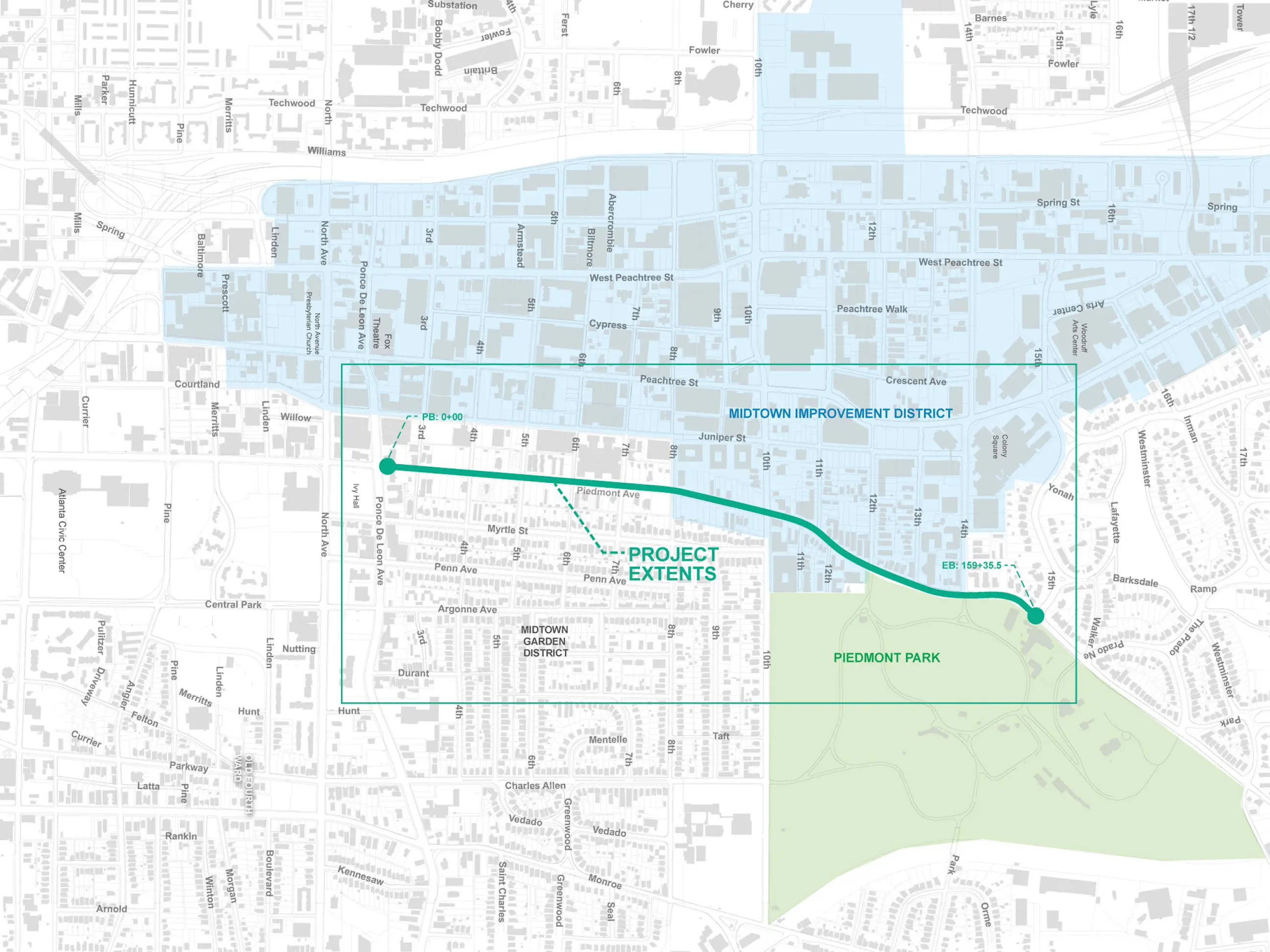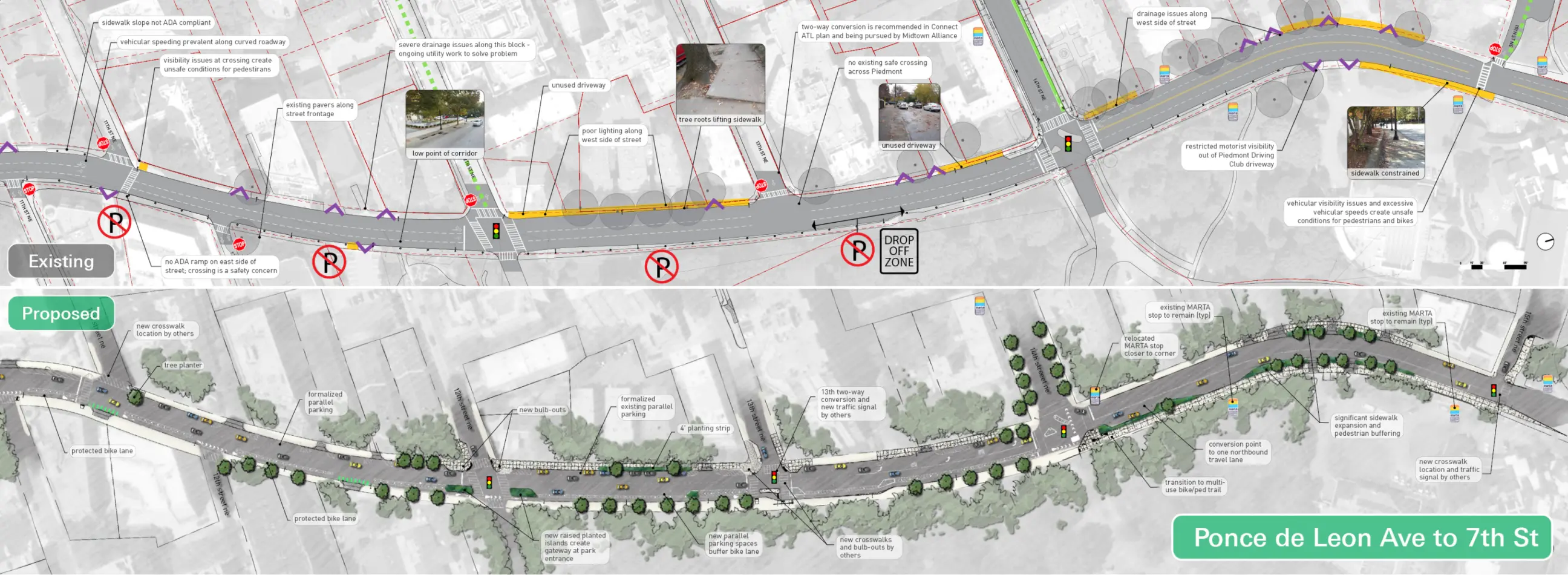 Lord Aeck Sargent, in collaboration with Midtown Alliance and Renew Atlanta, spearheaded the redesign of a 1.1-mile corridor of Piedmont Avenue, a crucial north-south artery linking Atlanta’s Downtown, Midtown, and Buckhead areas. Partnering with Kimley-Horn on transportation strategy, the firm led an in-depth analysis of the corridor's safety issues, underutilized spaces, and ADA non-compliance, which informed the design of comprehensive "complete street" solutions. The concept prioritized pedestrian and cyclist safety by integrating a northbound protected bike lane aligned with five existing routes, reducing vehicular speeds through targeted traffic-calming measures, and formalizing on-street parking to enhance accessibility. Pedestrian connectivity and ADA accessibility were addressed through improved crosswalks, multi-use pathways, and curb ramps, while stormwater planters were strategically incorporated to mitigate runoff impact. Through a collaborative public engagement process, Lord Aeck Sargent’s landscape strategy set a foundation for transforming Piedmont Avenue into a more balanced, multi-modal urban environment.