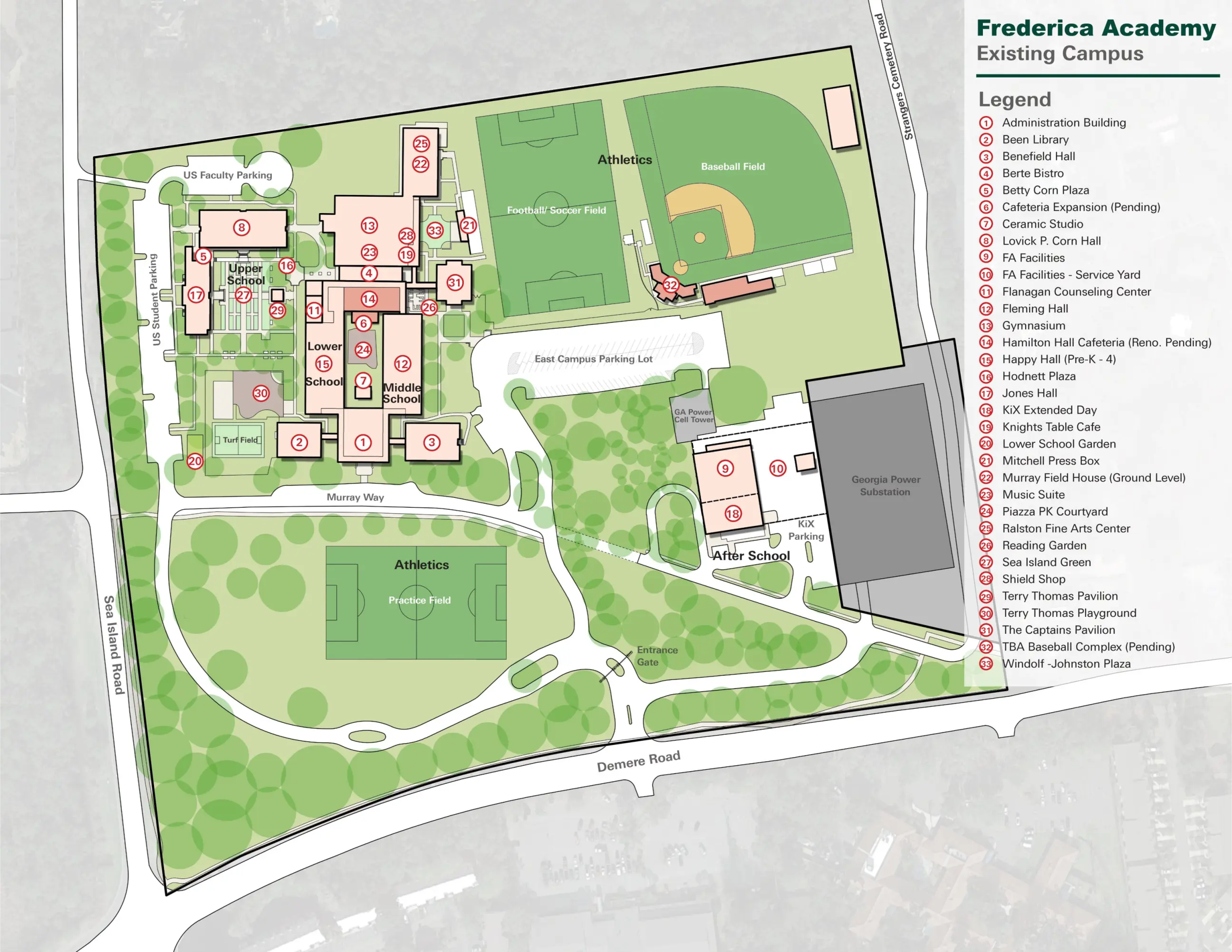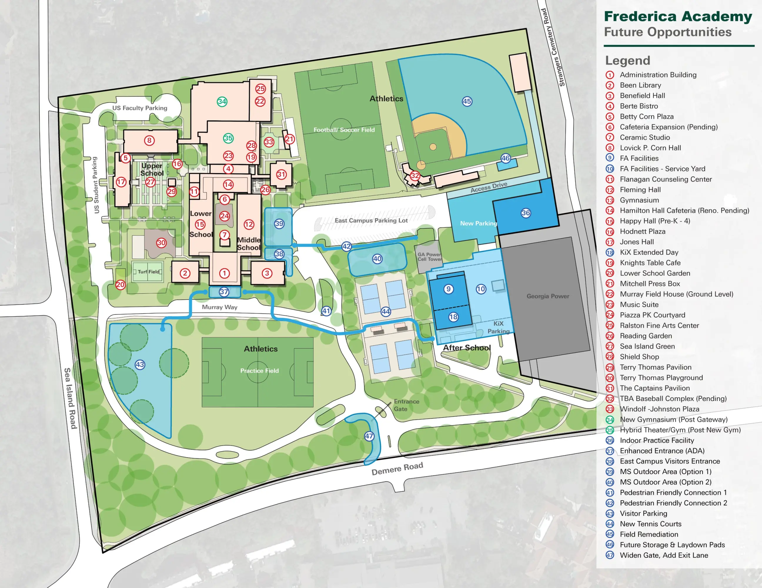 Lord Aeck Sargent collaborated with Frederica Academy to develop a forward-looking Campus Master Plan aimed at addressing the evolving needs of its growing academic and extracurricular programs. The plan integrates a phased approach, beginning with the construction of a second gymnasium to accommodate expanding athletic demands, alongside strategic evaluations of underutilized spaces, such as the former Georgia Power property. Key considerations include optimizing the use of outdoor areas for experiential learning and community engagement, incorporating modern, interactive classroom designs, and addressing deferred maintenance. The planning process emphasizes flexibility, enabling the school to adapt to emerging programmatic needs and community partnerships. This context-driven approach to master planning will ensure long-term functionality and alignment with Frederica Academy’s mission for growth and excellence.