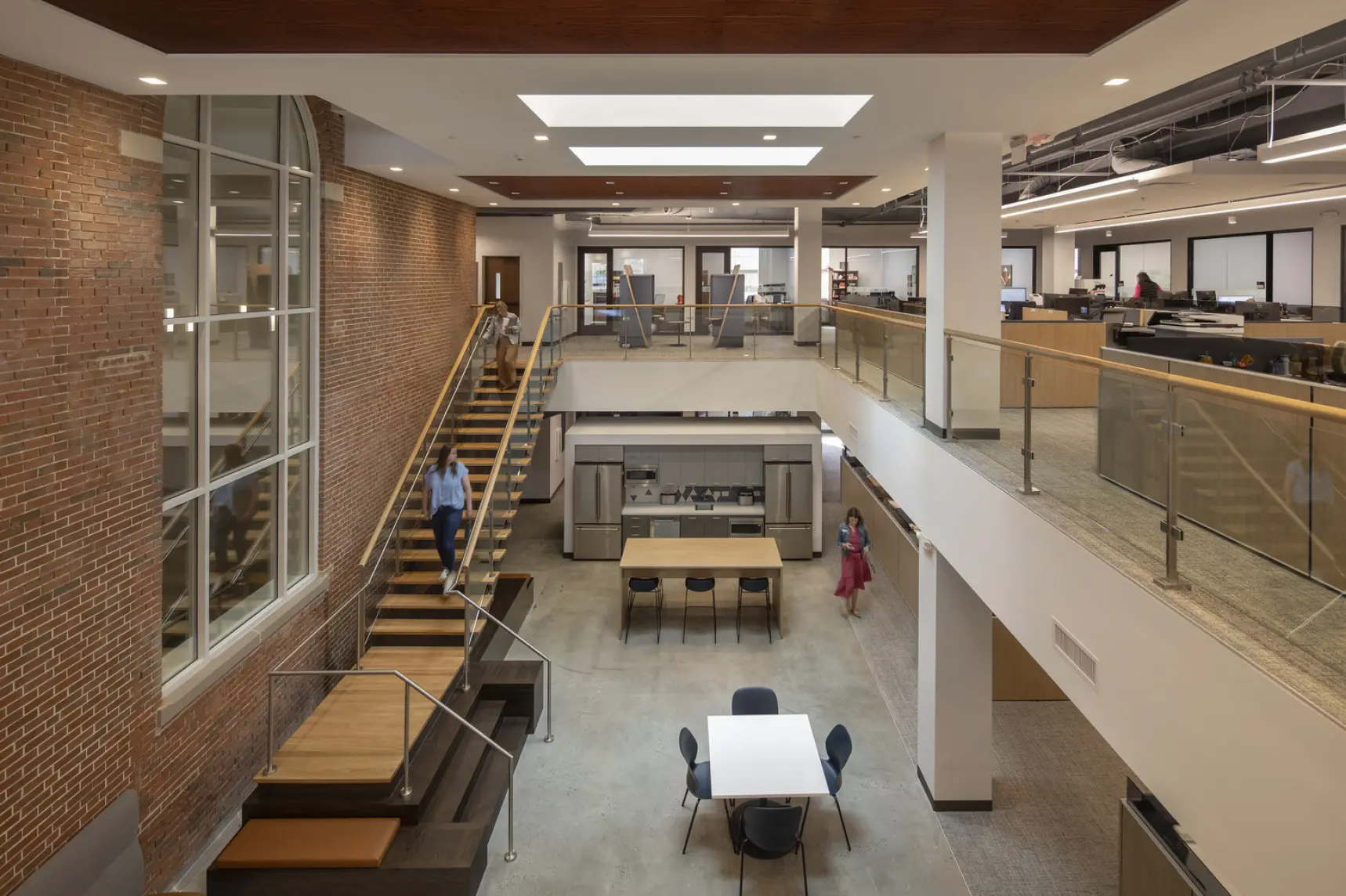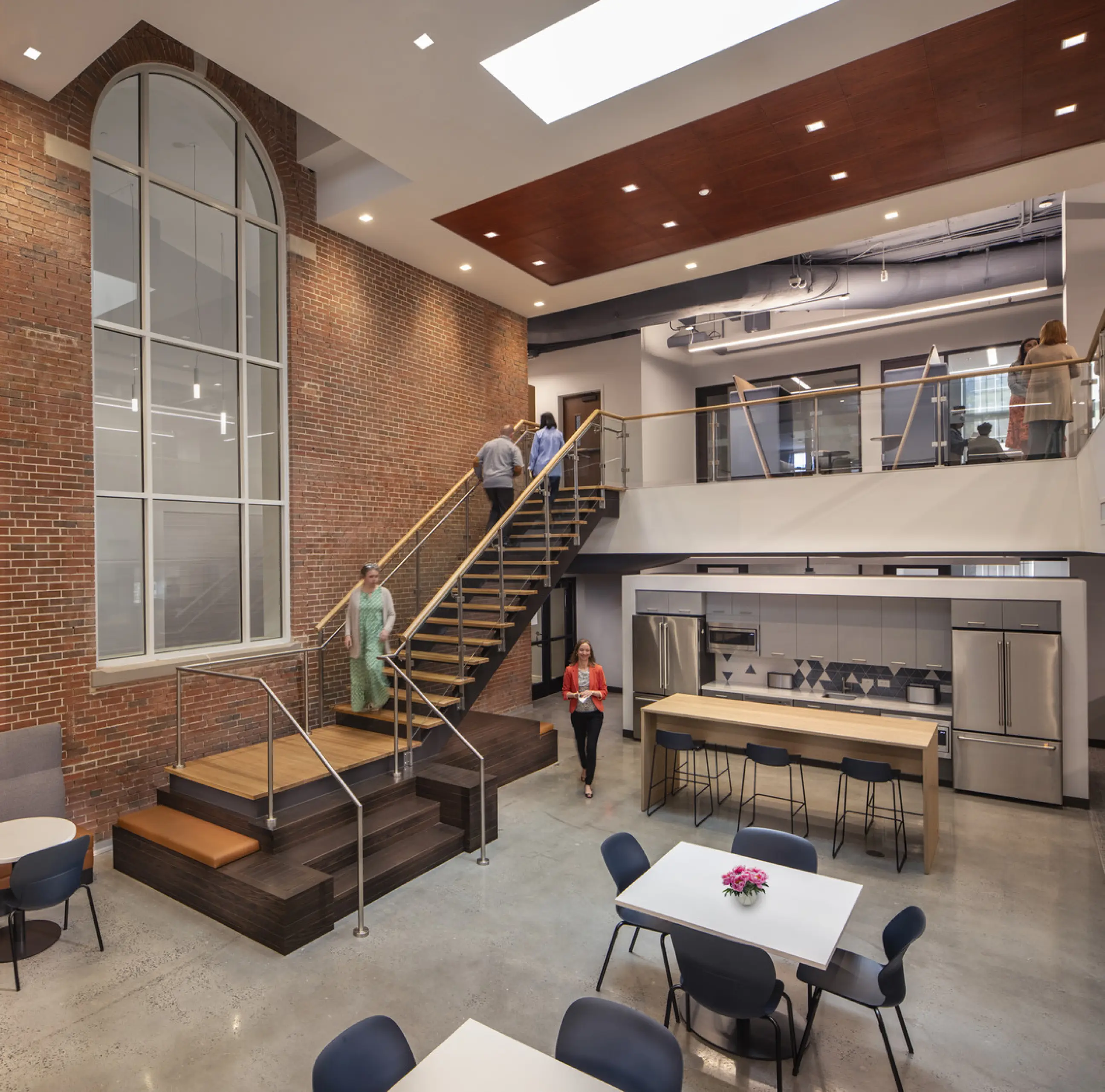 Church offices, previously spread across the campus, were consolidated into a single double-height space to promote collaboration among staff. Spaces for children and youth were renovated to meet programmatic needs, including larger spaces for various cohorts to gather for shared experiences located adjacent to smaller break-out rooms for small group discussion.
