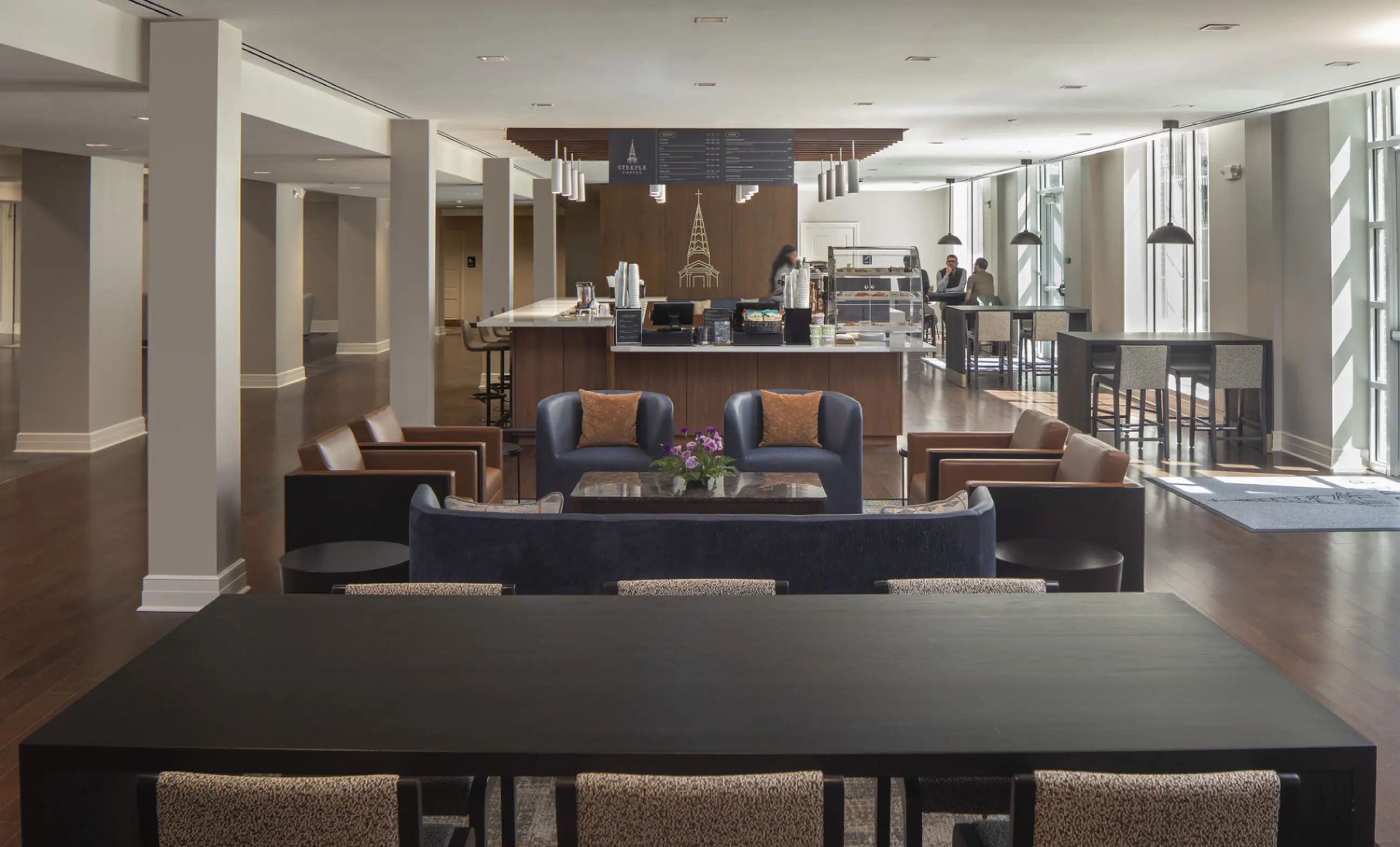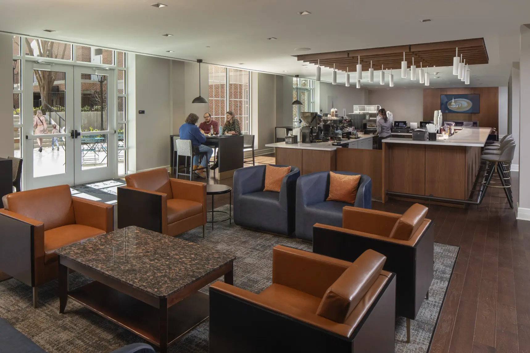 Improvements to communal gathering spaces included the renovation of the Fellowship Hall, with the addition of an operable partition to improve the flexibility of its use. The principal gathering space between services was expanded to include a small café that opens onto an open-air terrace. A vehicular turn-around was converted to a large campus greenspace to accommodate outdoor gatherings.