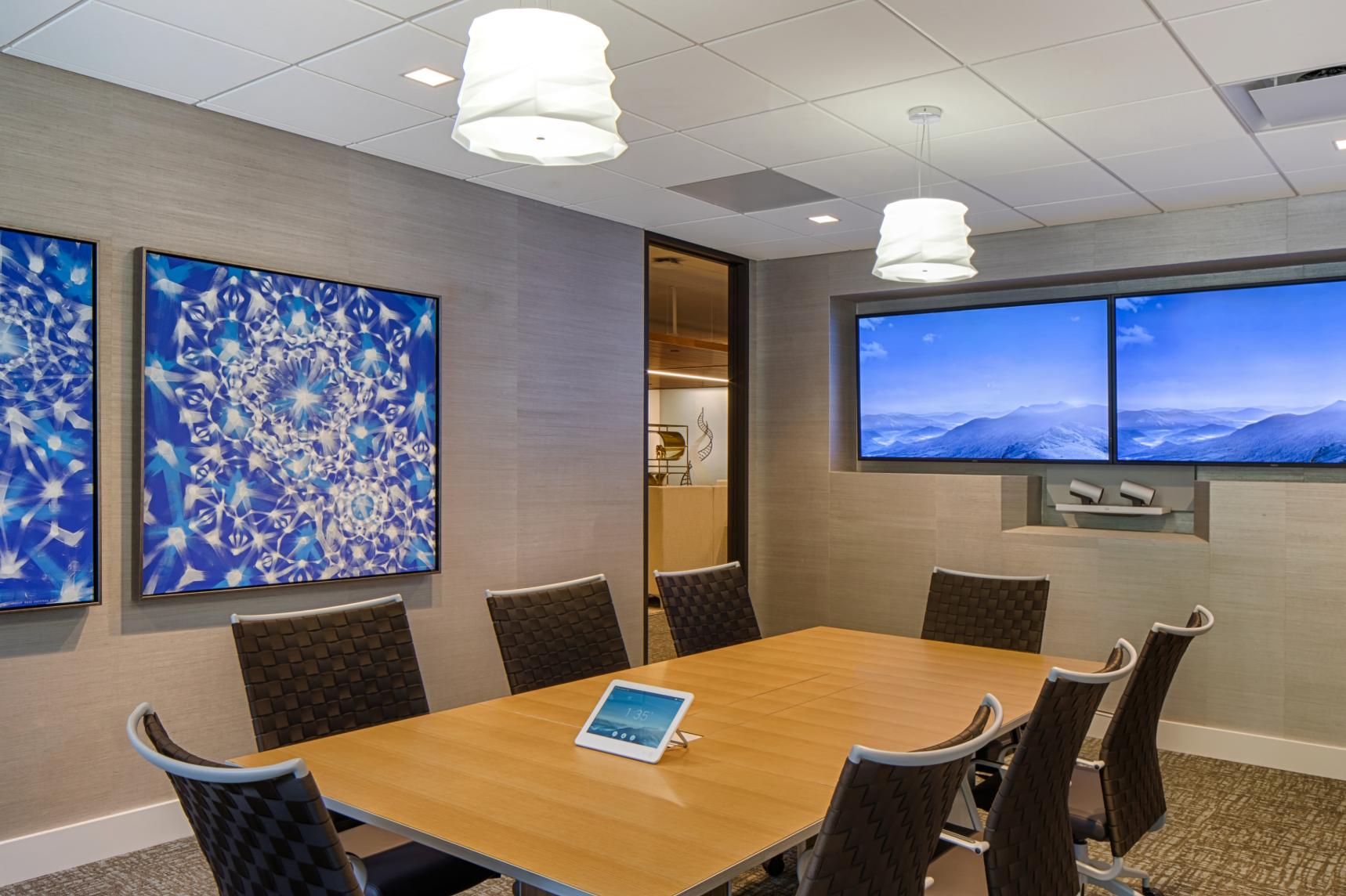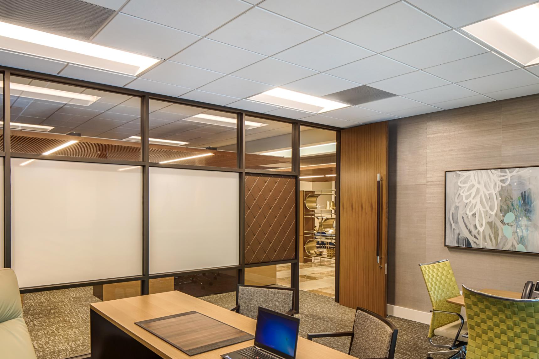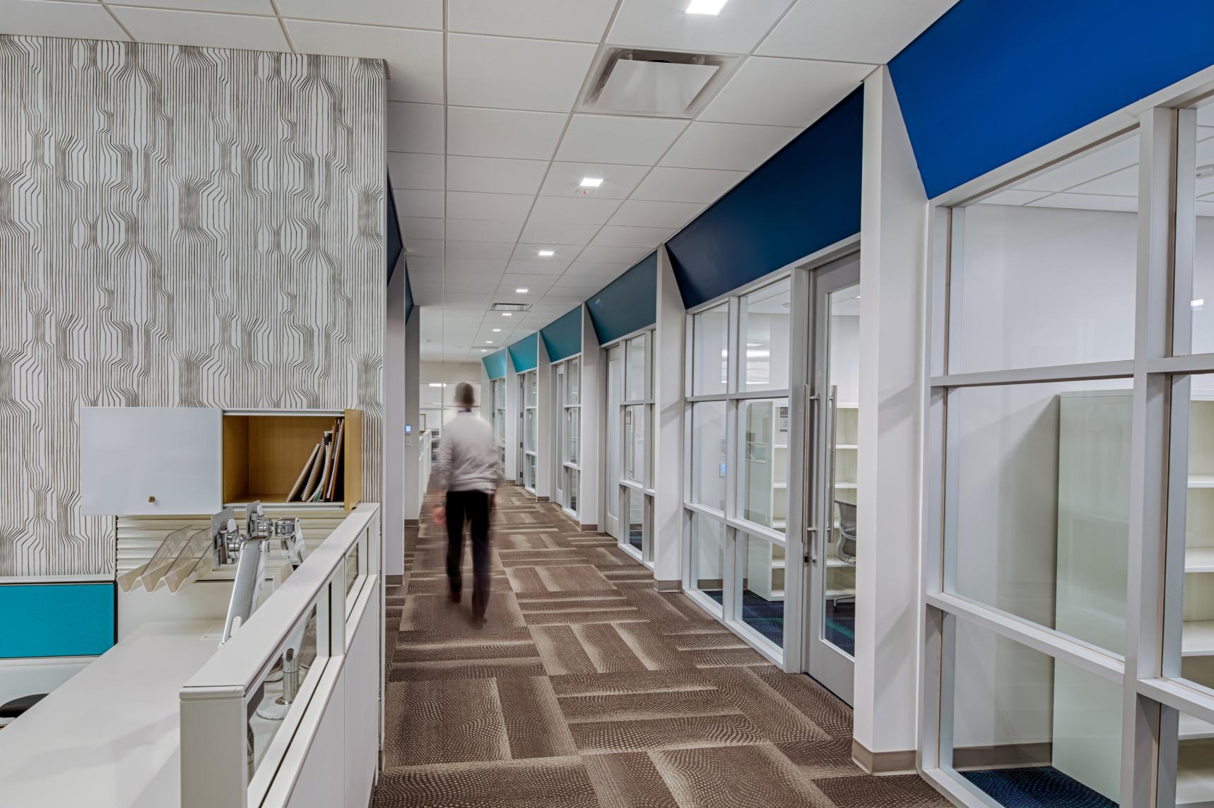 The Perimeter Park management office was envisioned as a dynamic and collaborative hub that reflects the corporate brand and fosters employee engagement. With an open office layout, workstations are centrally placed, surrounded by private offices behind curving glass walls. A spacious communal hub with food service and informal seating areas serves as the heart of the office, promoting casual interactions and collaborative meetings. The design merges contemporary workplace trends with inviting elements, such as drum-like light fixtures that add warmth and intimacy. Anodized aluminum storefront systems at office fronts impart a sleek, high-tech aesthetic, enhanced by gradating accent colors above each office, creating visual intrigue. This office space caters to current workforce needs and aims to attract and retain top talent by providing a modern, comfortable environment. The thoughtful integration of anodized aluminum accents and strategically placed lighting fixtures ensures that the space is both functional and aesthetically pleasing. This project exemplifies how innovative design can transform an office into a vibrant, collaborative space that aligns with a company's values and enhances employee satisfaction.