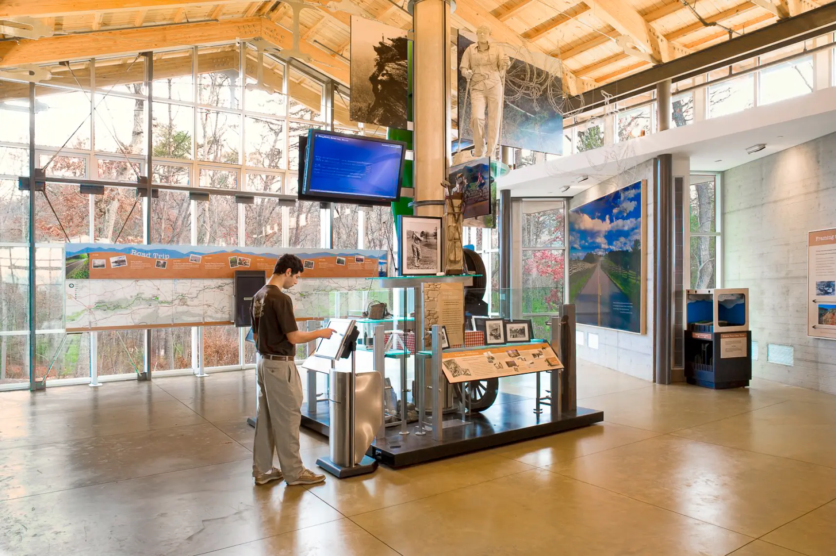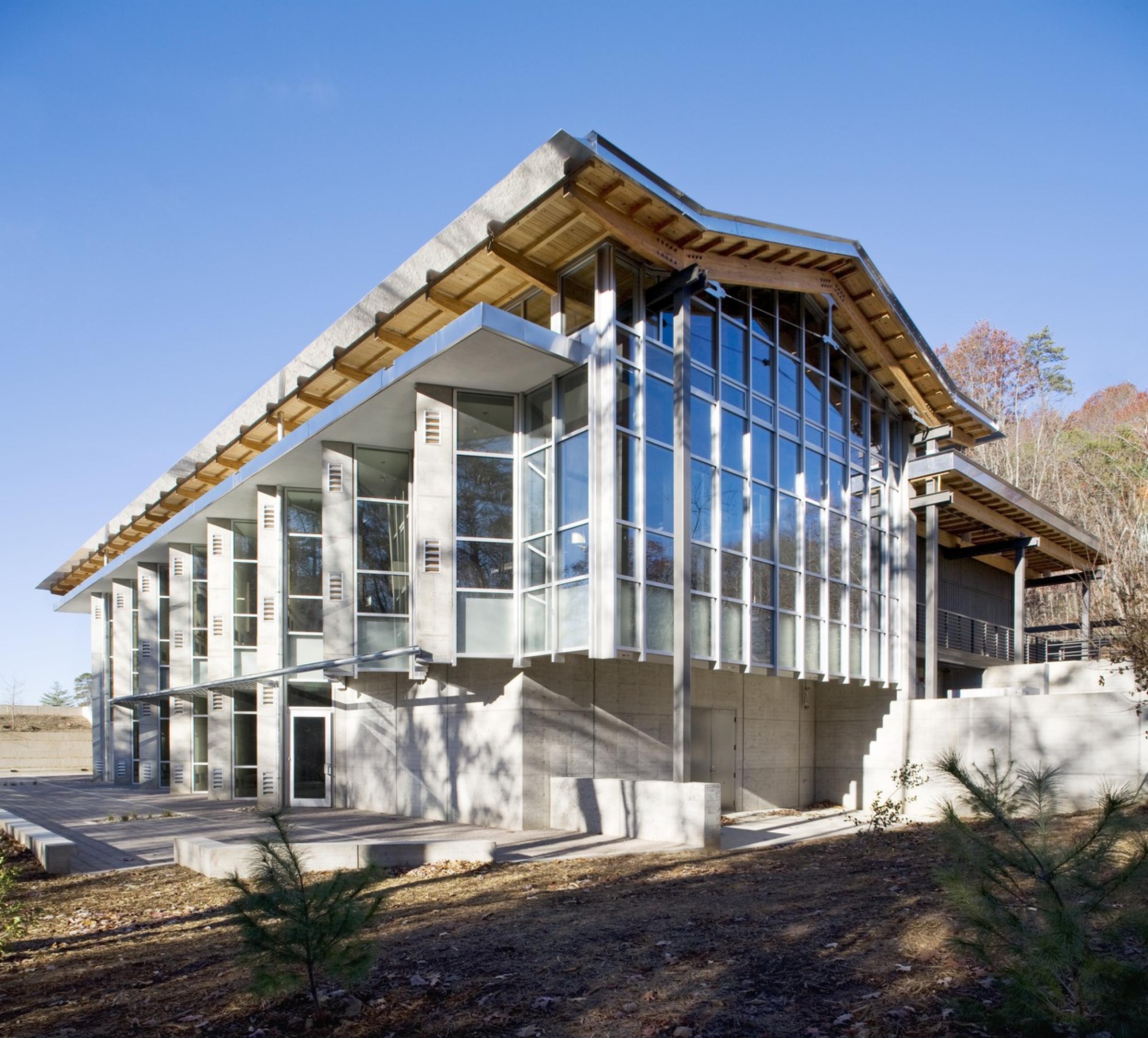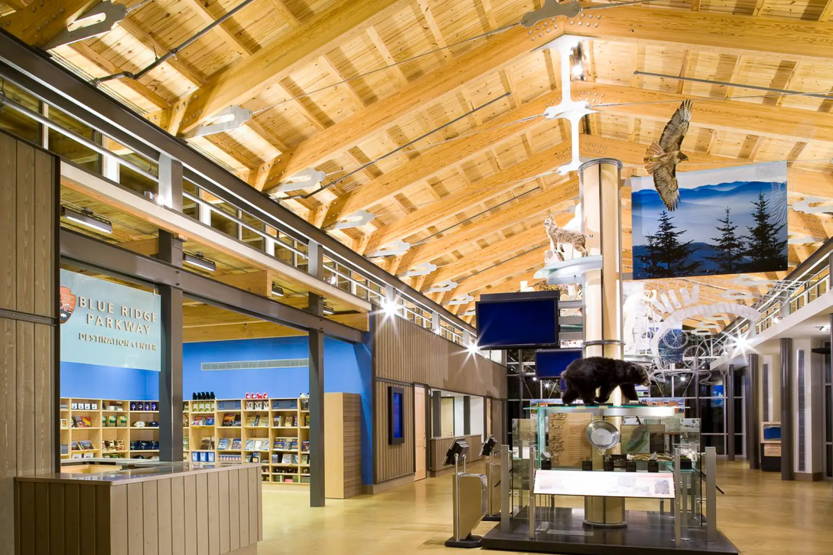 The Blue Ridge Parkway Visitor Center, designed in collaboration with the National Park Service, exemplifies a sustainable approach that integrates innovative ecological and architectural strategies within its unique mountainous setting. The two-story structure, carefully nestled into the hillside to minimize site disturbance, features a green roof, Trombe walls, and passive solar strategies to harmonize with the surrounding landscape and reduce environmental impact. The design optimizes building performance using computational fluid dynamics, thermal analysis, and daylight modeling to enhance energy efficiency. The facility’s passive solar Trombe walls, vented for seasonal climate control, contribute to natural ventilation and thermal comfort, while horizontal shades and clerestories facilitate daylight harvesting. The green roof, planted with native species, serves as a functional element in stormwater management, alongside bio-retention areas that filter runoff. The project further mitigates ecological impact by utilizing sustainable materials with low embodied energy, and incorporating recycled content in construction. A 100% garden roof and minimal parking expansion exemplify a commitment to preserving the site’s natural ecosystems, fostering habitats for native wildlife. The result is a LEED Gold-certified facility that showcases sustainable design principles in a regionally sensitive, modern vernacular form, reflective of the area’s cultural and environmental heritage.