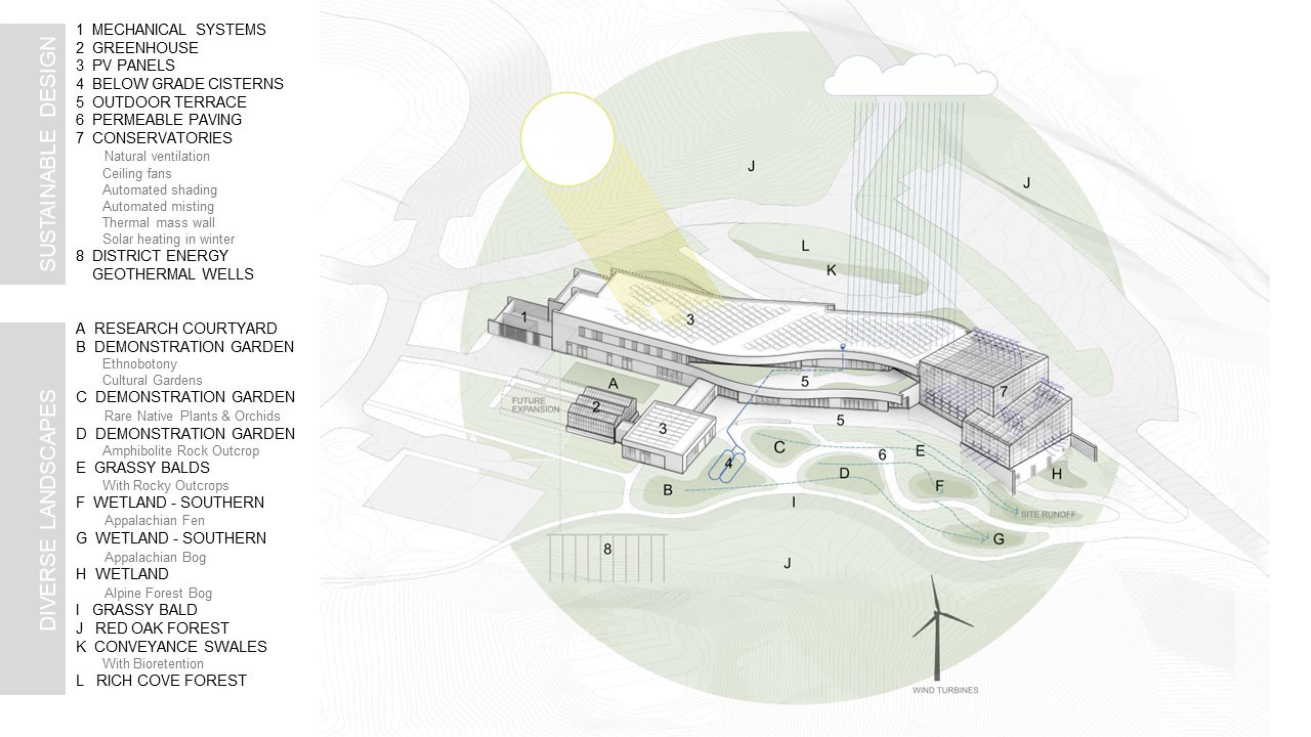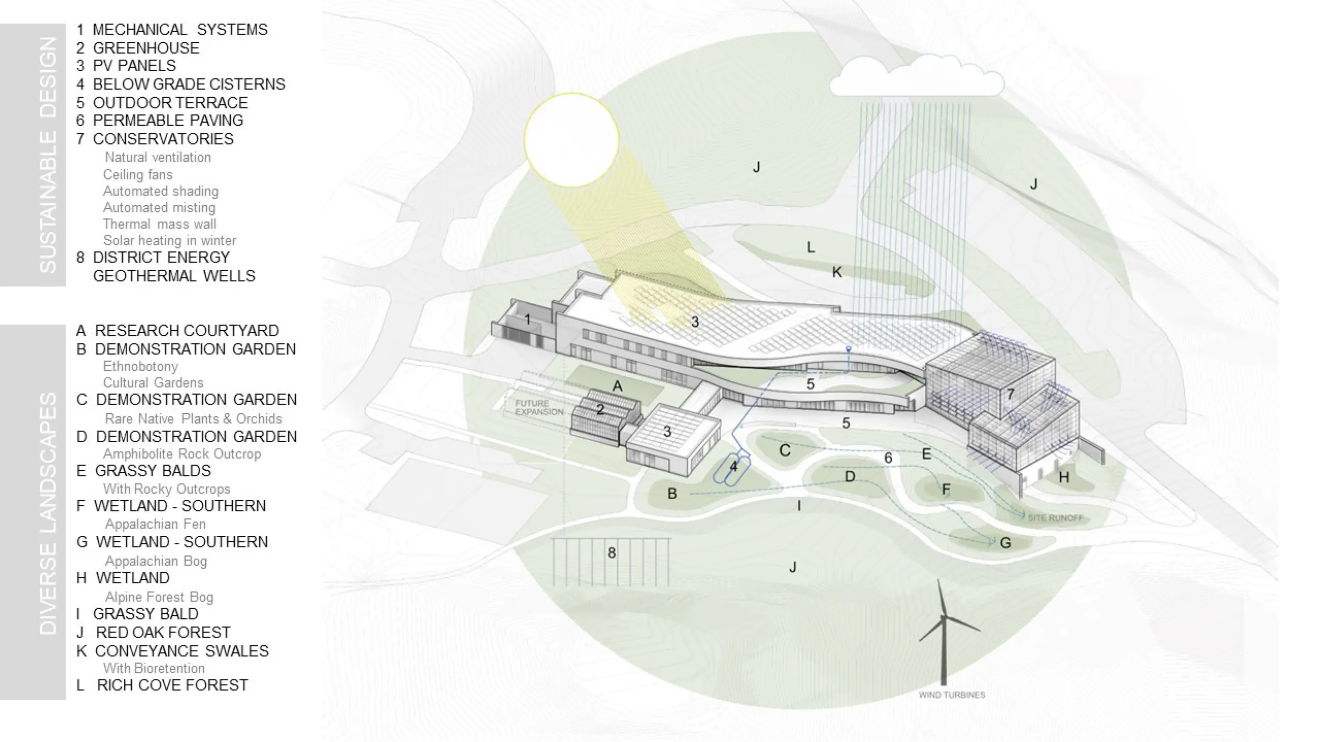 The Appalachian State University Innovation District master plan focused on the creation of a 28-acre learning district involving the synthesis of three main components: Buildings—including housing and three research and academic buildings; Energy—a district wide energy system with over 500 geothermal wells, 4 wind turbines, and a central energy plant; and, Site—the unifying element for the district consisting of performative native landscapes that will accent ASU’s “Campus in a Forest” identity and connect the district as a whole. Given the spatial constraints of the site and the spatial needs of these elements, a key element to this plan was an implementation framework that accounts for the synergies between these elements to allow for a holistic realization of the vision.
