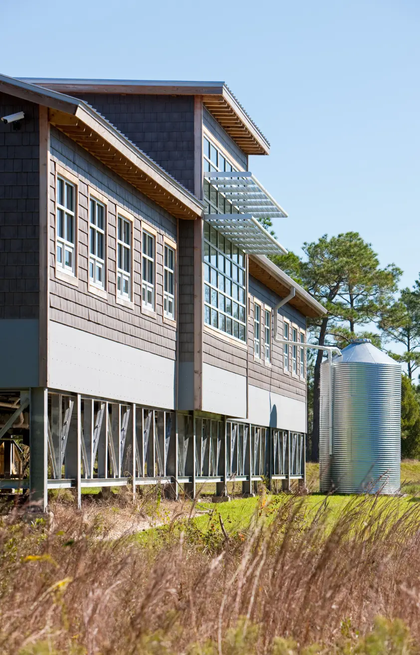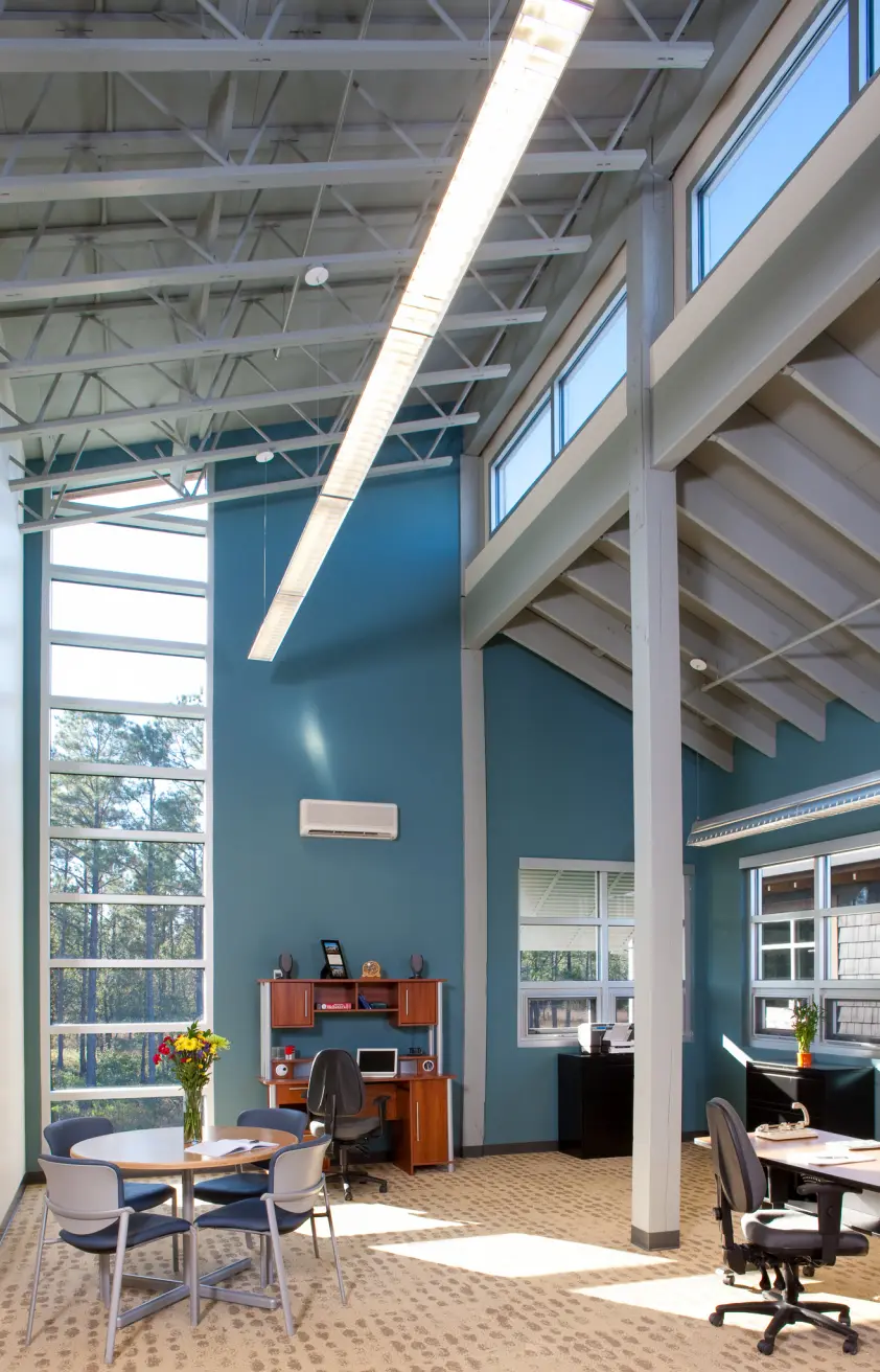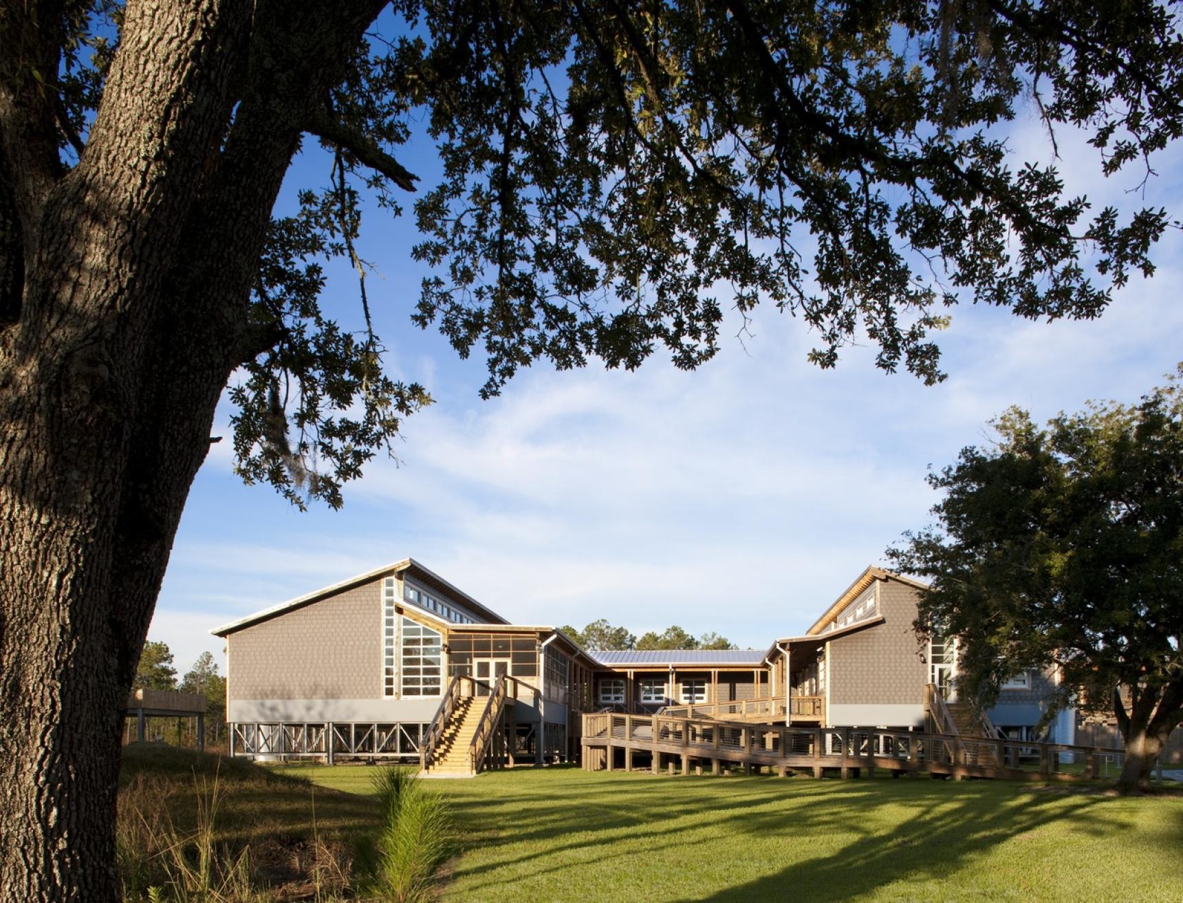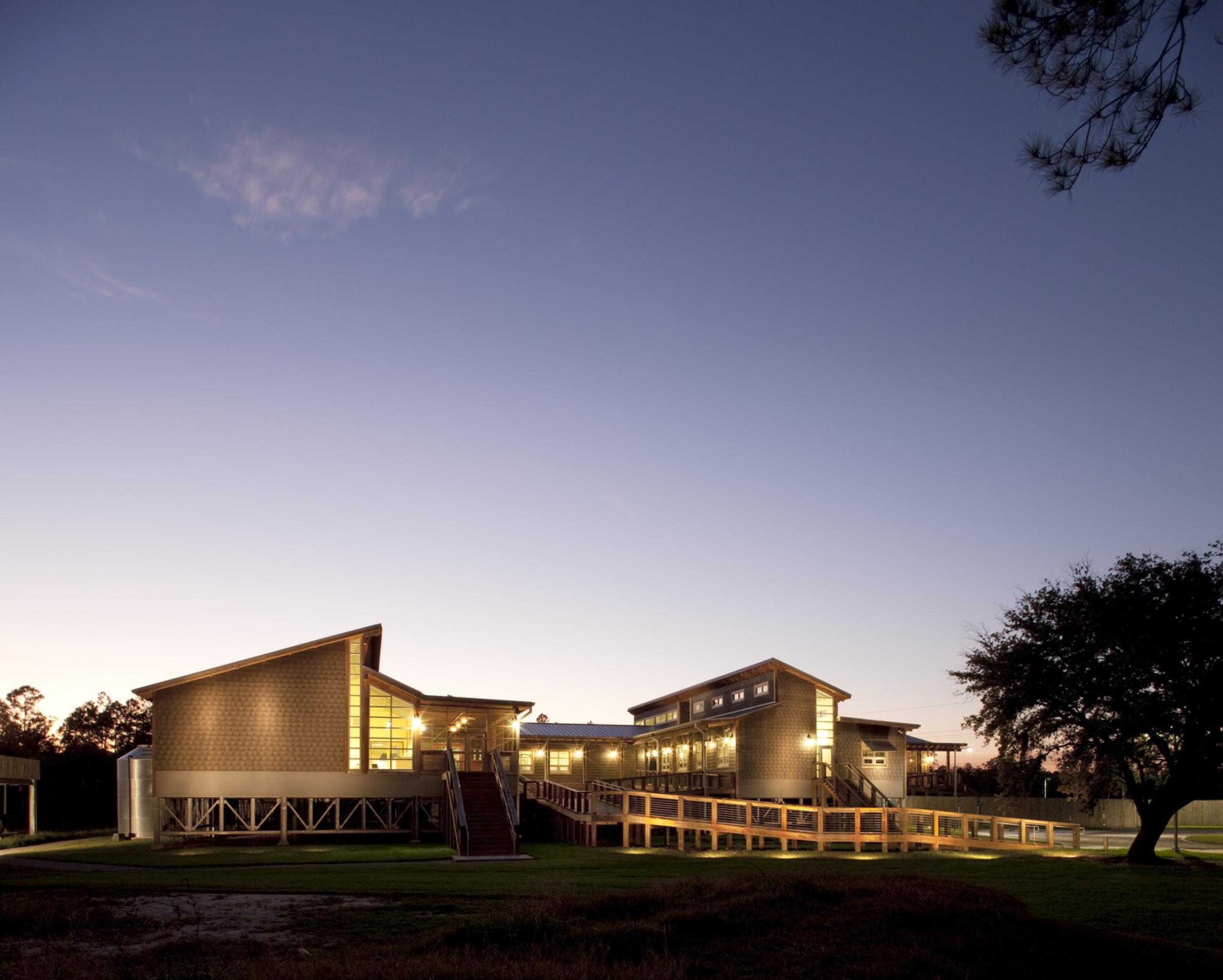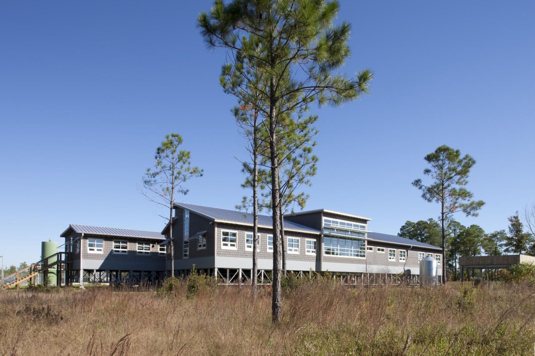 The Grand Bay National Estuarine Research Reserve (Grand Bay NERR) Coastal Resources Center is a sustainable facility that supports the research and preservation of the sensitive estuarine and pine savanna ecosystems along the Mississippi Gulf Coast. The project integrates various sustainable features to minimize environmental impact and enhance resilience in its hurricane-prone, remote location. Key strategies include extensive daylighting, operable windows for passive ventilation, and a wastewater treatment system with biofiltration, which significantly reduces nitrogen discharge into the estuary. Rainwater harvesting, stormwater management, and provisions for future renewable energy installations further enhance the building's efficiency and ecological integration. The design follows principles of Passive Survivability to ensure functionality during extended power outages, aligning with the project’s goal of long-term environmental stewardship. This project was designed in partnership with Studio South.