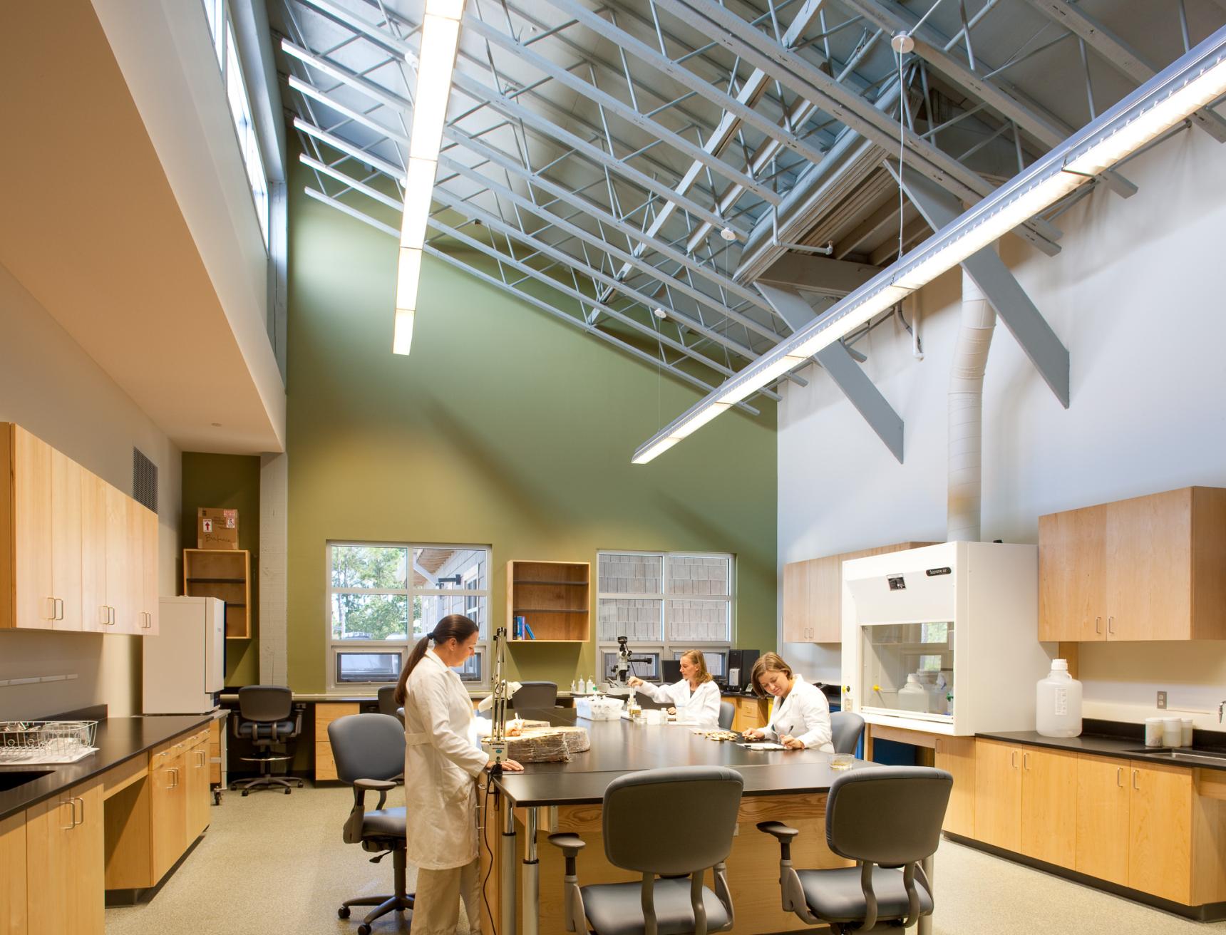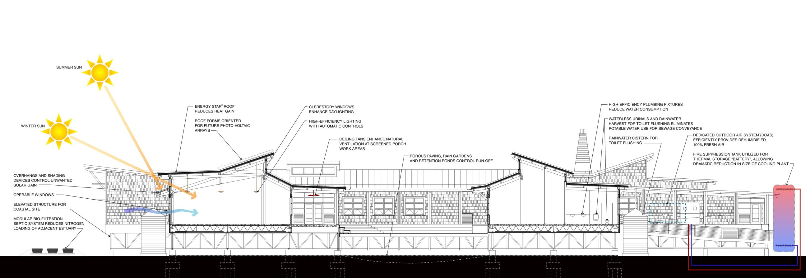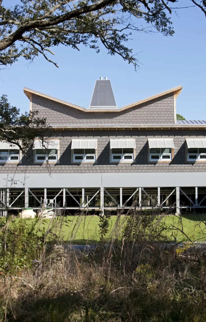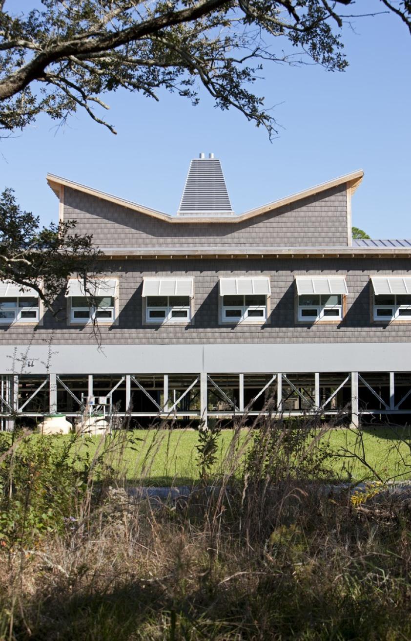 The project’s design was inspired by the traditional coastal vernacular and features an elevated structure, deep overhangs, shutters, screened-in porches, and boardwalks. With its remote location in a hurricane-prone area, where power can be interrupted for extended periods, Passive Survivability was a key design driver. Extensive daylighting (daylit area 86%) and operable windows with insect screens for passive ventilation not only reduce energy use (project 40% reduction, ASHRAE 90.1-1999), but also make the building habitable when power is interrupted. The roof forms were oriented to support the future installation of a PV array. With nitrogen loading from failing septic a key threat to the surrounding estuary, the building’s wastewater is treated to tertiary standards on site with a peat filter biofiltration system. Rainwater is collected in two 6,500 gallon cisterns for toilet flushing, irrigation, and washing research boats (76% reduction in water use), with constructed wetlands and porous paving further reduces stormwater runoff.