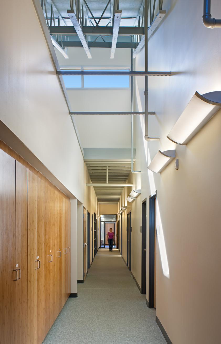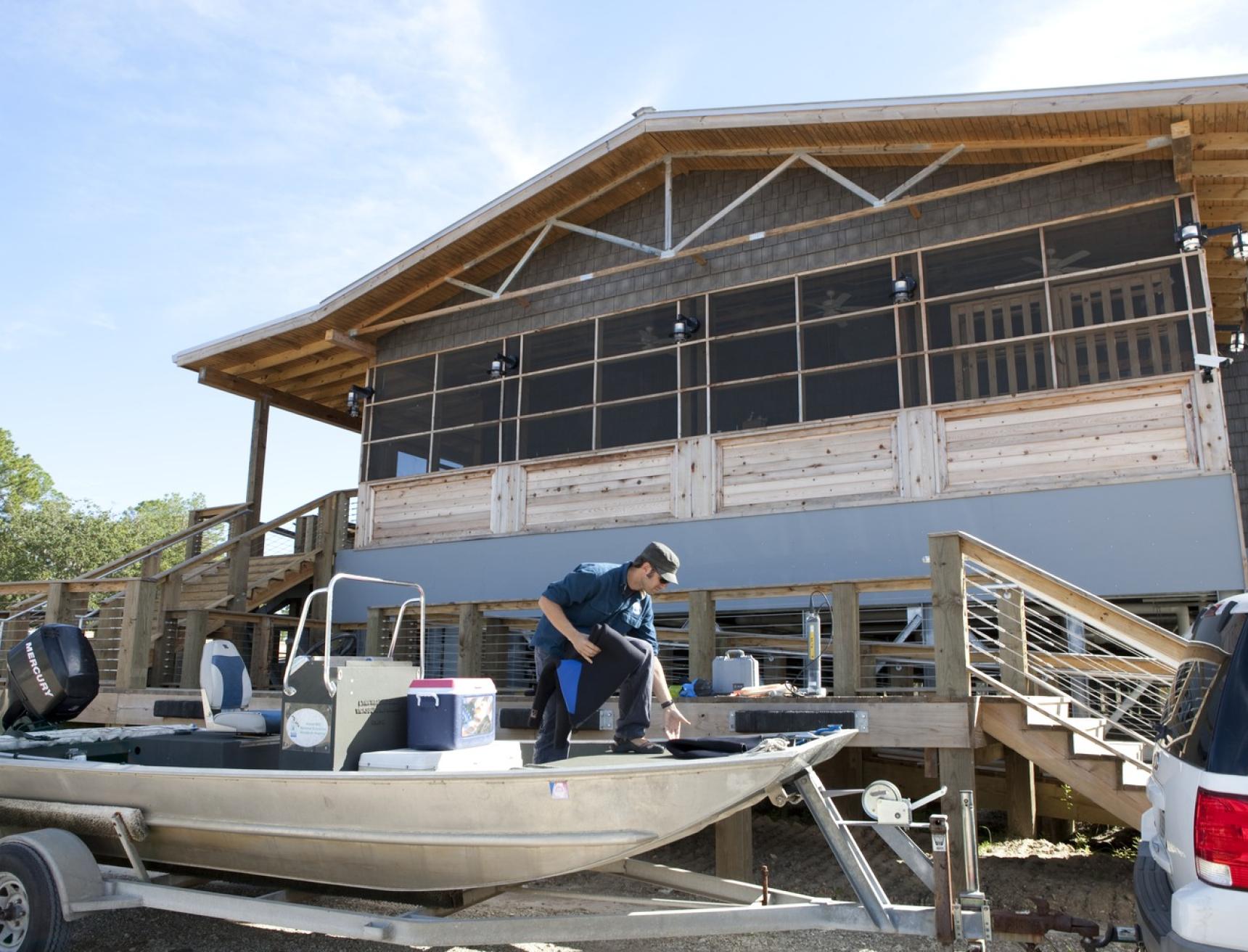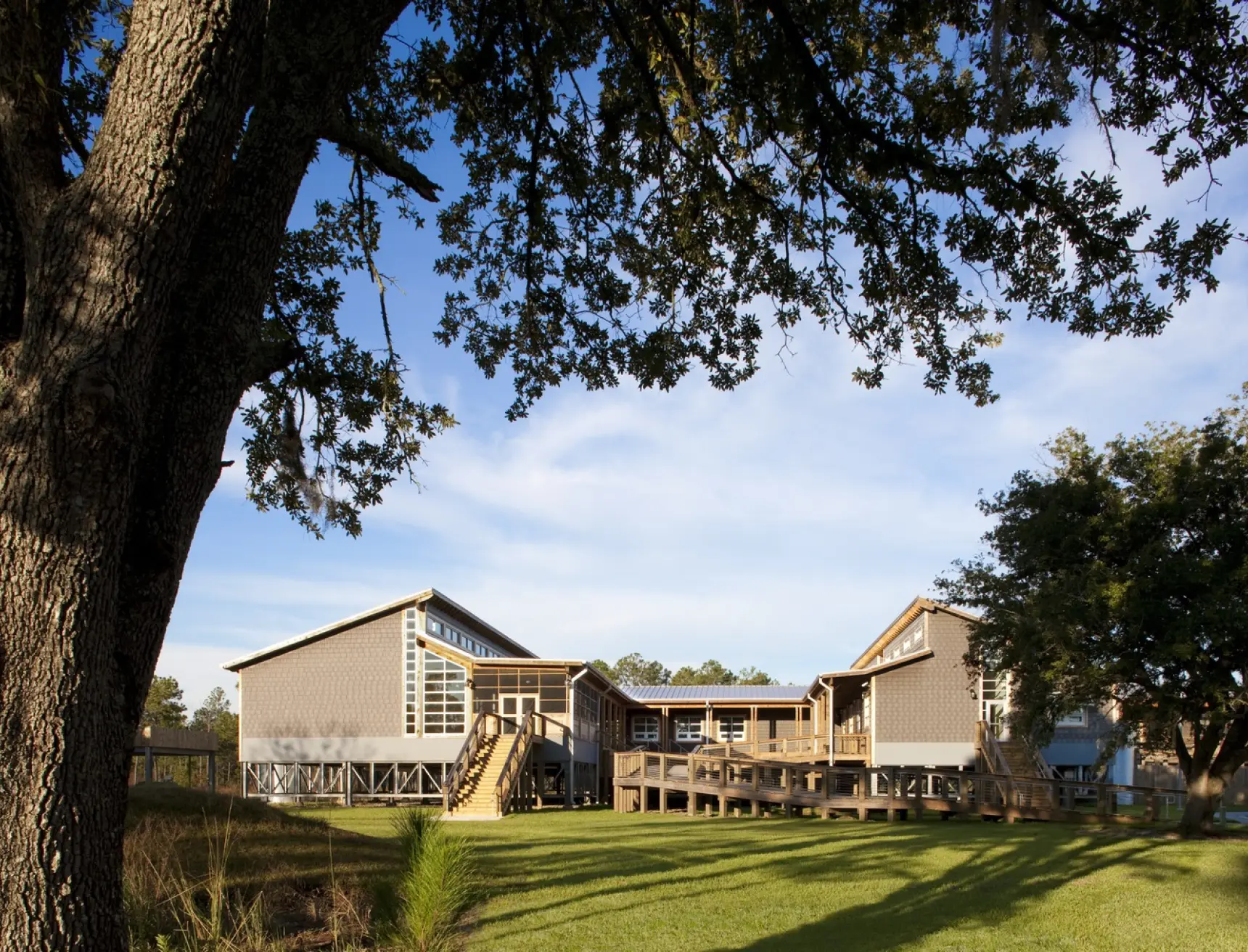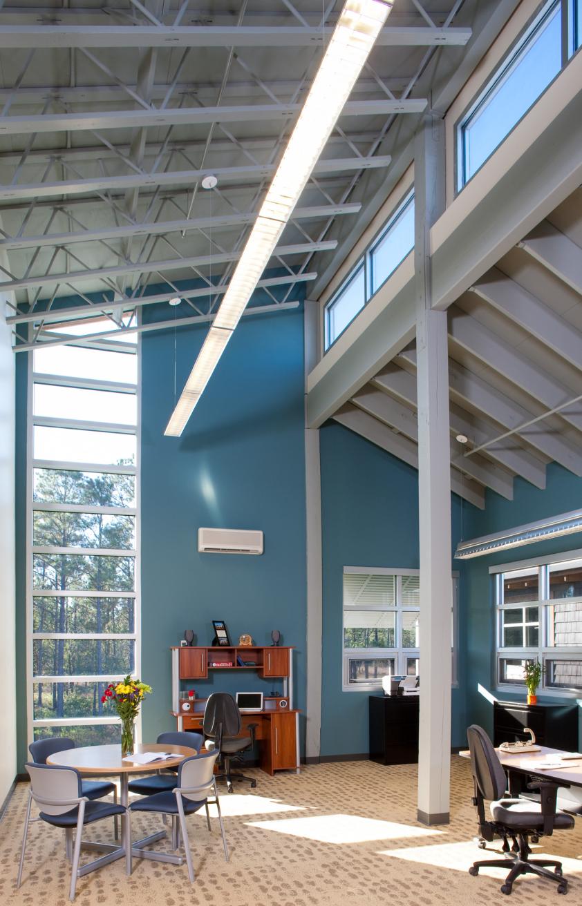The project’s design was inspired by the traditional coastal vernacular and features an elevated structure, deep overhangs, shutters, screened-in porches, and boardwalks. With its remote location in a hurricane-prone area, where power can be interrupted for extended periods, Passive Survivability was a key design driver. Extensive daylighting (daylit area 86%) and operable windows with insect screens for passive ventilation not only reduce energy use (project 40% reduction, ASHRAE 90.1-1999), but also make the building habitable when power is interrupted. The roof forms were oriented to support the future installation of a PV array. With nitrogen loading from failing septic a key threat to the surrounding estuary, the building’s wastewater is treated to tertiary standards on site with a peat filter biofiltration system. Rainwater is collected in two 6,500 gallon cisterns for toilet flushing, irrigation, and washing research boats (76% reduction in water use), with constructed wetlands and porous paving further reduces stormwater runoff.