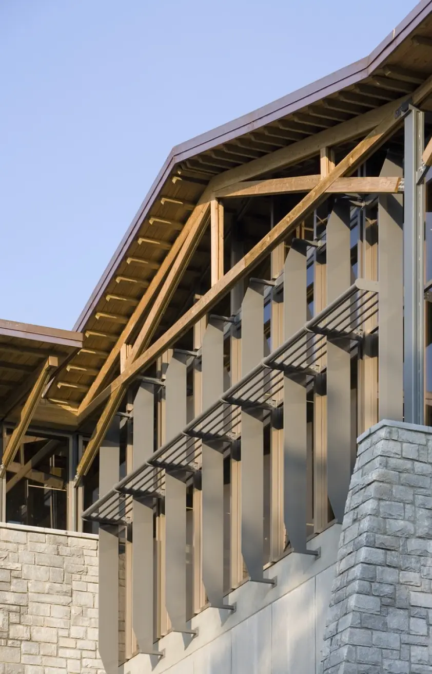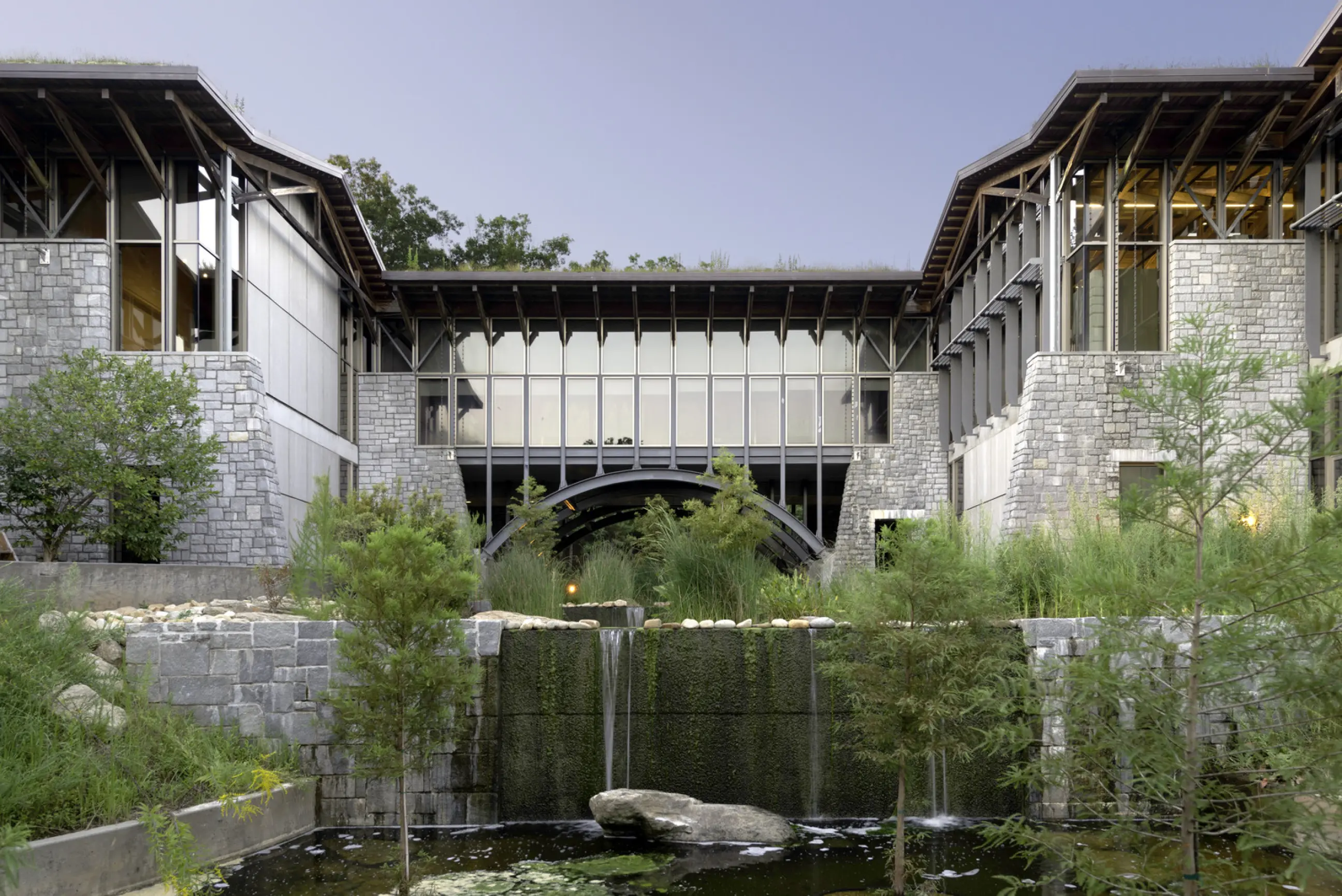 The Gwinnett Environmental & Heritage Center, designed as a collaborative project among various local stakeholders, serves as both an educational resource and a model of sustainability. The facility integrates innovative building technologies and sustainable strategies to enhance environmental awareness. The building is designed to minimize disruption to its 700-acre natural surroundings and incorporates sustainable features such as a one-acre vegetative roof, pervious pavement, and the use of gray water for non-potable applications. Inside, energy efficiency is achieved through systems like daylight harvesting, fan-assisted natural ventilation, and efficient HVAC design, all of which contribute to significant reductions in both energy and potable water use compared to traditional facilities of similar size. The center also features interpretive exhibits focused on the interrelationship between water and life, while its outdoor trails and water features, including a natural stream that cools the building, further integrate the facility with its environment. With these measures, the center achieved LEED Gold certification and continues to function as an exemplar of sustainable design.
