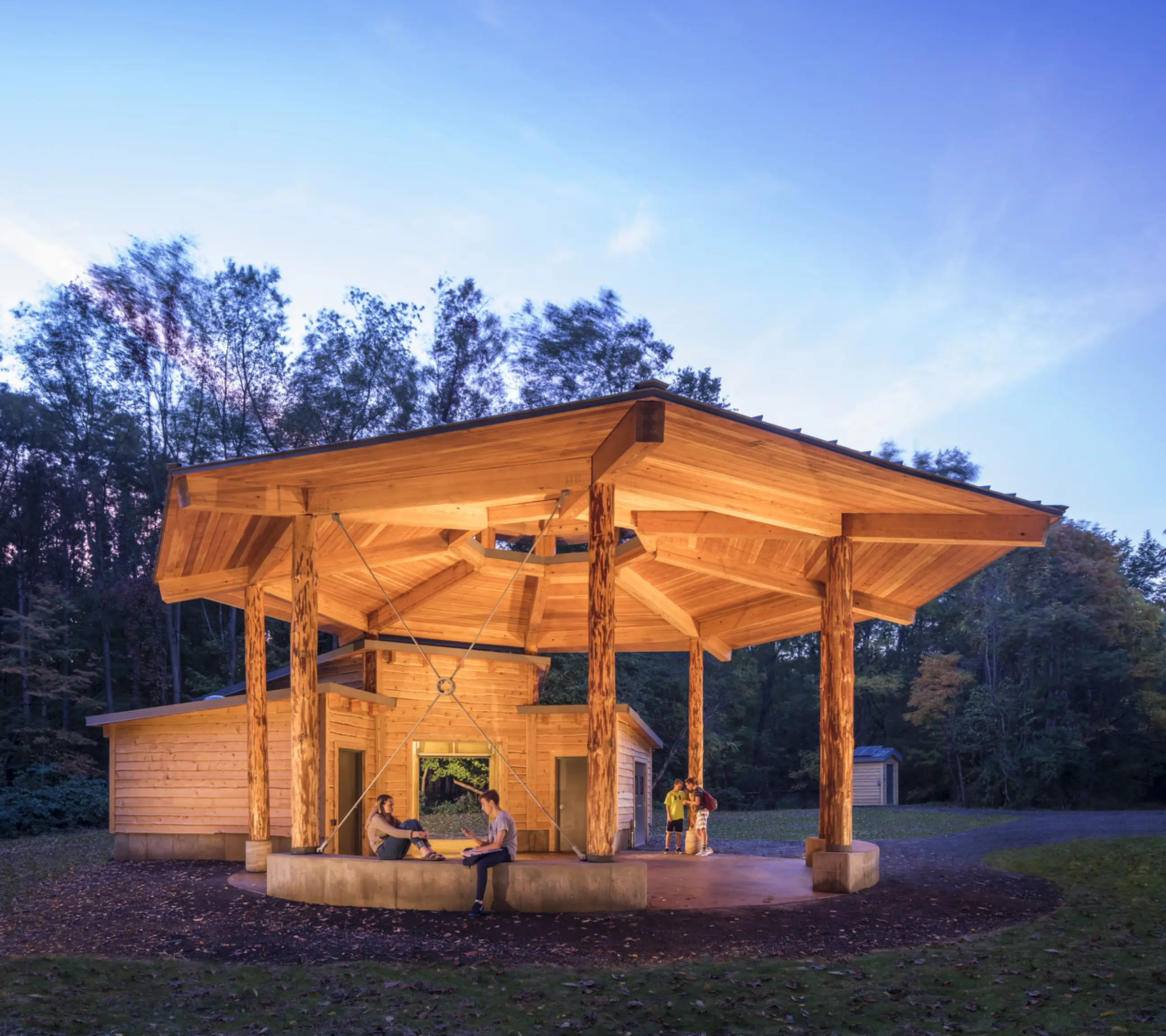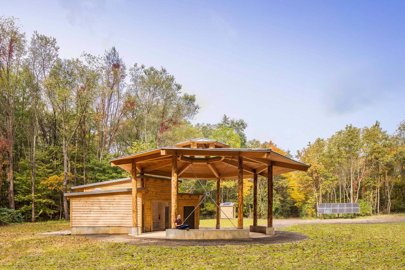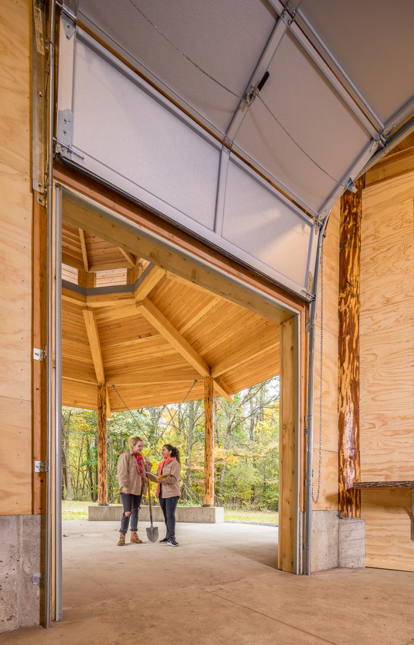 The team used design to acknowledge indigenous cultures for Batts Pavilion, which is located on the ancestral lands of the Pokagon Band of the Potawatomi. The off-grid educational pavilion was inspired by the traditional Potawatomi wigwam, round in form and opening to the east with a central fire pit.