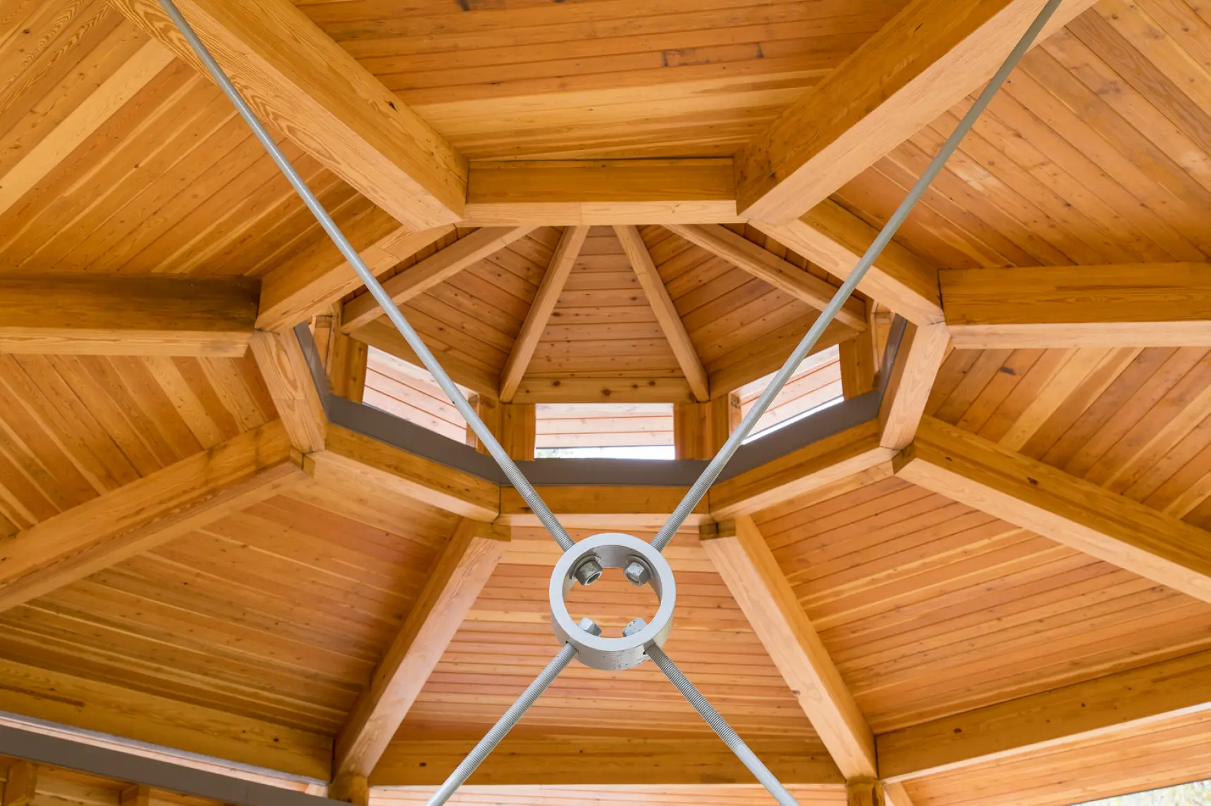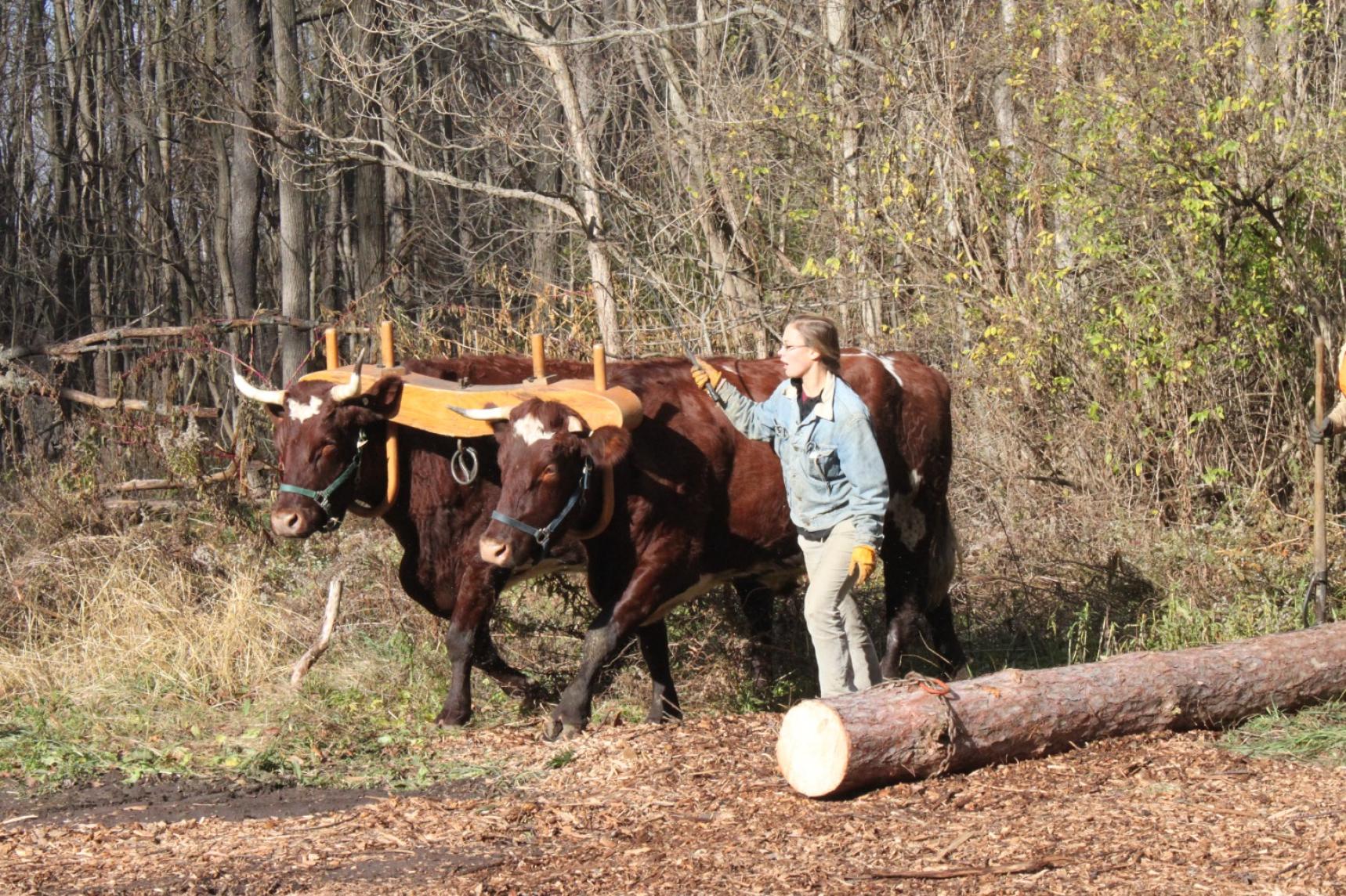 An oxen team was used to transport site-harvested pine trees used as columns to support the pavilion. The oxen enabled use of the existing foot trails to access the pine stand, avoiding the need to construct a more intrusive vehicular access road.