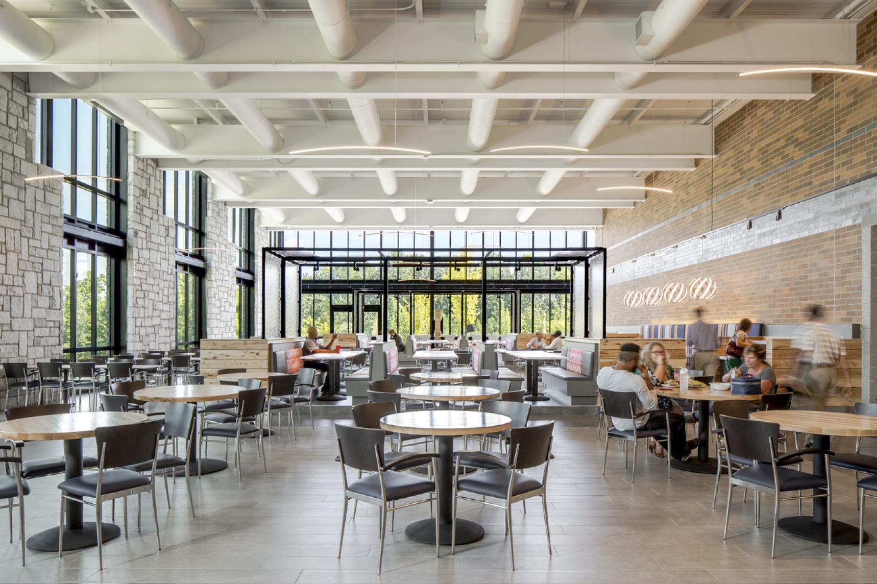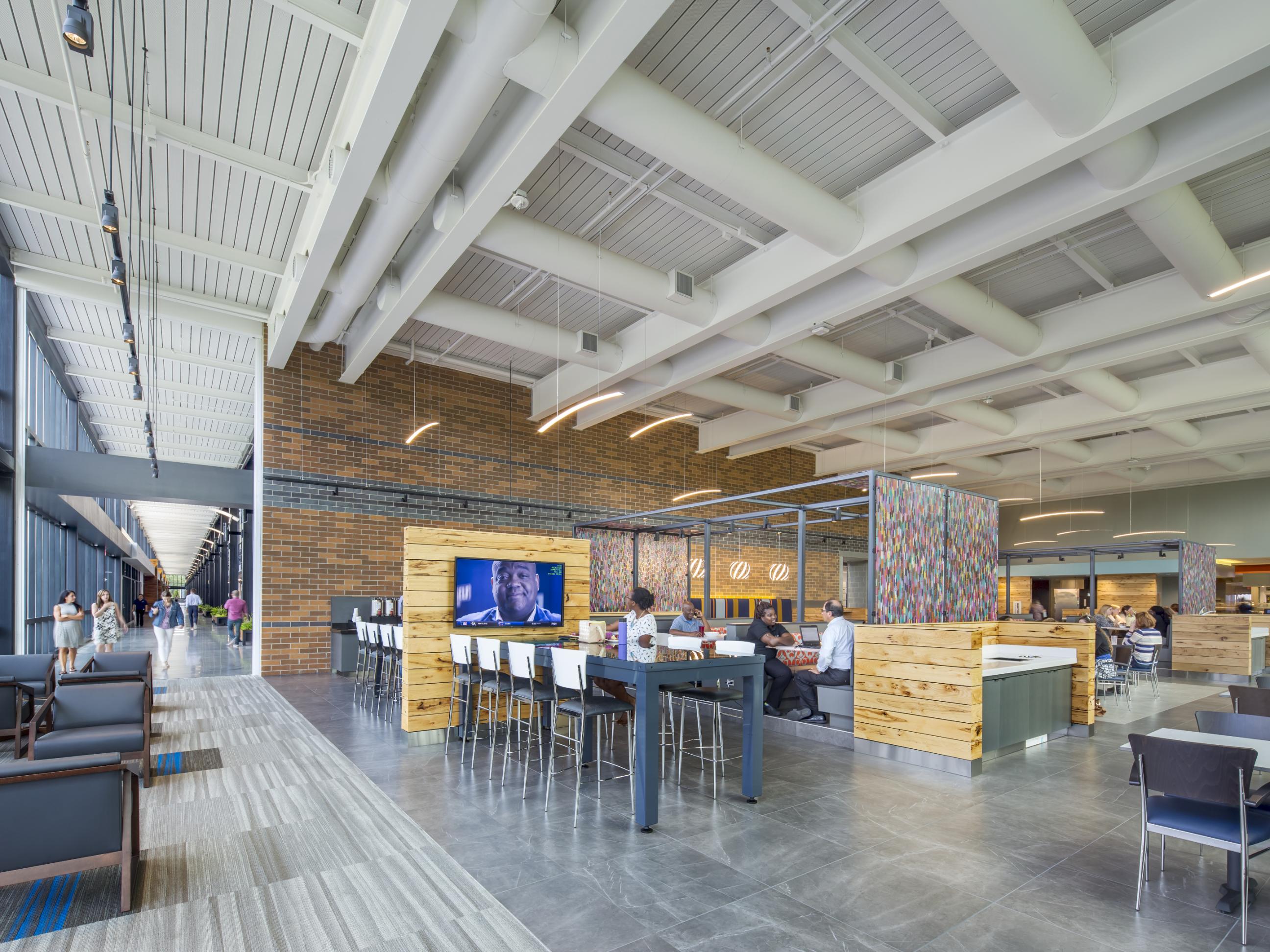 The amenities feature shared meeting spaces, a dining venue with an outdoor terrace, and locker-lounges, serving over 600 employees. Symbolically and physically open programmatic areas foster a sense of connection and value among all employees as part of the larger team.