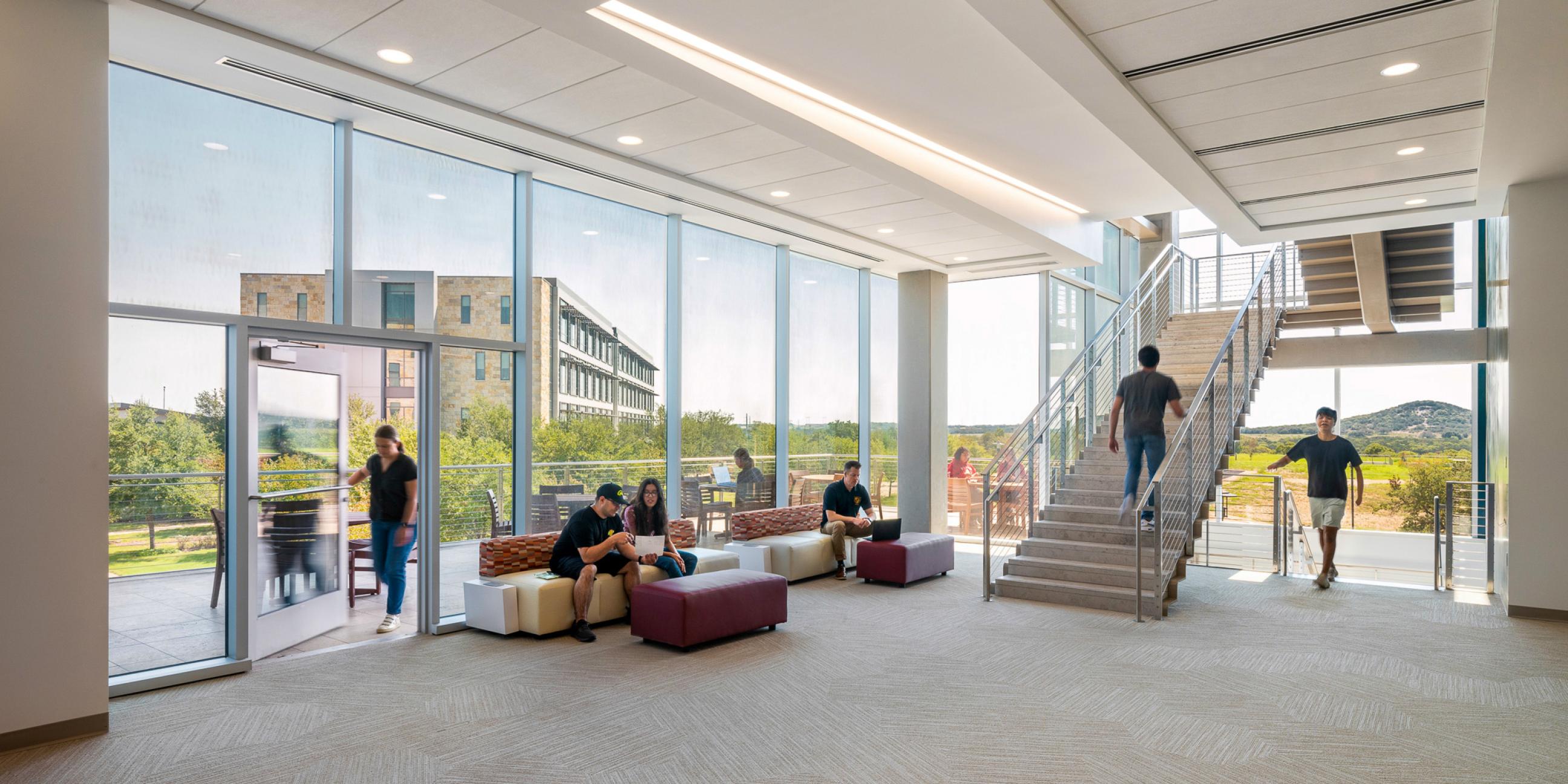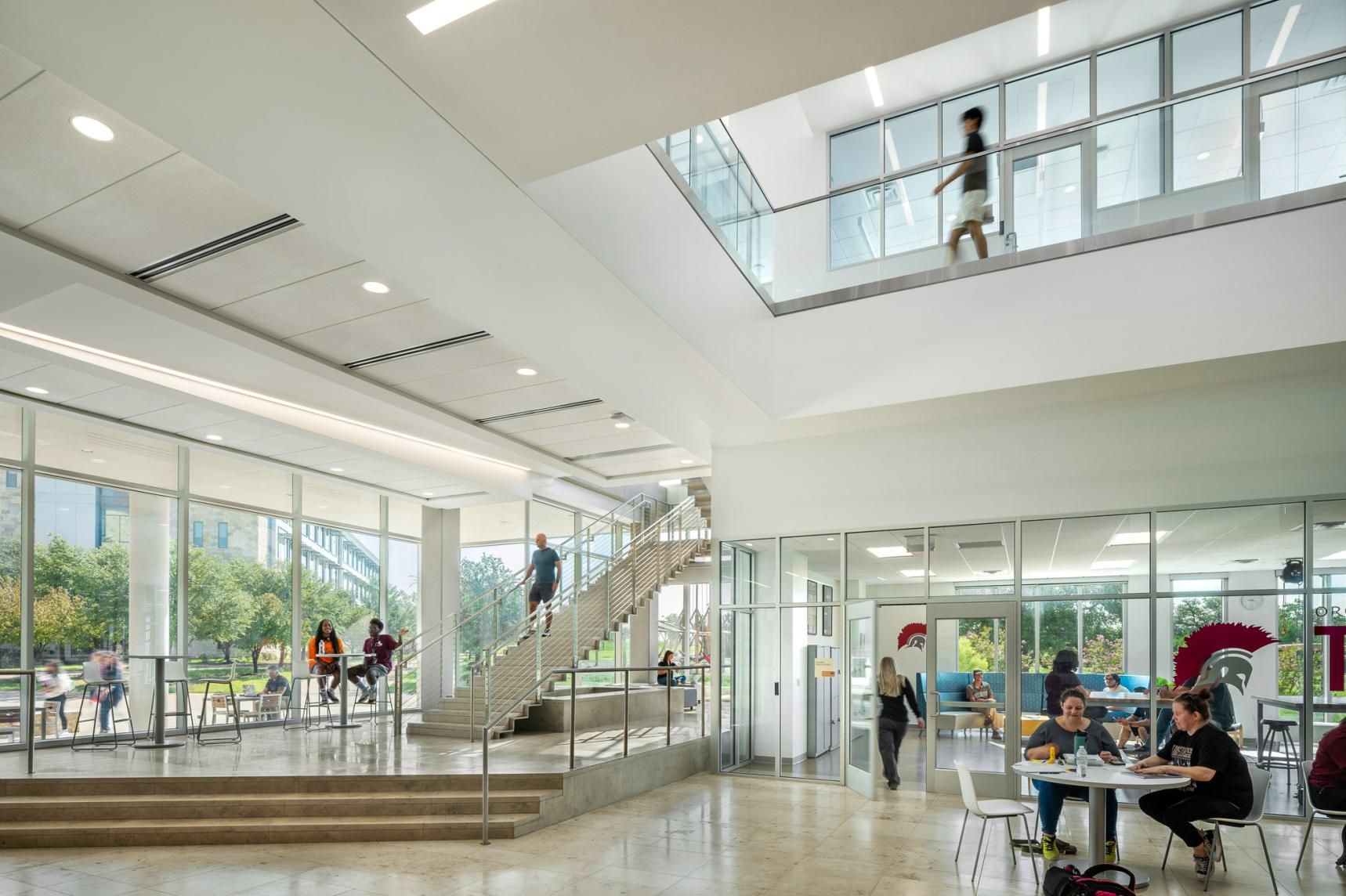 At Texas A&M University - Central Texas, Heritage Hall, designed by Lord Aeck Sargent in collaboration with Harrison Kornberg, serves as the third building on the campus, primarily focusing on STEM instruction spaces and various support areas. Positioned to foster a traditionally collegiate atmosphere, the design emphasizes casual collaborative environments, encouraging student interaction between classes. Featuring an atrium-like space facilitating connection through floor openings and glass walls, the building showcases maker spaces, seminar areas, student organization offices, and teaching spaces. Additionally, shaded exterior terraces promote connectivity with pedestrian paths, while the highly transparent exterior allows for a display of teaching and learning activities within, fostering social interaction and informal collaborative learning spaces.
