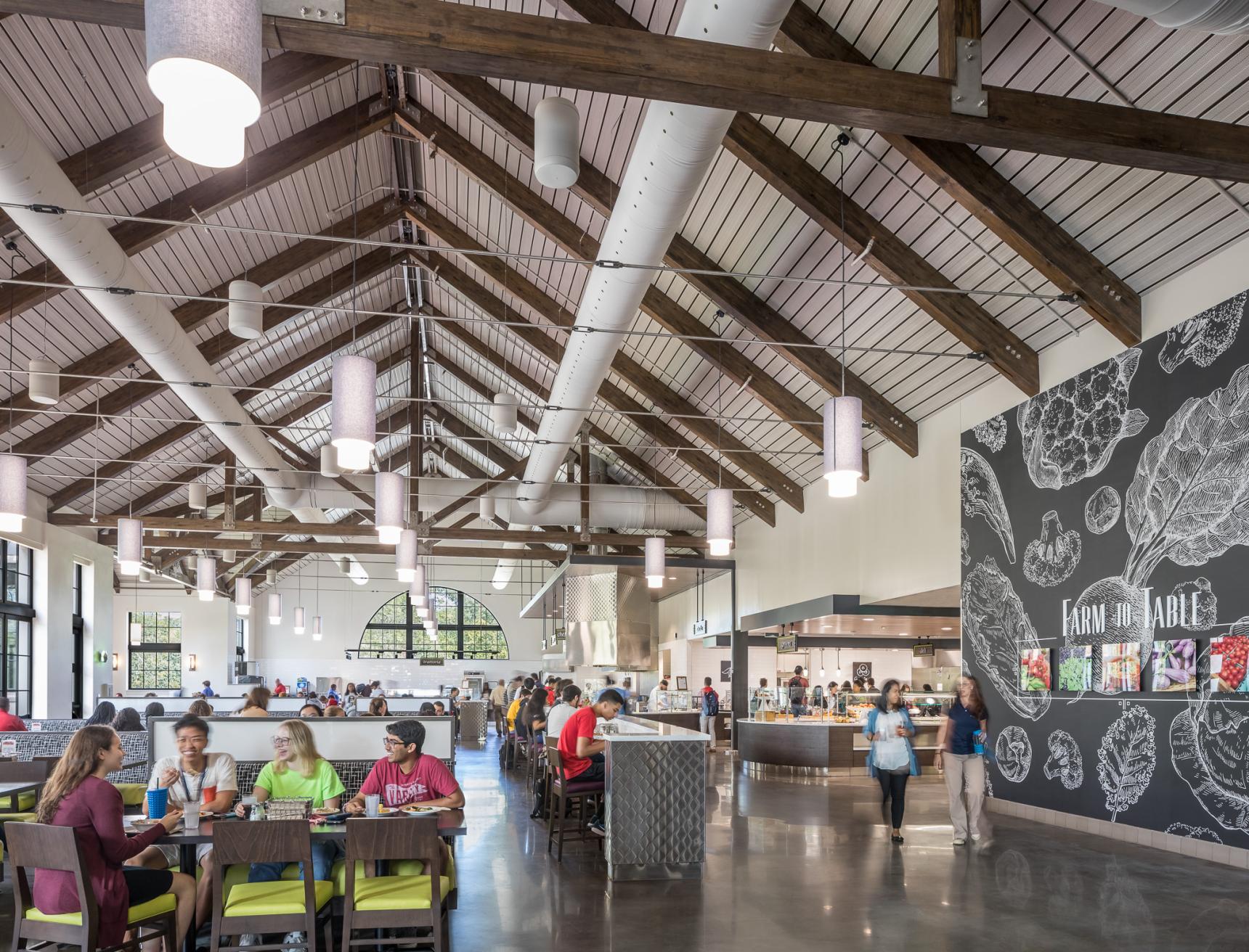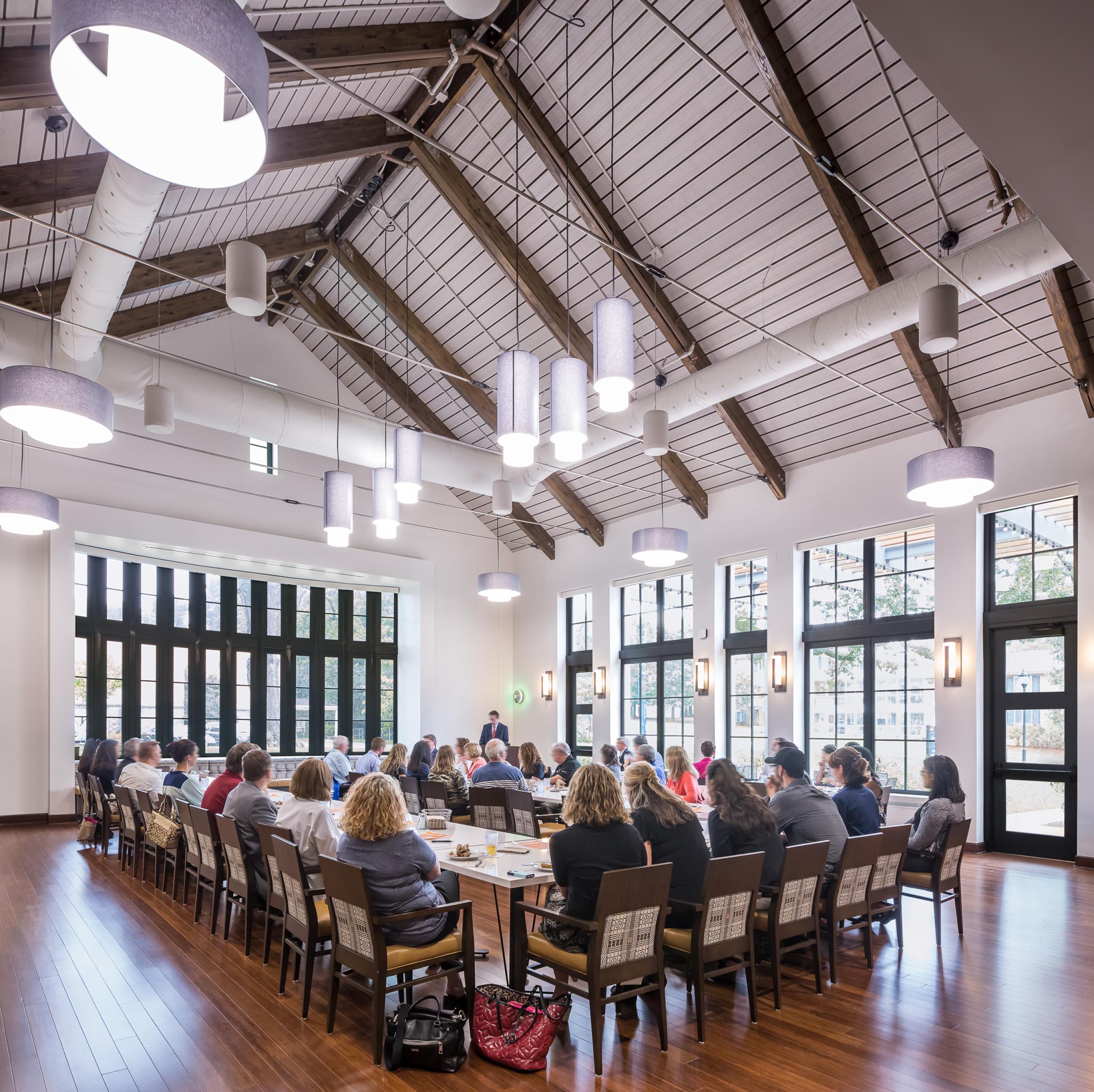 Emory Oxford's commitment to sustainability and locally sourced food is embodied in its new dining facility, designed by Lord Aeck Sargent. Situated on the edge of the intimate campus, the building's layout harmonizes with the trapezoidal site shape and traditional stucco-clad architecture. The spacious interior, featuring exposed wood trusses, can accommodate 400 diners in the main area and an additional 100 in the Dean's Dining Room. Market-style food stations showcase vegan and non-vegan options, while a large lunette window invites guests to witness the preparation of oven-baked delights. Inspired by historic market halls, the design offers cozy nooks for socializing, ensuring a diverse and engaging dining experience that celebrates Emory's farm-to-table ethos.