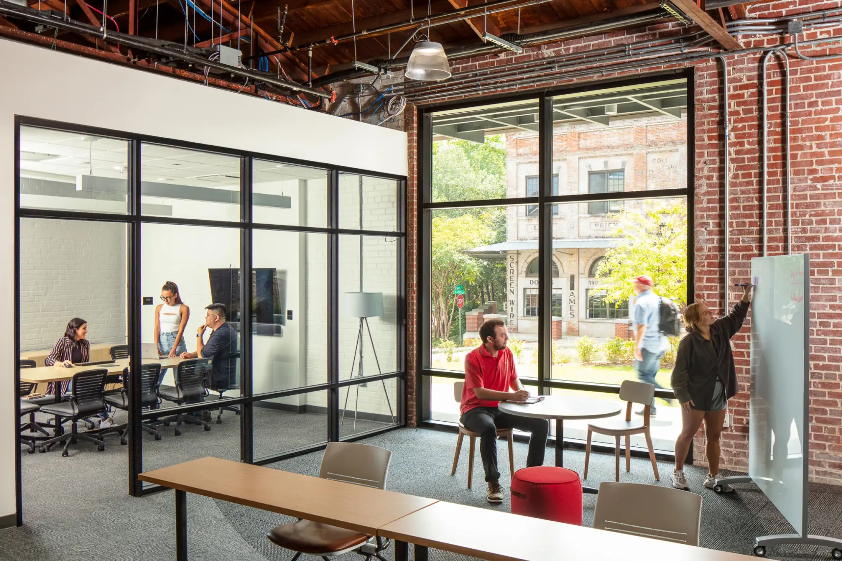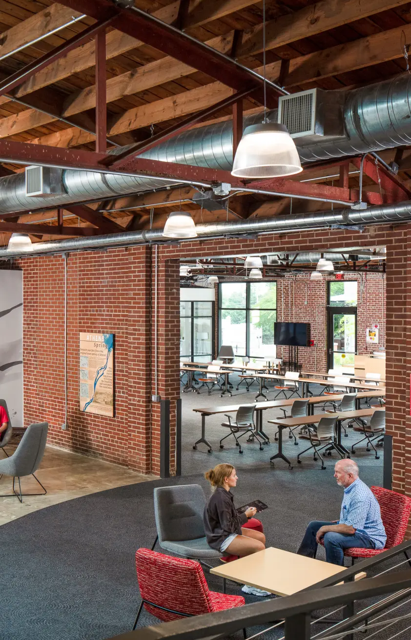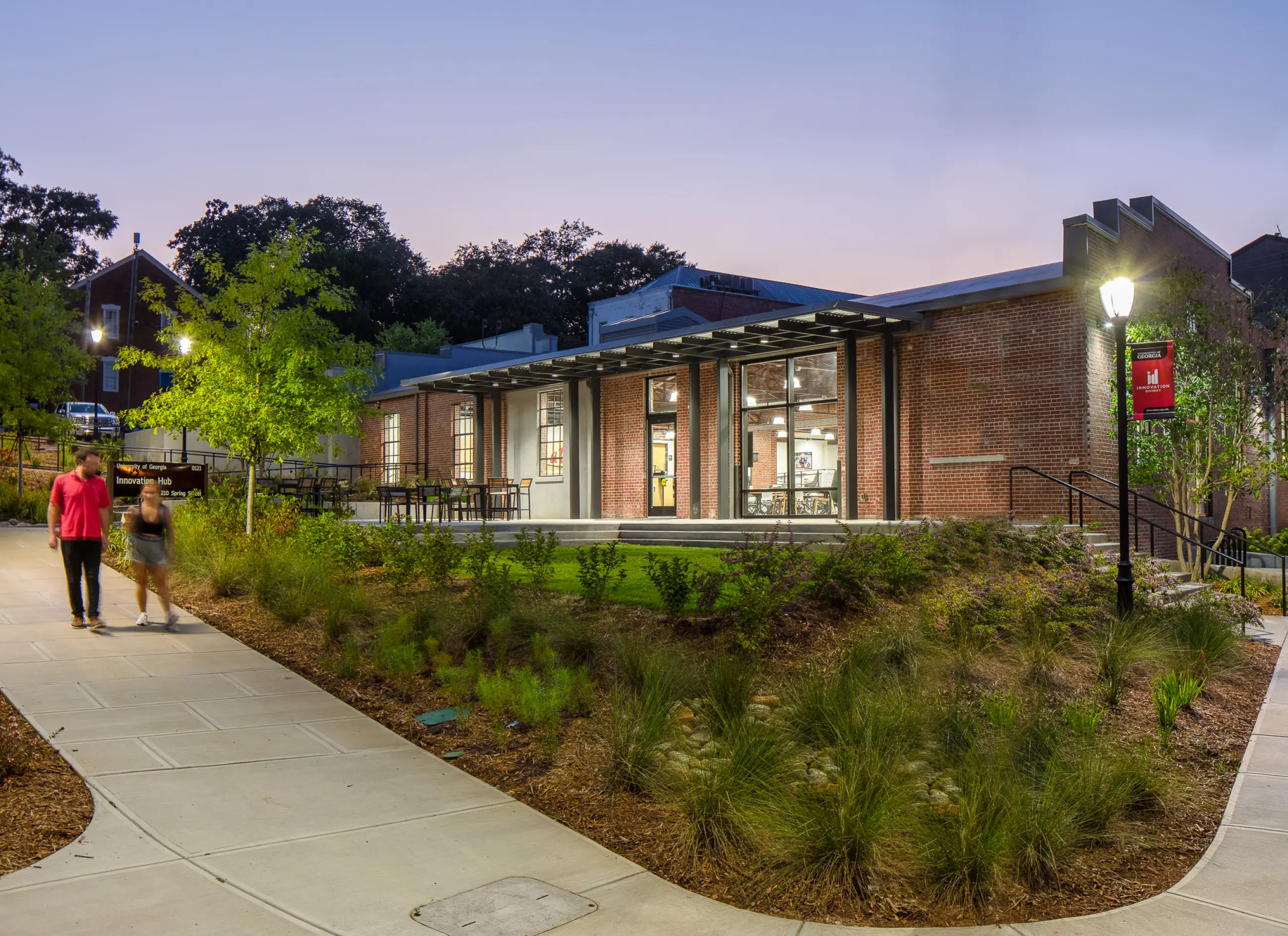 The Delta Innovation Hub, part of UGA’s new Innovation District, is a pioneering adaptive re-use project that transforms four historic processing plant structures into a vibrant center for entrepreneurial activity. It features large open areas for meetings and events, a versatile makerspace, restored historic skylights, and thoughtfully designed office spaces for the university's Director of Strategy and Innovation and startup companies. The design seamlessly integrates modern systems and technologies while preserving the building's historic character. The Hub's new expansive window openings provide abundant natural light and connect the interior with the revitalized natural landscape, creating an inspiring environment that fosters collaboration and innovation.
