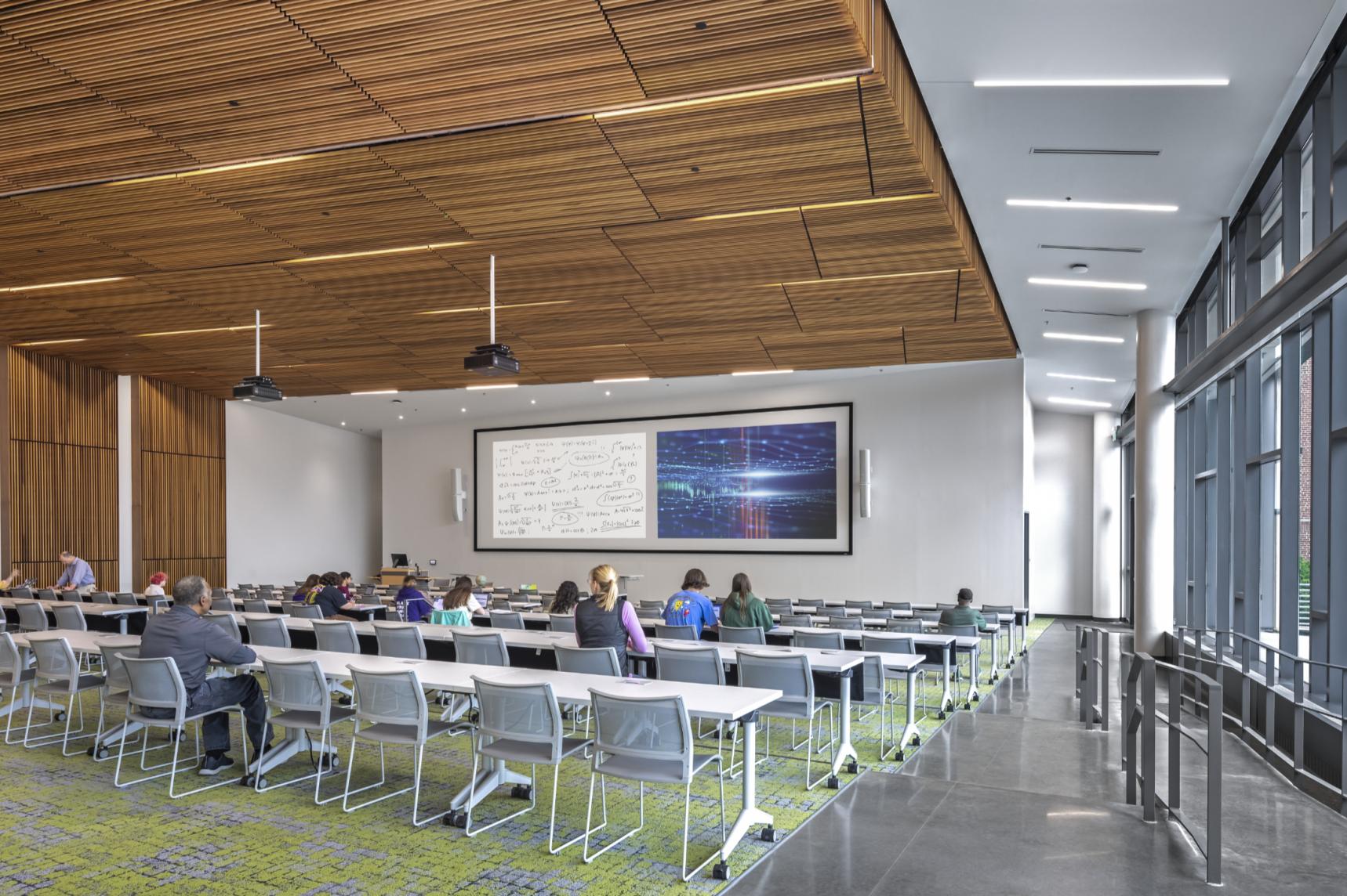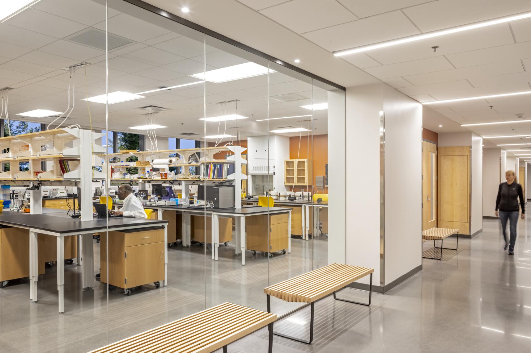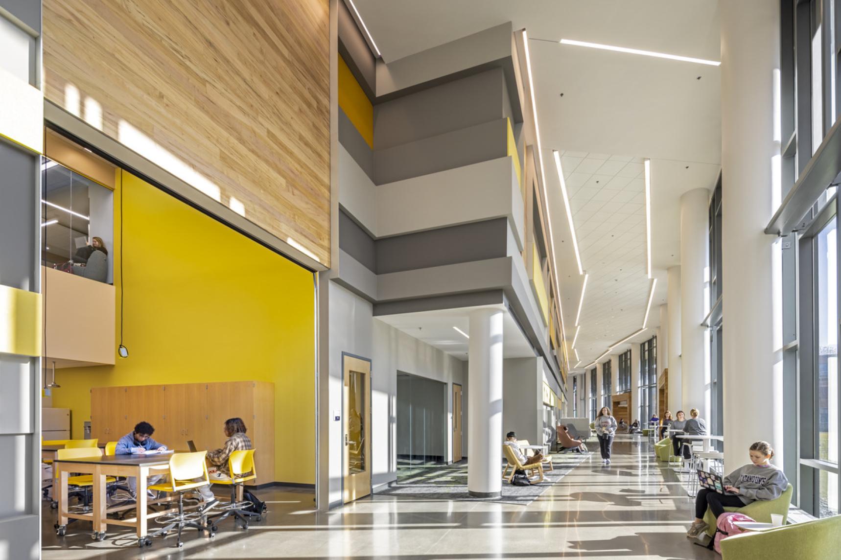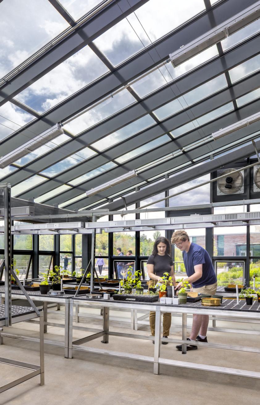 The new building seamlessly connects with the existing Stillwell Science Building, promoting interdisciplinary collaboration. Featuring a rooftop terrace with mountain views, sustainable elements like a 15,000-square-foot greenhouse, and community-focused spaces such as 'the gorge' and 'the commons,' it embodies the university's commitment to interactive, interdisciplinary learning grounded in the region's heritage and natural beauty.