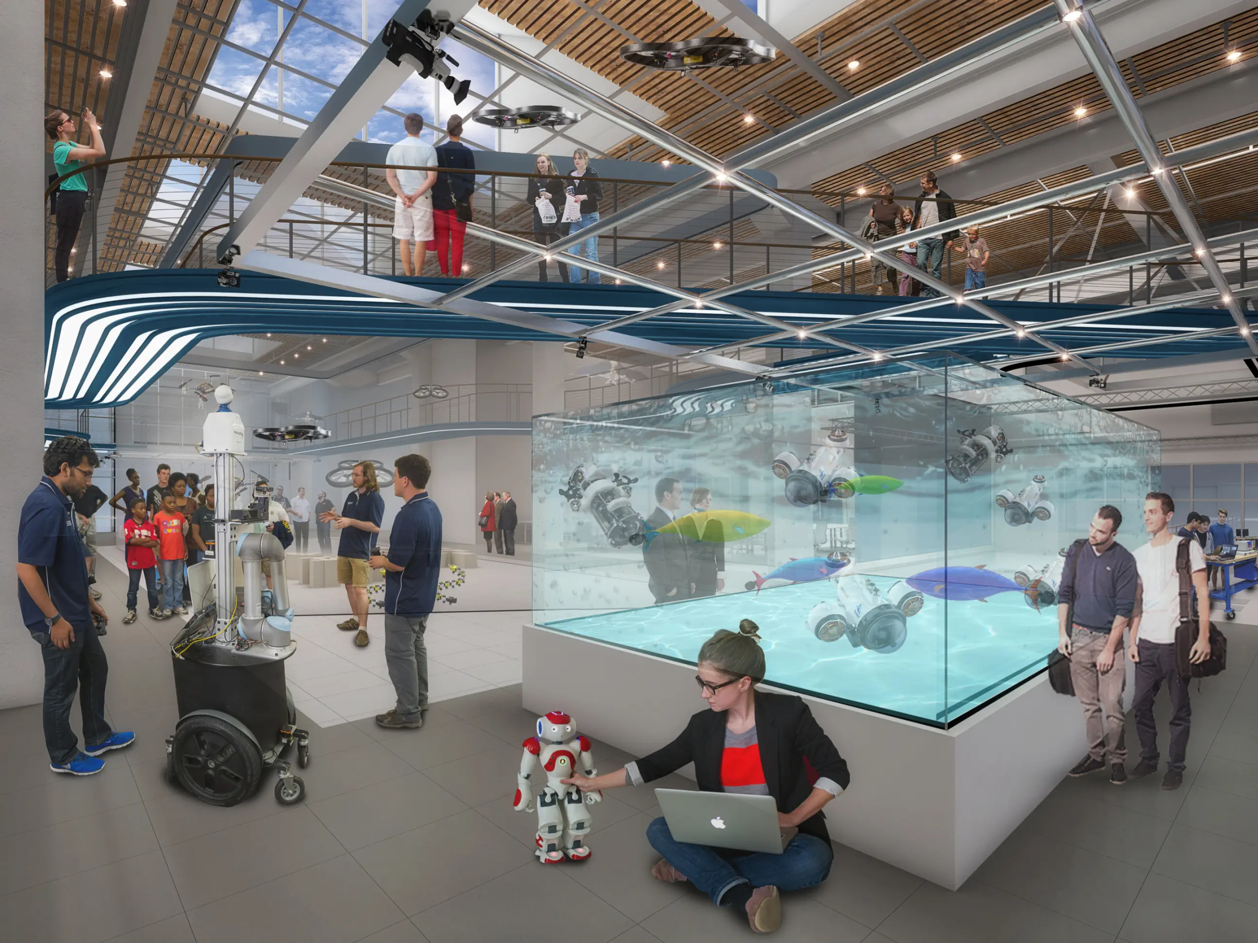 Georgia Tech is embarking on an innovative architectural endeavor with the creation of the new Robotarium, housed within the Callaway Manufacturing Research Center. Designed for the Institute for Robotics and Intelligent Machines (IRIM), this facility serves as a nexus for interdisciplinary research, uniting faculties and students across all colleges at Georgia Tech. The Robotarium is segmented into three core areas: Human Augmentation, Autonomous Robotics, and Collaborative Robotics. Beyond its research capabilities, the space is equipped to demonstrate groundbreaking advancements with applications spanning biomedical research, transportation, agriculture, music, and manufacturing. The facility features a 60-seat auditorium for interactive demonstrations akin to "TED Talks," and an elevated catwalk offers students and industry visitors a bird's-eye view of ongoing robotic activities. Specialized zones within the Robotarium include a Terrain Park for human augmentation studies, an Aerodrome for autonomous flying robots, water tanks tailored for aquatic research, and diverse sand pits optimized for terrestrial robotics experimentation.