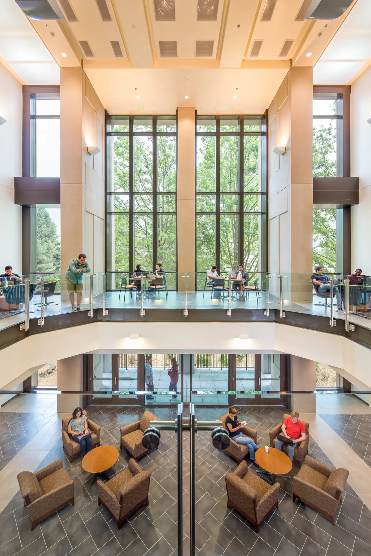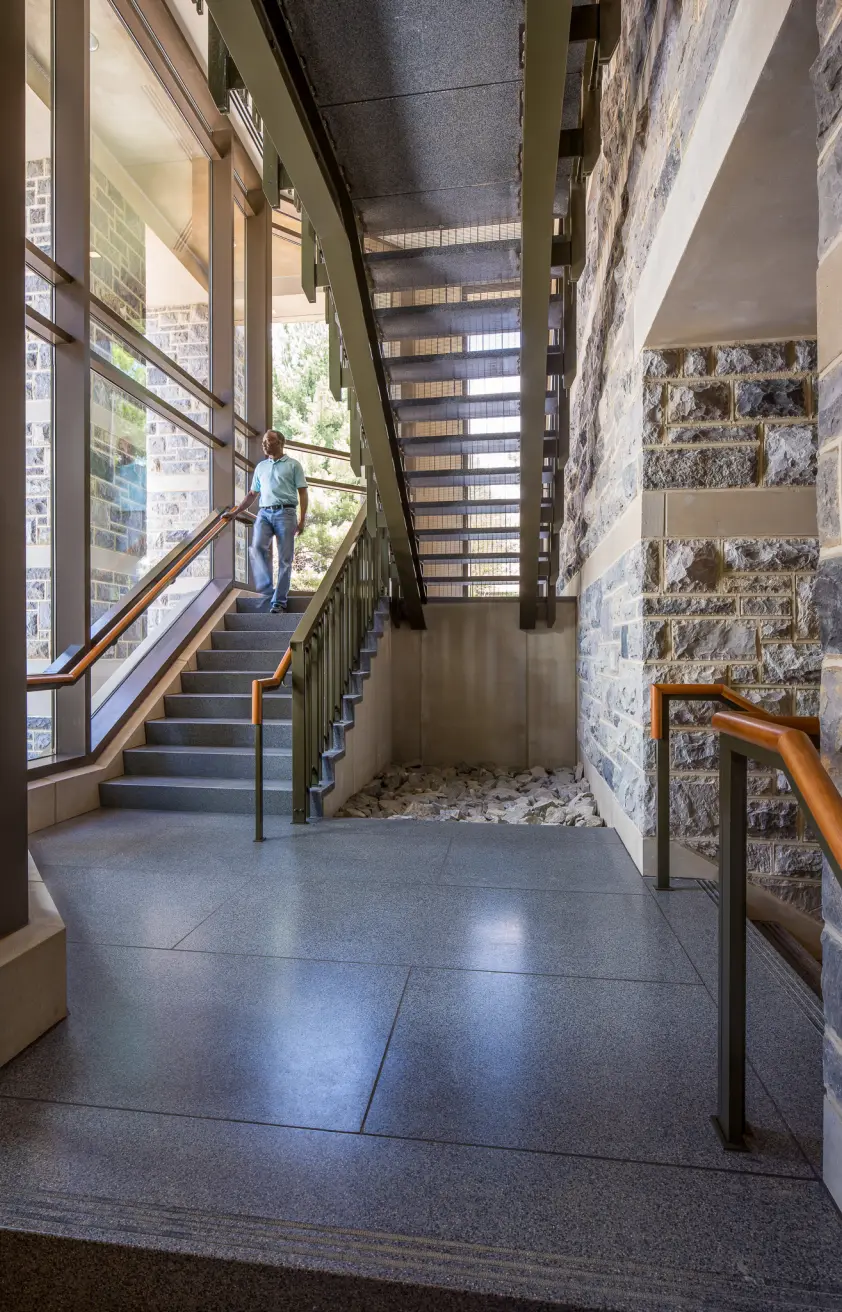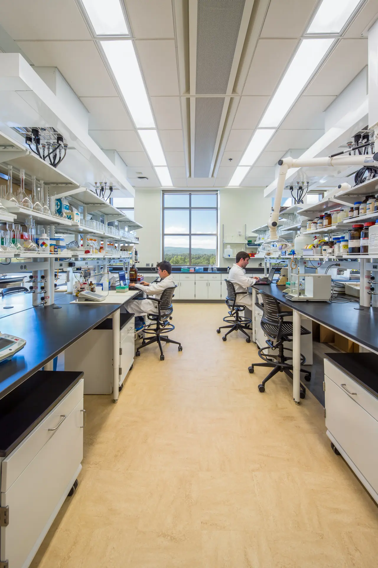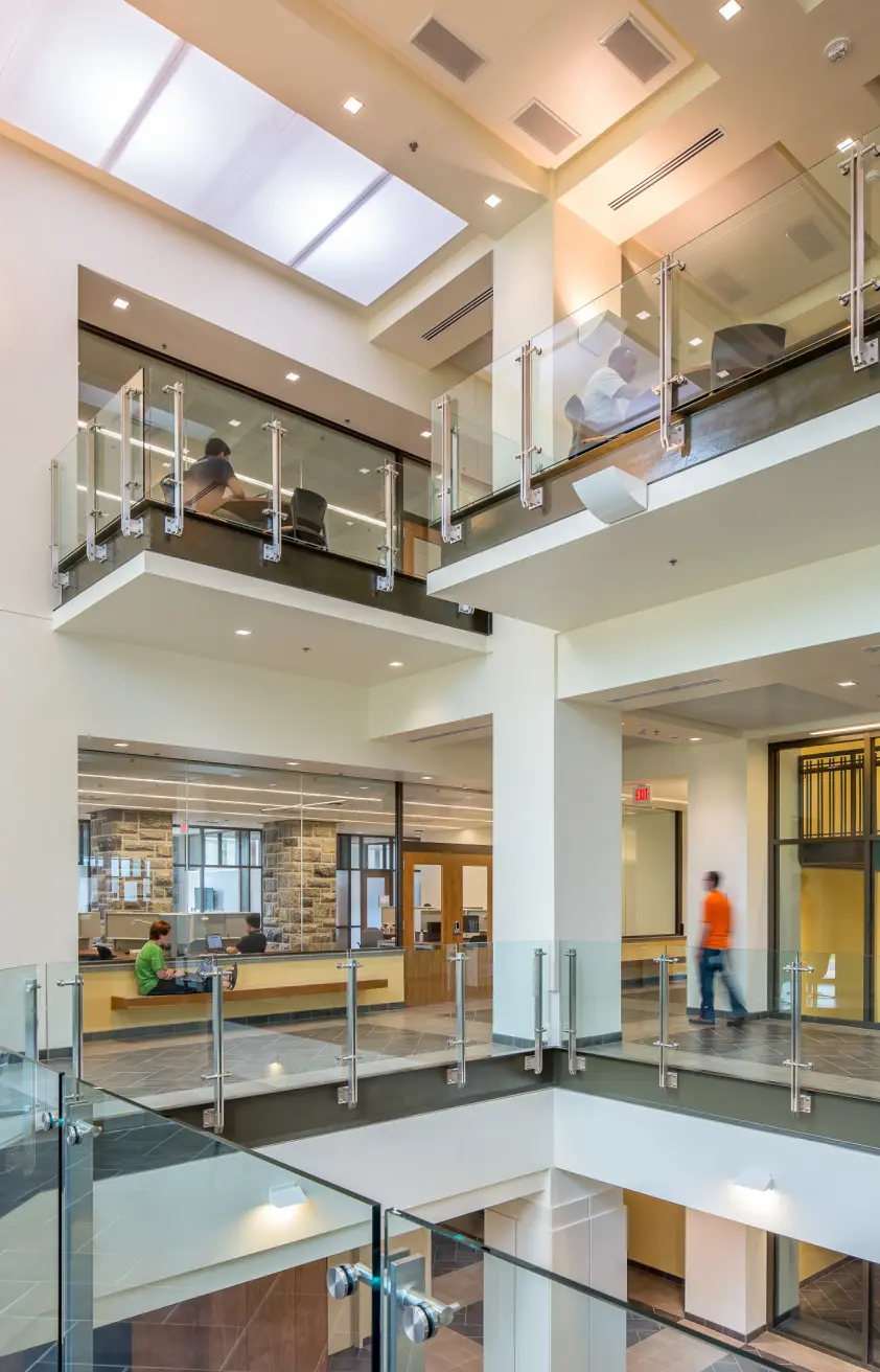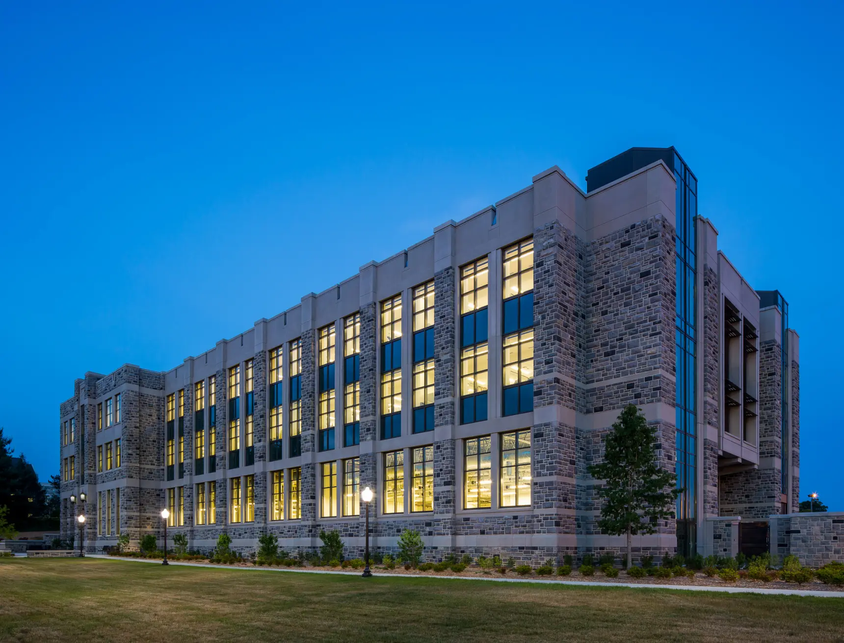 The Human and Agricultural Biosciences Building 1 (HABB1) at Virginia Tech features advanced laboratories designed for research in microbiological and biochemical fields, including food safety, bio-fuel cells, and environmental quality analysis. The labs are equipped with high-bay spaces for large-scale equipment, offering flexibility in utility access and loading requirements. Natural light permeates the labs through clerestory windows and extensive glazing, minimizing reliance on artificial lighting. Sustainable design elements include a chilled beam HVAC system that efficiently maintains indoor air quality and temperature while reducing energy consumption. The facility’s commitment to sustainability extends to the use of low-VOC materials, recycled content, and stormwater management strategies, all contributing to its LEED Gold certification. These laboratories support critical research while aligning with high-performance environmental standards.