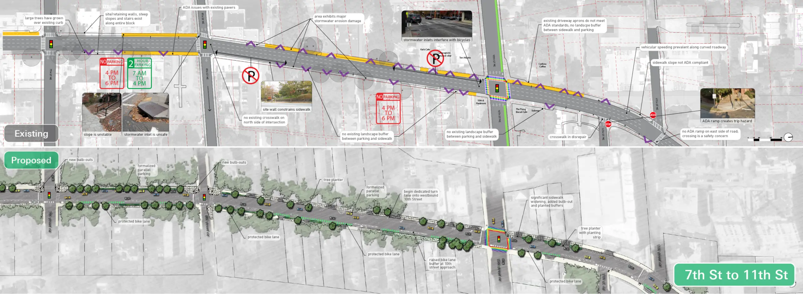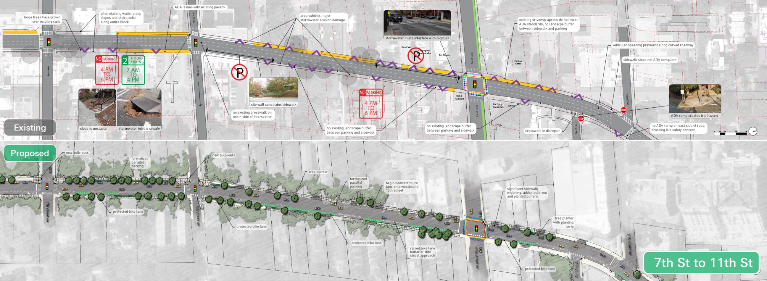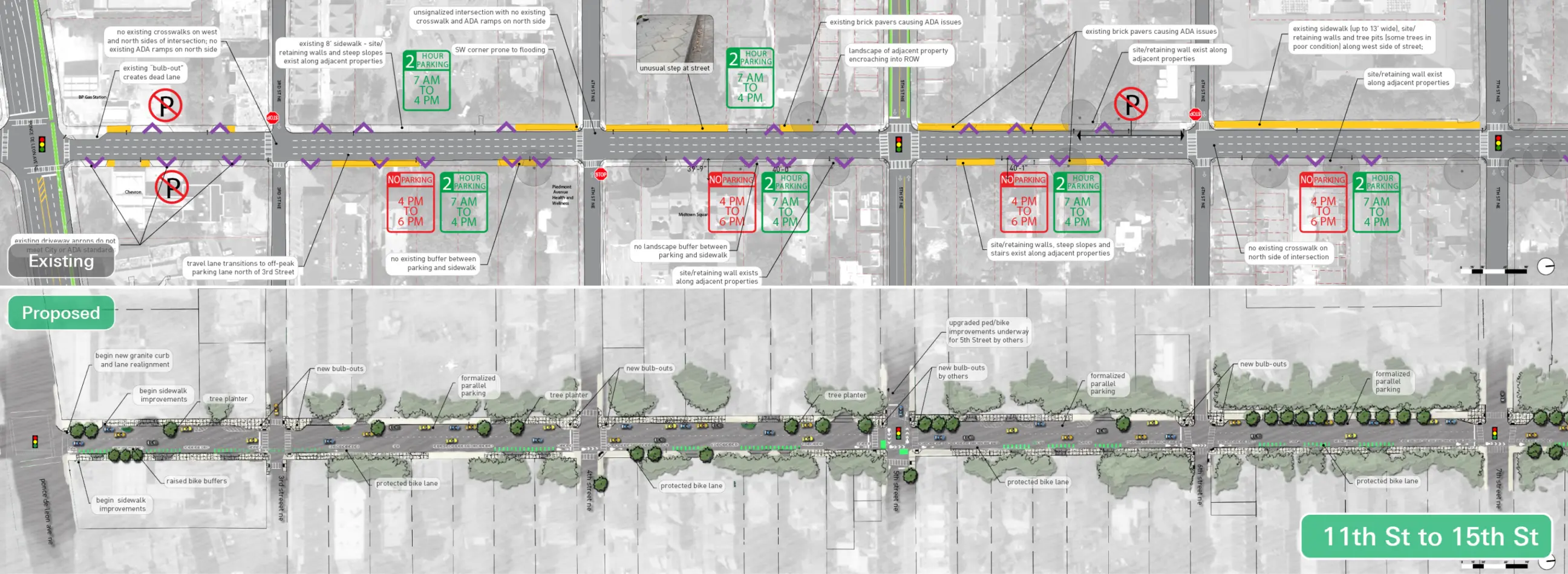 Lord Aeck Sargent, in collaboration with Midtown Alliance and Renew Atlanta, spearheaded the redesign of a 1.1-mile corridor of Piedmont Avenue, a crucial north-south artery linking Atlanta’s Downtown, Midtown, and Buckhead areas. Partnering with Kimley-Horn on transportation strategy, the firm led an in-depth analysis of the corridor's safety issues, underutilized spaces, and ADA non-compliance, which informed the design of comprehensive "complete street" solutions. The concept prioritized pedestrian and cyclist safety by integrating a northbound protected bike lane aligned with five existing routes, reducing vehicular speeds through targeted traffic-calming measures, and formalizing on-street parking to enhance accessibility. Pedestrian connectivity and ADA accessibility were addressed through improved crosswalks, multi-use pathways, and curb ramps, while stormwater planters were strategically incorporated to mitigate runoff impact. Through a collaborative public engagement process, Lord Aeck Sargent’s landscape strategy set a foundation for transforming Piedmont Avenue into a more balanced, multi-modal urban environment.