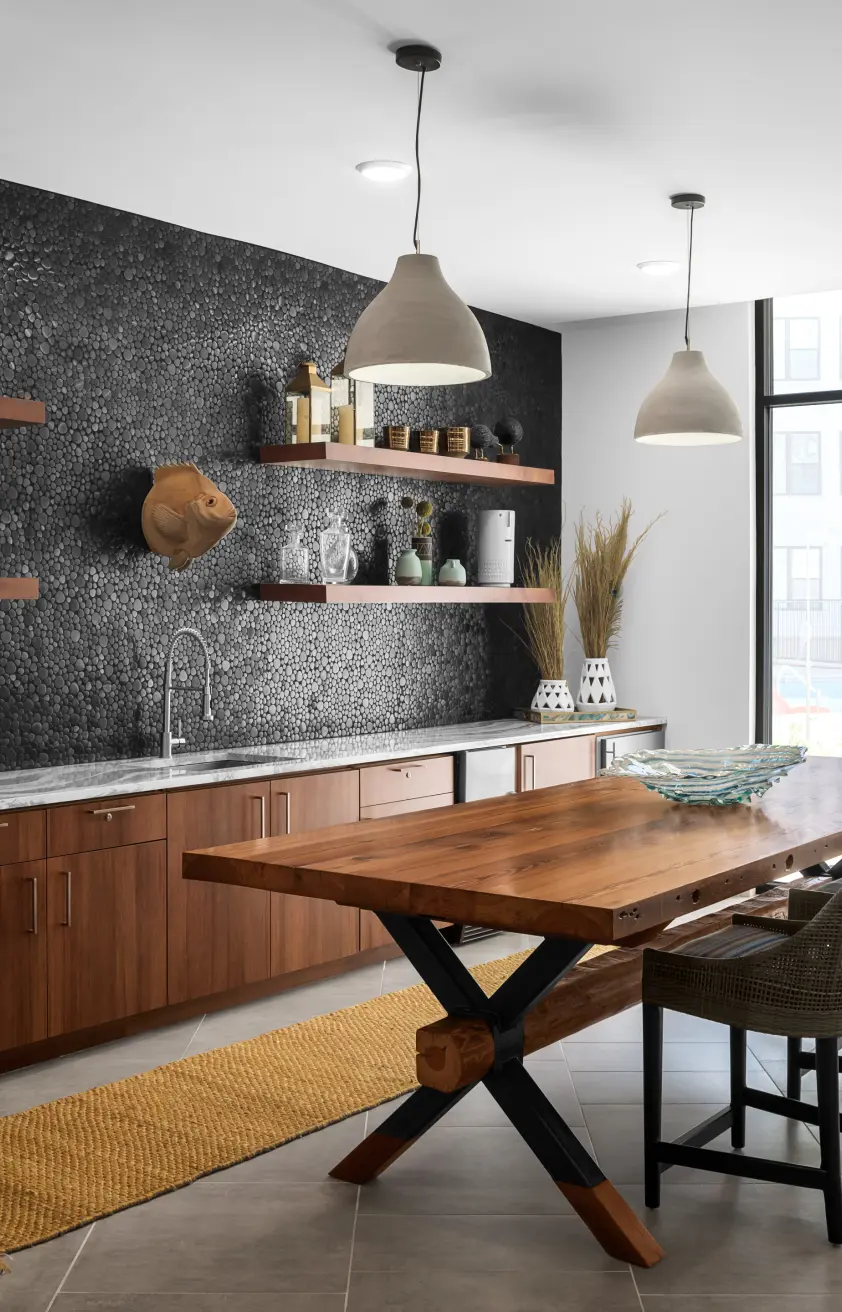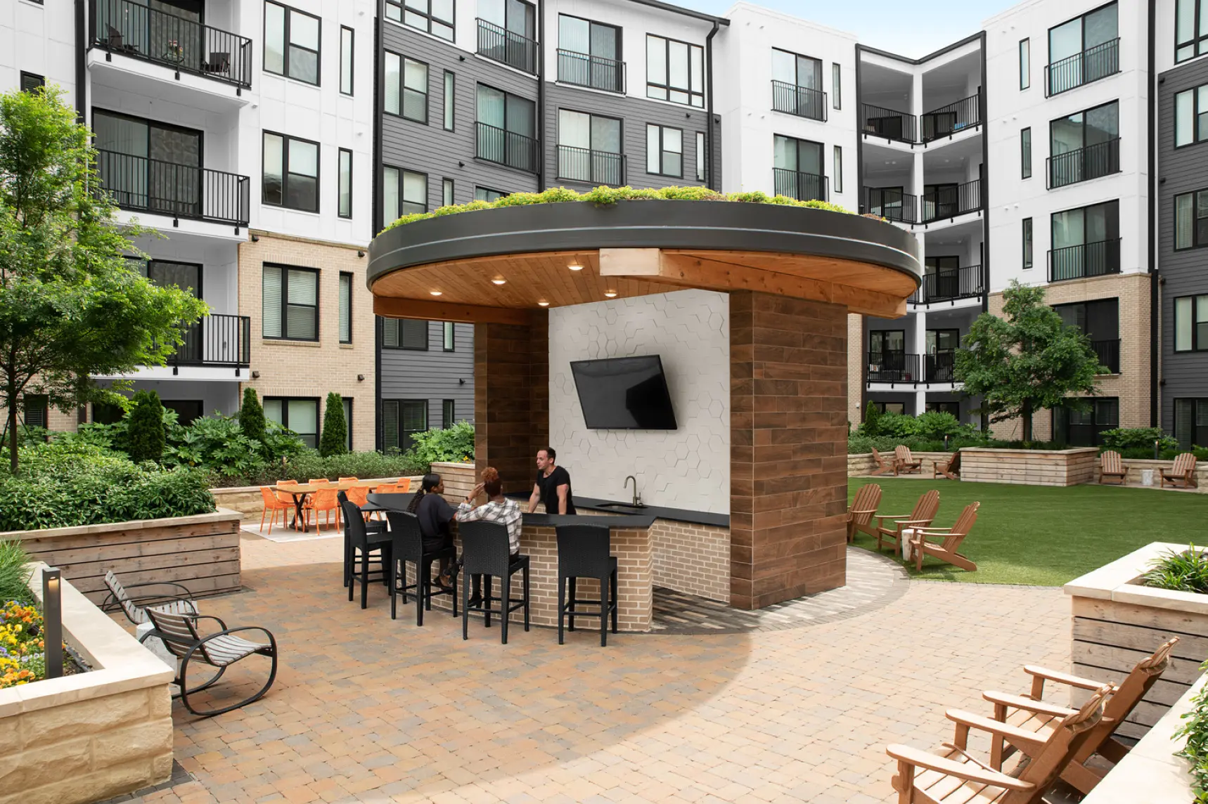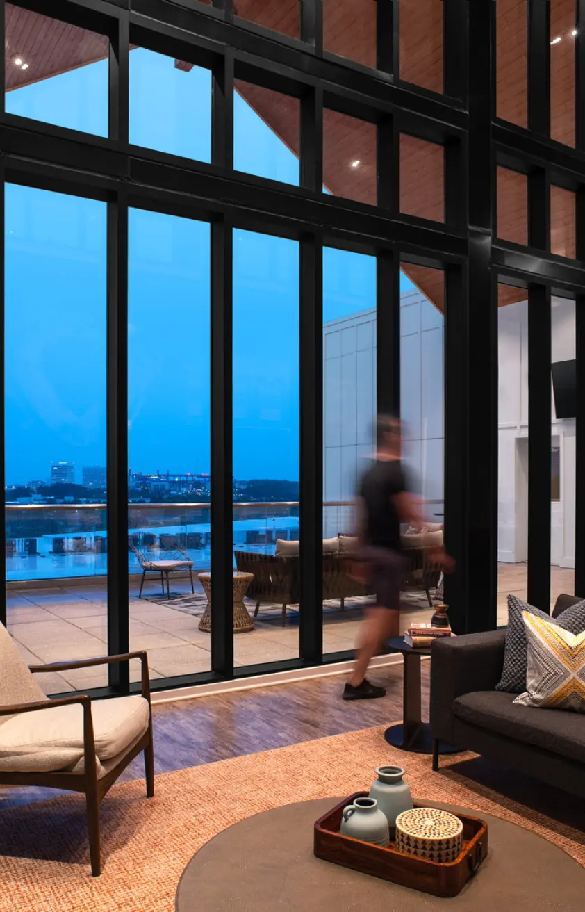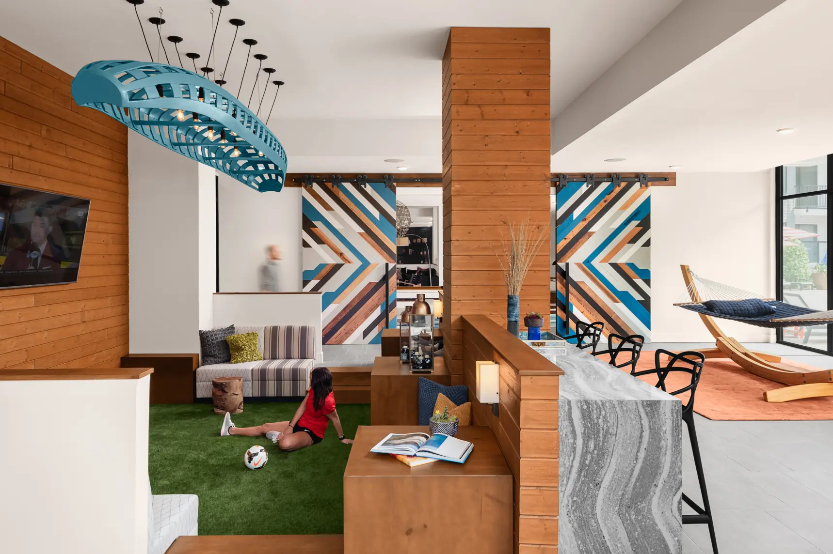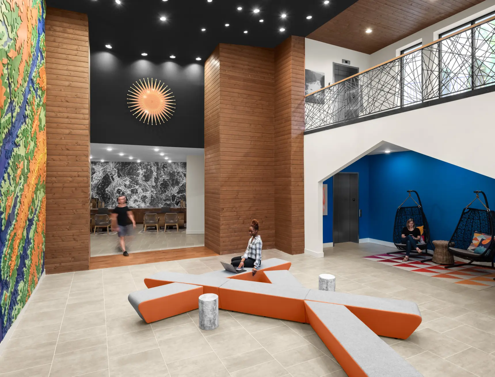 This five-story, luxury multifamily development (formerly Broadstone Ridge) is designed to accommodate active residents, featuring a large exercise area, bicycle storage and repair facilities, kayak storage, and incubator-style office space. The site, characterized by a significant slope, presented a unique challenge to create a cohesive connection between the varied communal spaces within the building and the dramatic central courtyard. This courtyard, designed with a 20-foot drop and waterfall, includes multiple lounge areas and spaces for recreational activities such as corn hole, whiffle ball, and bocce ball. Additionally, a top-floor lounge and terrace provide panoramic views of the skyline. The design prioritizes creating generous circulation pathways to seamlessly link the interior communal areas and the external surroundings, fostering a strong connection to the nearby Chattahoochee National Recreation Area and the Atlanta Braves stadium.