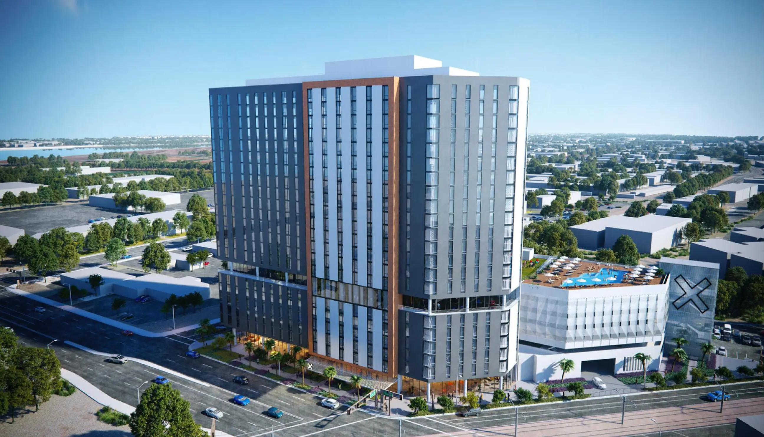 X Tempe is a twenty-one-story residential apartment building with 418 apartments (760 beds) paired with a six-level parking building in Tempe, Arizona. Nineteen residential levels sit above a ground level consisting of co-working, lounge and residential services. The sixth levels of the tower and parking structures are entirely amenity areas holding a large gym, restaurant and bar, and an expansive terrace which are open to the public.