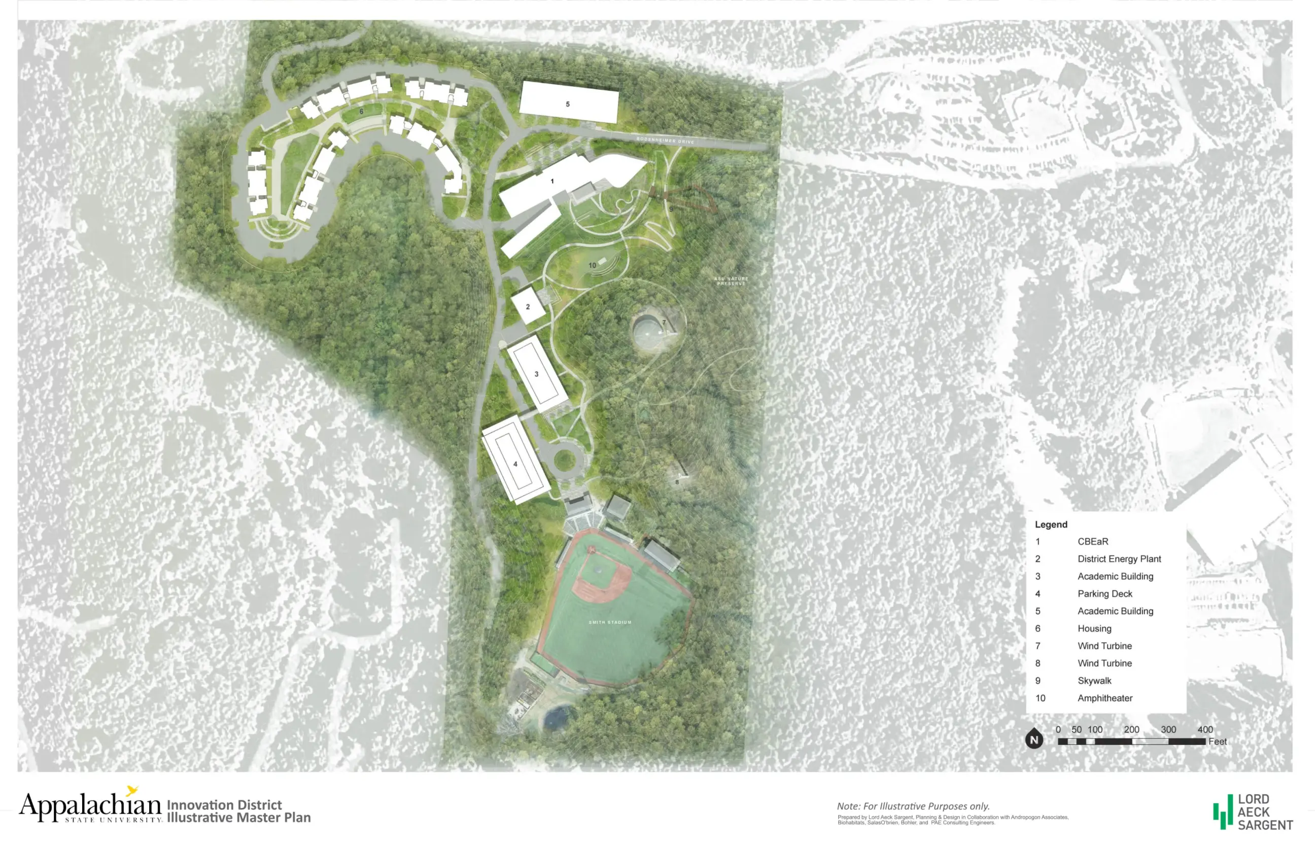 The Appalachian State University Innovation District master plan focused on the creation of a 28-acre learning district involving the synthesis of three main components: Buildings—including housing and three research and academic buildings; Energy—a district wide energy system with over 500 geothermal wells, 4 wind turbines, and a central energy plant; and, Site—the unifying element for the district consisting of performative native landscapes that will accent ASU’s “Campus in a Forest” identity and connect the district as a whole. Given the spatial constraints of the site and the spatial needs of these elements, a key element to this plan was an implementation framework that accounts for the synergies between these elements to allow for a holistic realization of the vision.
