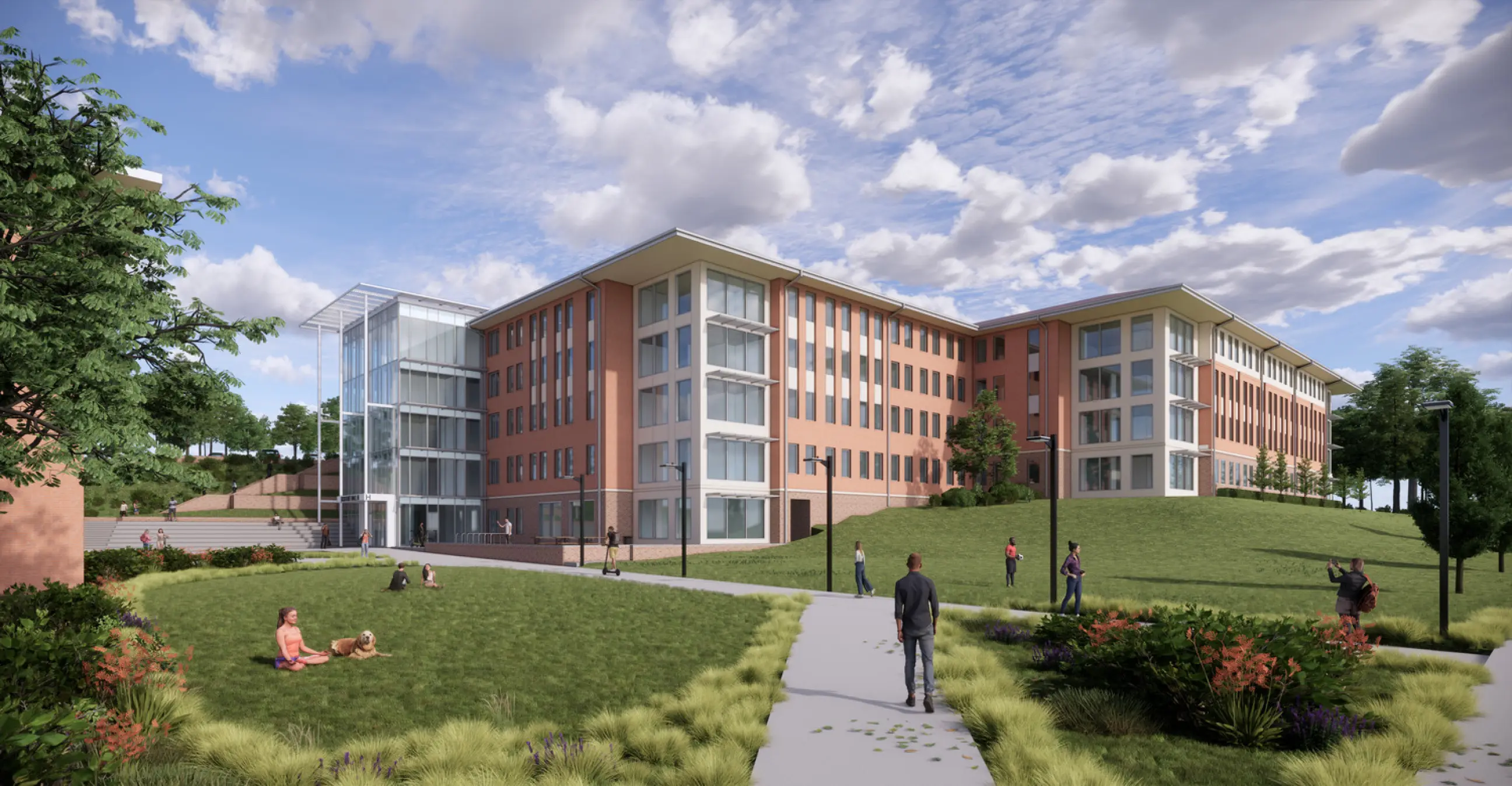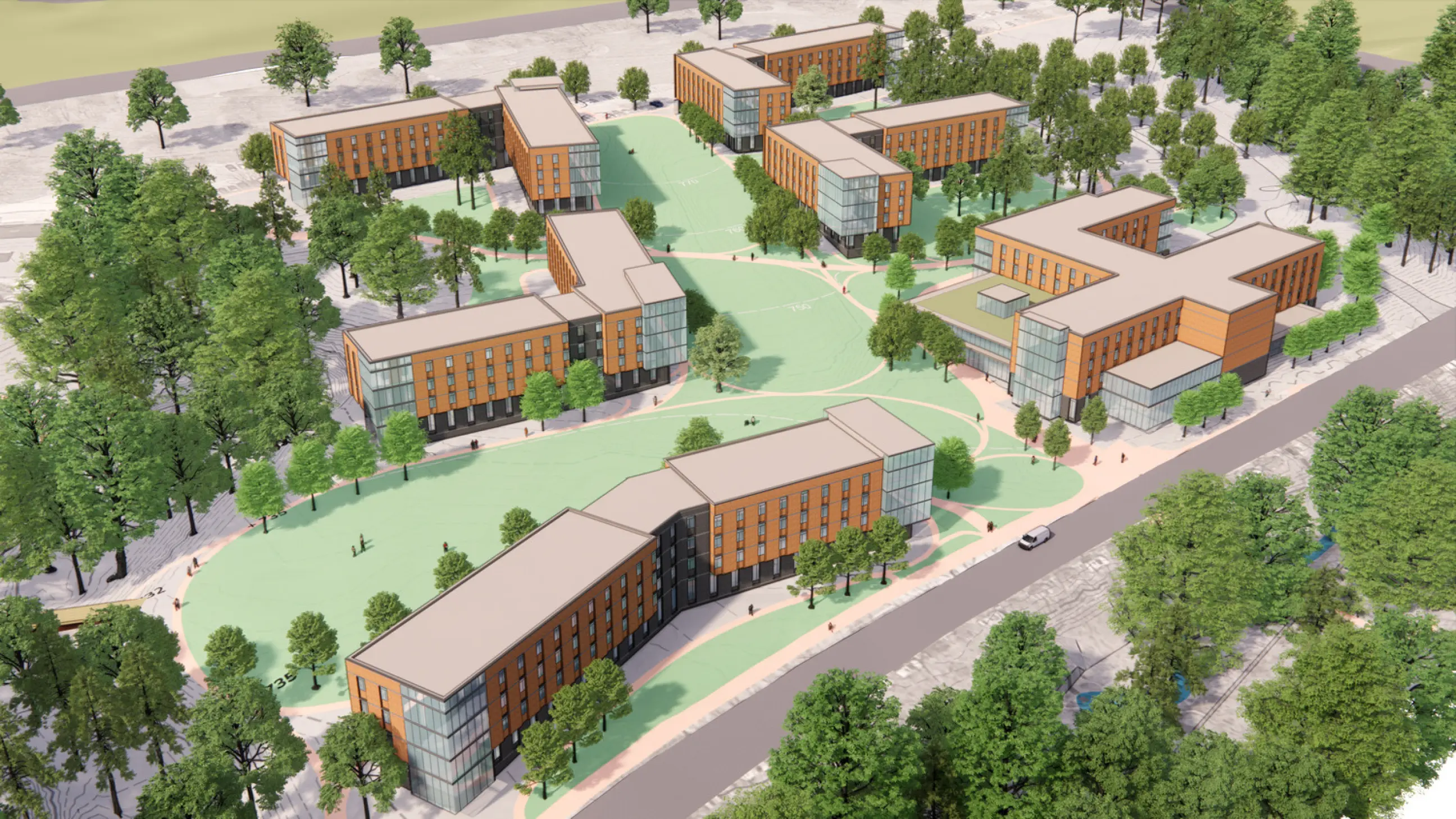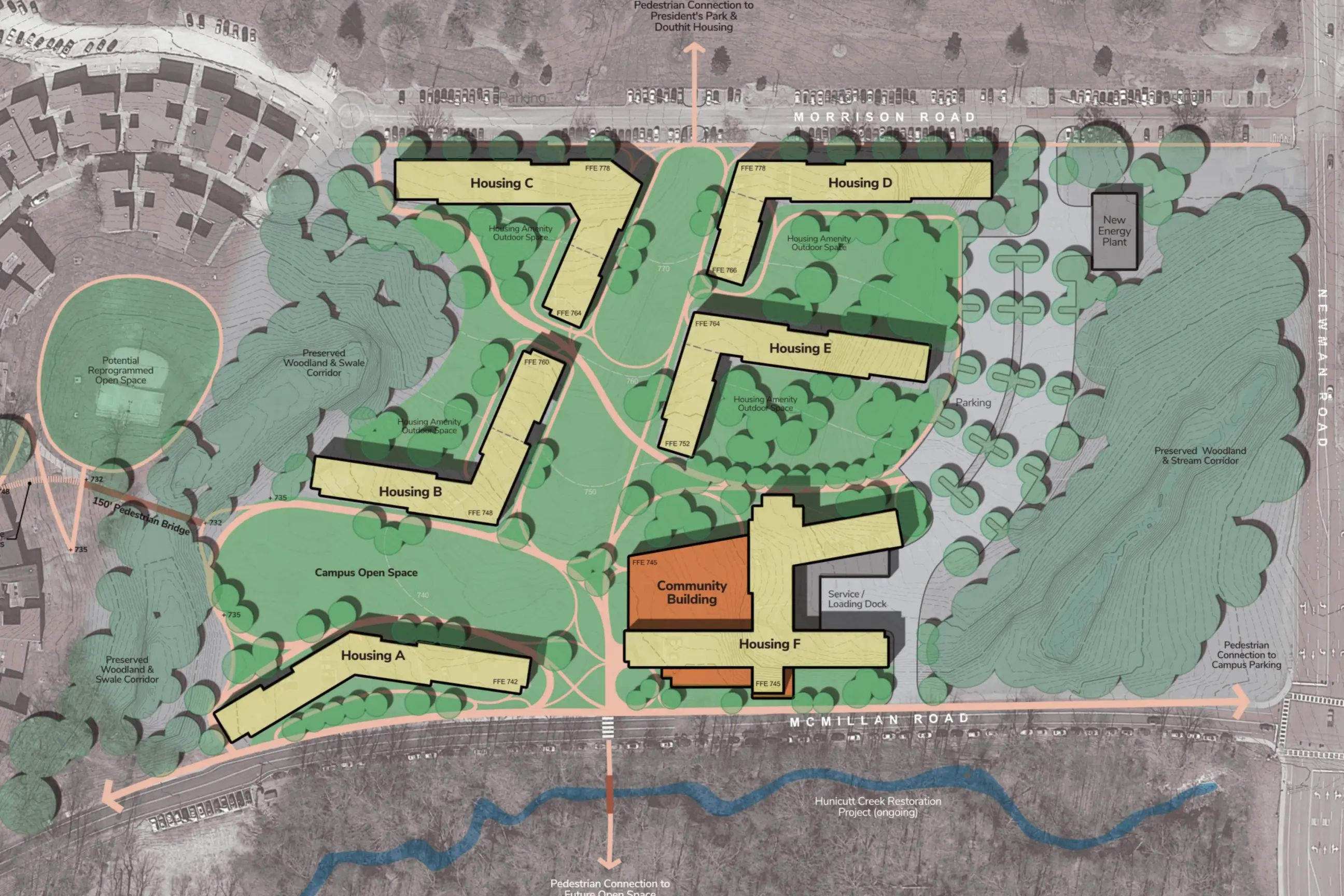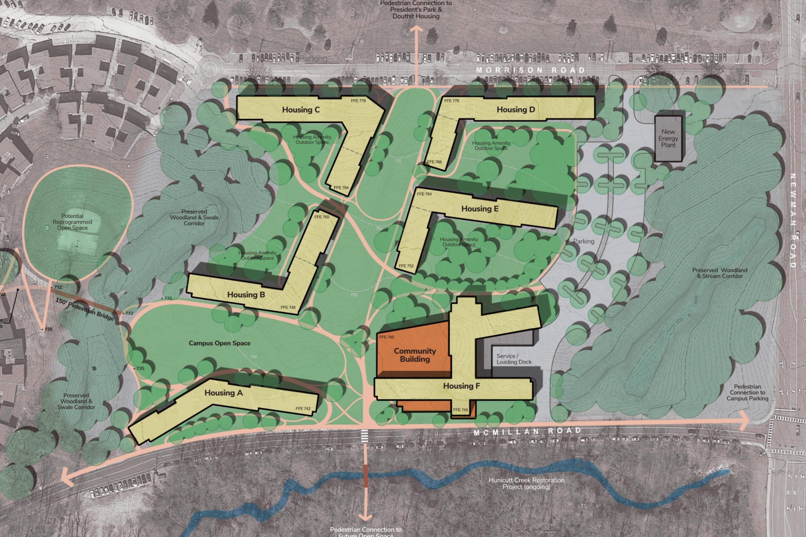 The Thornhill Village Housing and Dining Feasibility Study reimagines a low density precinct of one story structures into a vibrant residential community with five mid rise buildings, a Community Building, and an energy plant. The development will provide 2,130 revenue generating beds and 71 RA beds, with dining for 950 (plus 160 exterior seats), collaboration and meeting areas, and office space for Dining and Auxiliary Enterprises. Organized into RA groupings of 30 students per floor, the new housing is designed as a connected, park like setting that fosters community, integrates with the broader campus, and serves as a major expansion of first year housing capacity.
