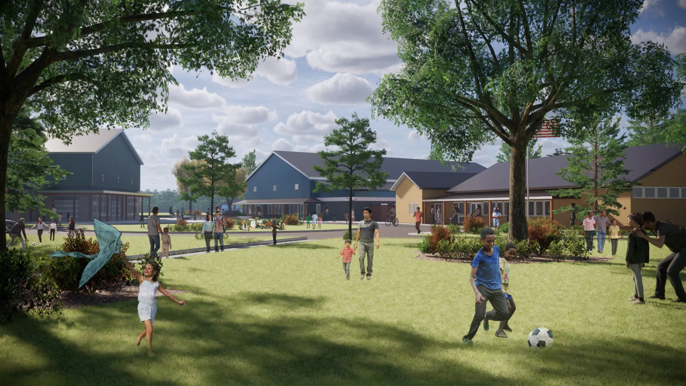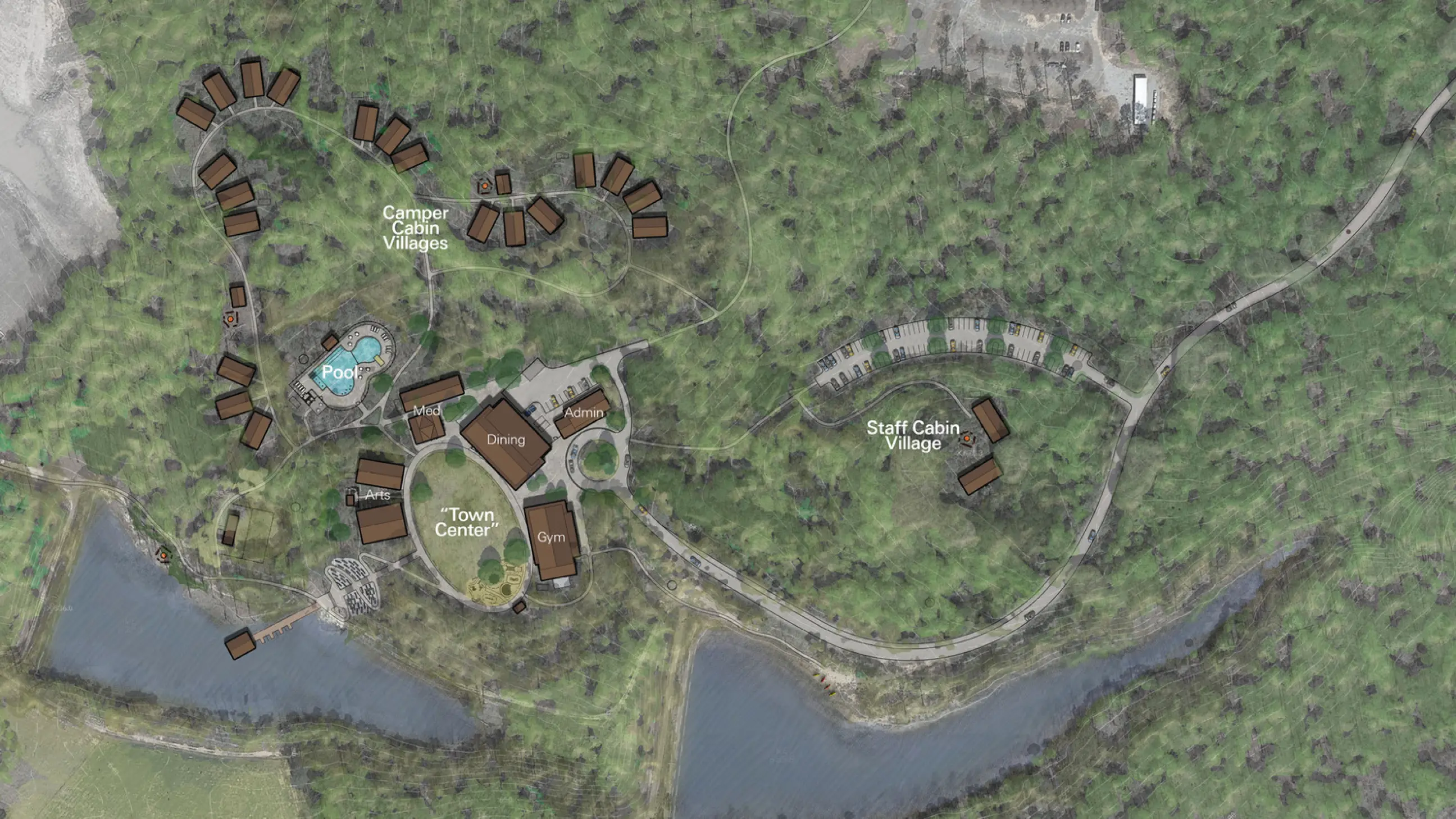 The primary organizing element, a large active oval, situates the supporting buildings into the landscape. The expansion’s facilities will include dining for 300 campers, a large gymnasium, outdoor athletic spaces, light medical services, spaces dedicated to arts-focusedcurriculum, guest staff housing, a swimming pool customized to campers with life challenges, an outdoor water activity center, a terraced gathering space with views to the lakes, and 20 new camper cabins designed for maximum flexibility and future growth.