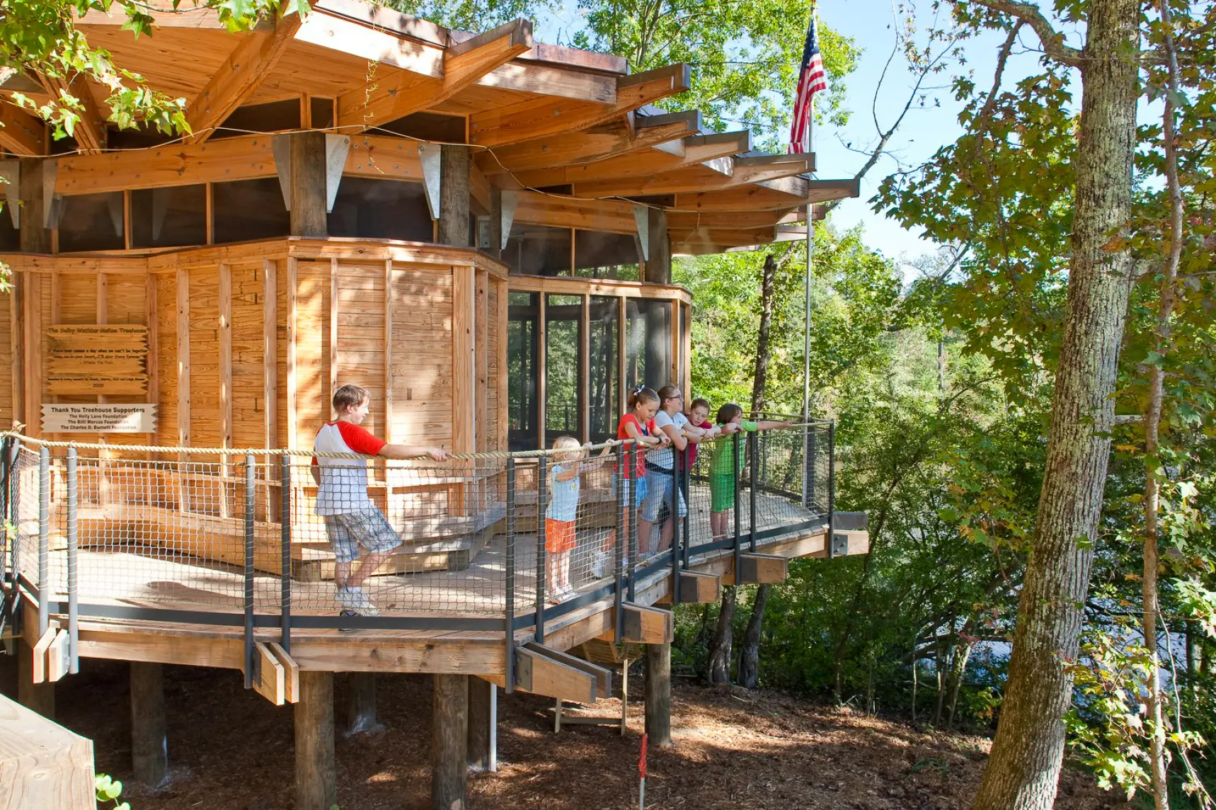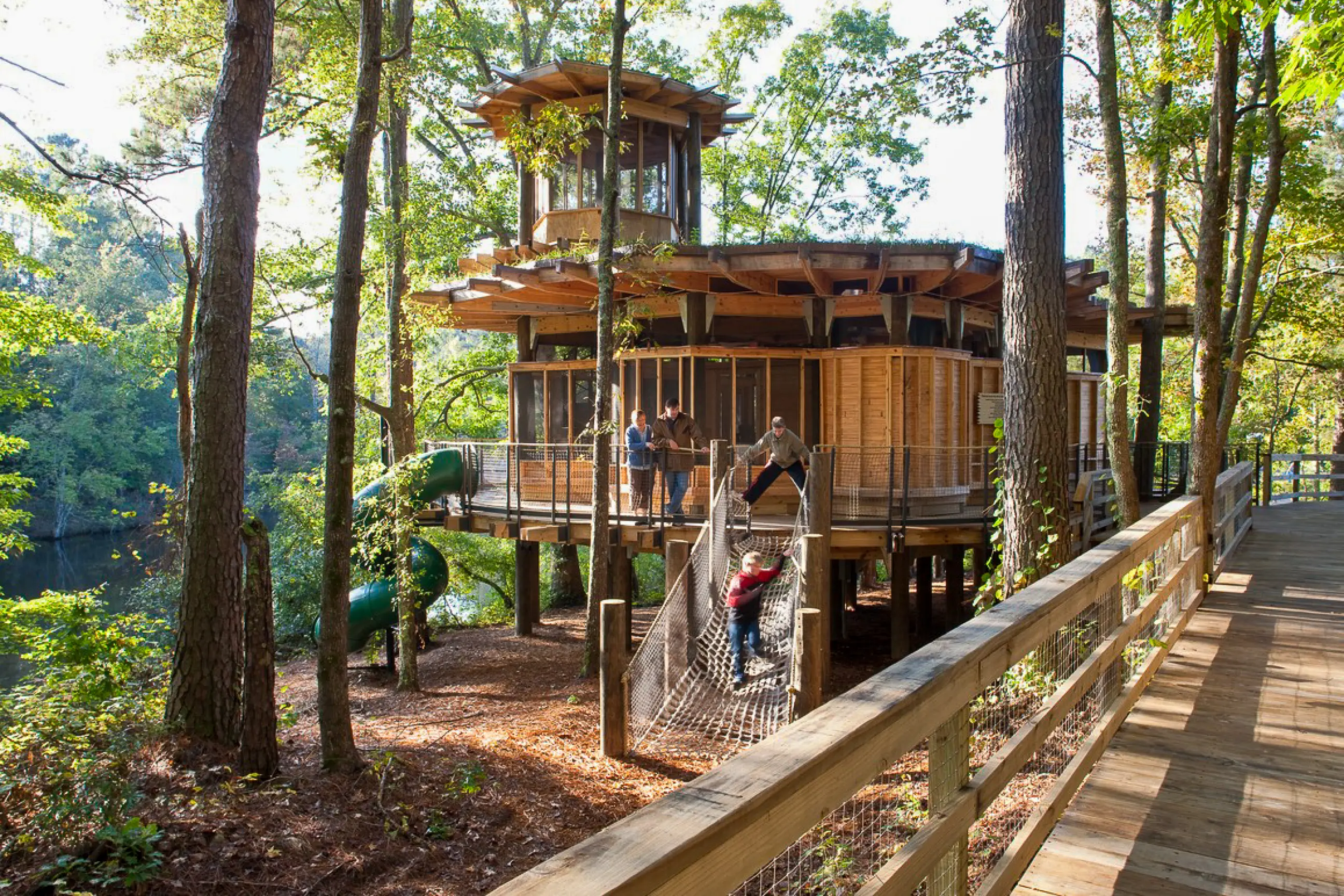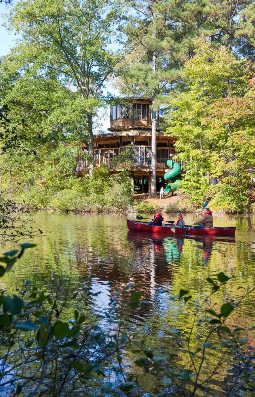 Lord Aeck Sargent's design for Selby's Treehouse at Camp Twin Lakes was thoughtfully developed to ensure accessibility for children facing serious illnesses and disabilities. Situated near one of the camp’s lakes, the treehouse provides a fully wheelchair-accessible experience through a curved wooden boardwalk that leads to a raised deck 15 feet off the ground. The structure is seamlessly integrated into the natural environment, allowing campers to feel as though they are surrounded by nature. Inside, the octagonal main space is used for environmental arts and crafts, while several smaller areas support a range of activities, such as drumming, storytelling, and small group discussions. The design also incorporates sustainable features, including the use of Southern yellow pine, a solar power system, composting toilets, and a green roof, all of which reinforce the camp’s mission of connecting children with nature while minimizing environmental impact.