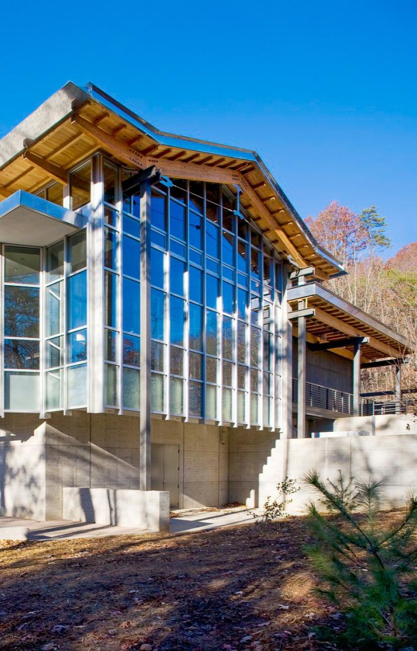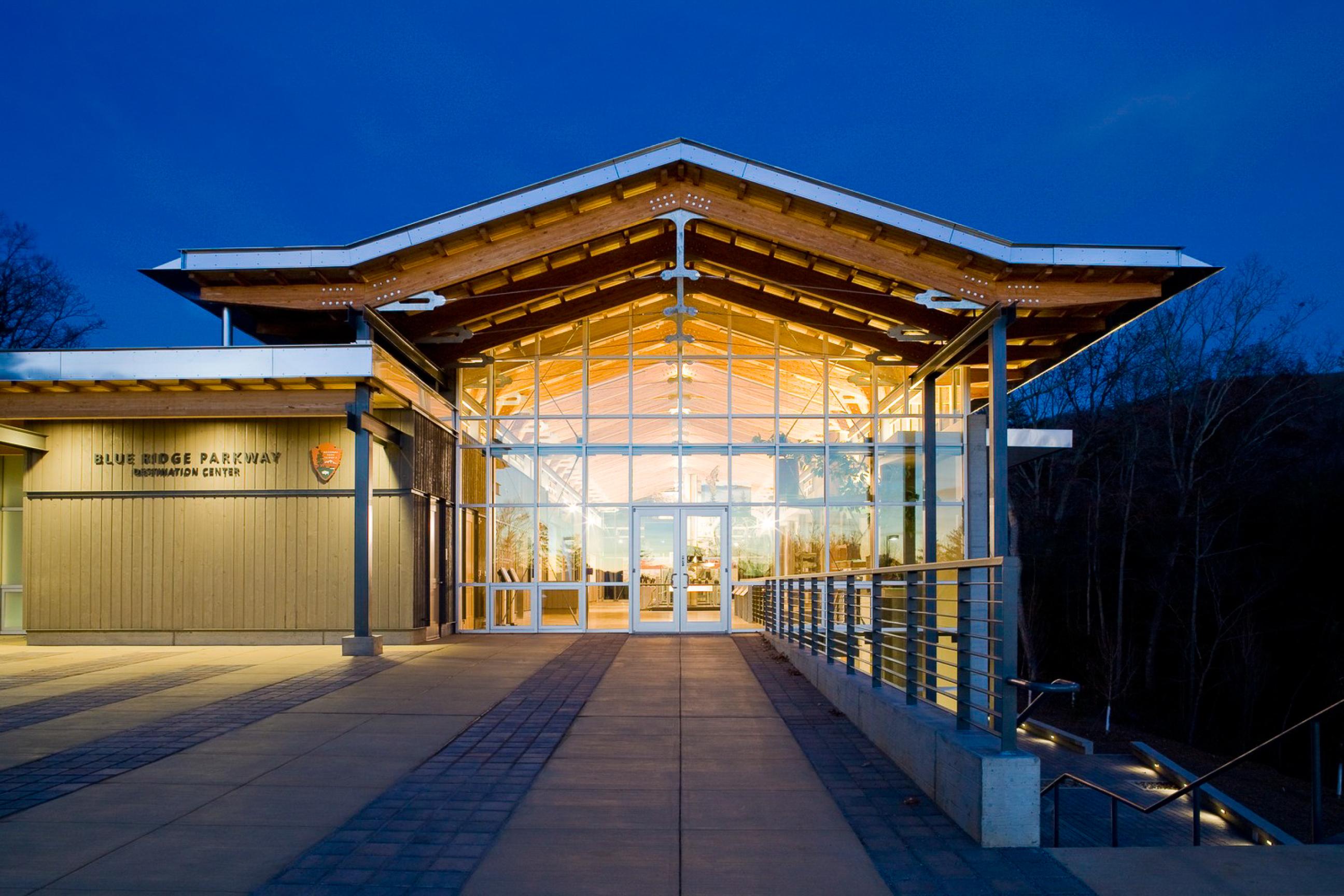 The Blue Ridge Parkway Visitor Center, developed in partnership with the National Park Service, serves as a gateway to the rich cultural and historical landscape of the Parkway, which stretches from Shenandoah National Park to the Great Smoky Mountains. The design of the building draws from the region’s architectural vernacular, inspired by the traditional barns and shelters found throughout the Blue Ridge Mountains. Set into the hillside near Asheville, the center evokes a “tree-house” atmosphere, allowing visitors to immerse themselves in the scenic woodlands and majestic vistas that define the Parkway experience. The interior of the Visitor Center includes exhibit spaces that reflect the heritage, development, and cultural significance of the Parkway, as well as regional orientation areas and an immersive digital theater showcasing high-definition films of the area’s natural beauty. The building's careful placement and material choices emphasize a strong connection to the cultural and historical context of the region, blending modern design with a deep respect for the Appalachian landscape and its enduring cultural traditions.