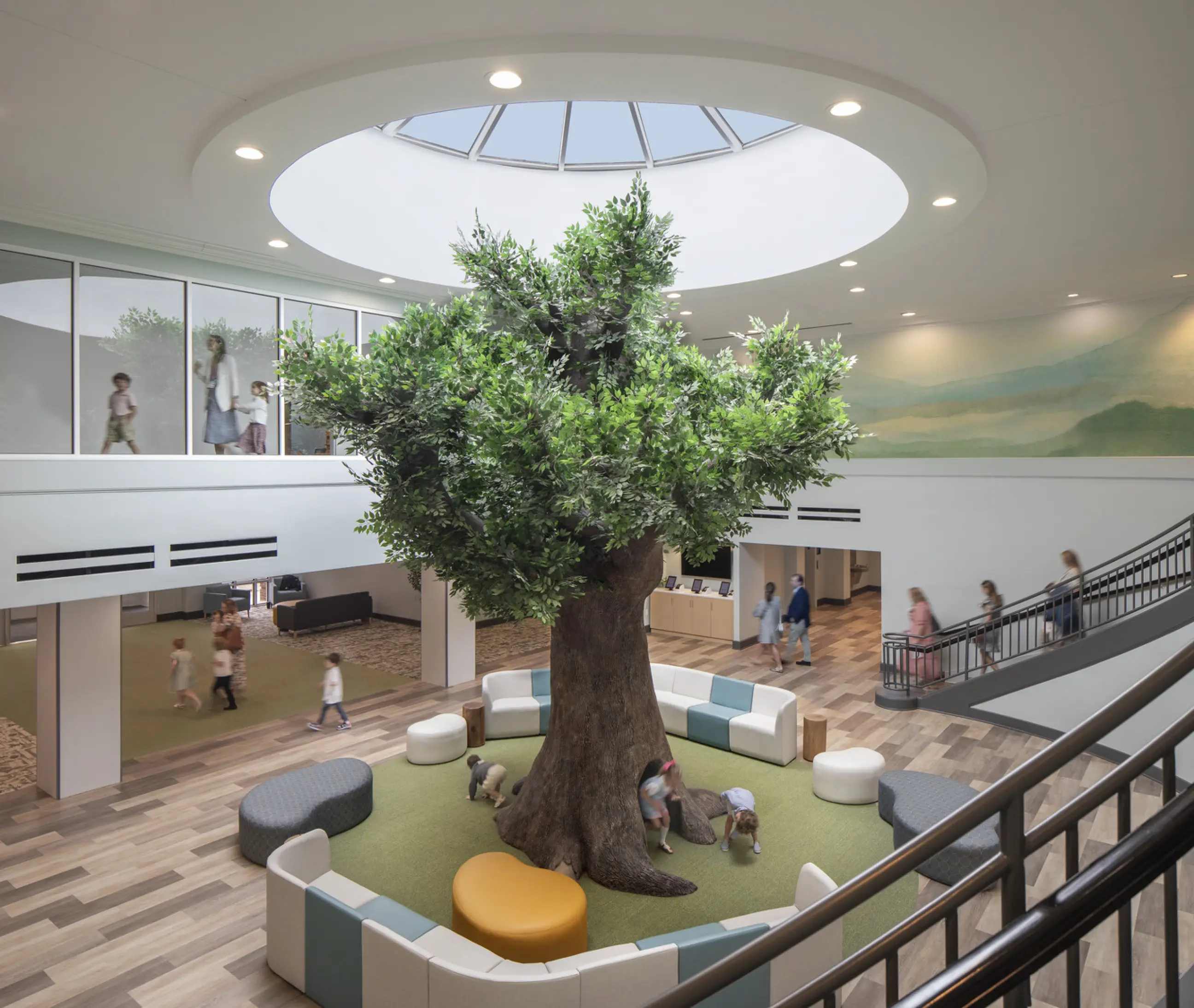 Church offices, previously spread across the campus, were consolidated into a single double-height space to promote collaboration among staff. Spaces for children and youth were renovated to meet programmatic needs, including larger spaces for various cohorts to gather for shared experiences located adjacent to smaller break-out rooms for small group discussion.