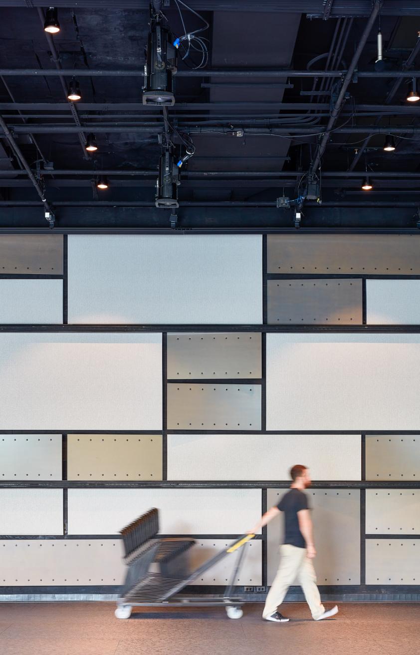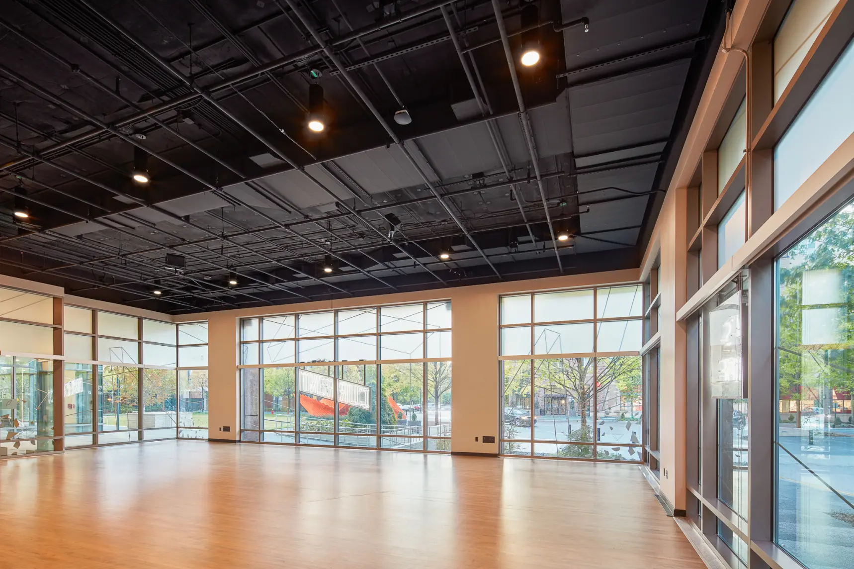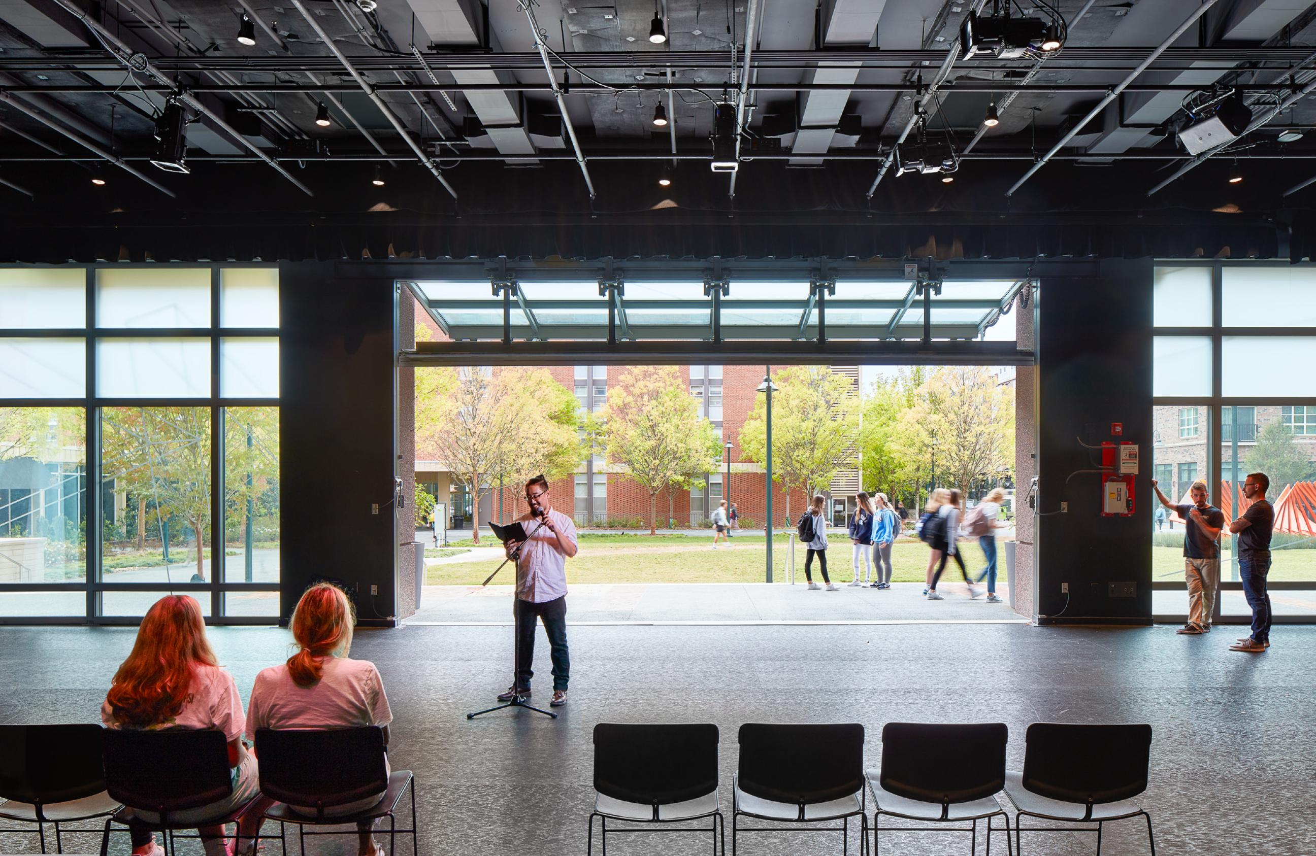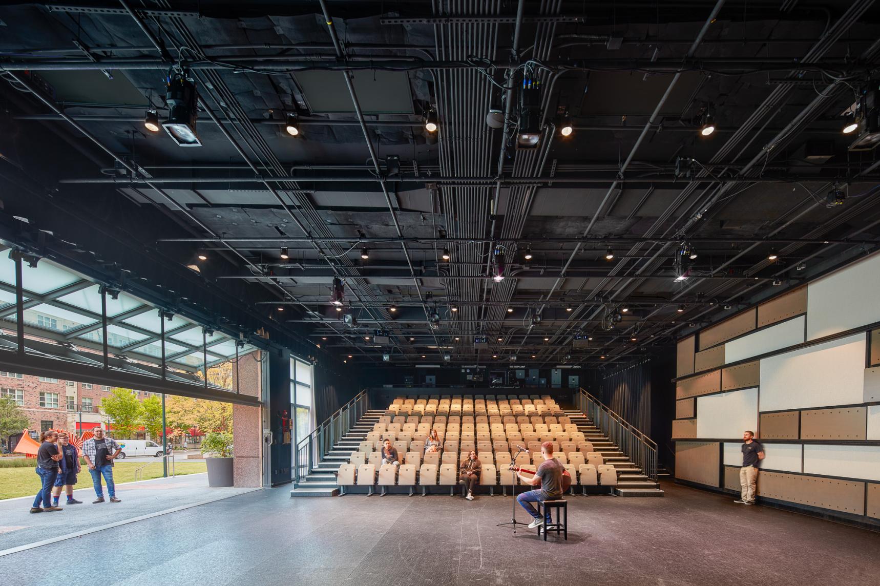 The CURRENT ArtSpace + Studio in Chapel Hill, NC, is a cutting-edge venue designed to house Carolina Performing Arts’ experimental arts programs, situated in the heart of the Carolina Square development. This 4,000-square-foot space serves as a flexible black box theater, with innovative architectural features aimed at facilitating a wide range of performance configurations. The theater includes a 25-foot-wide operable wall that opens onto a public plaza, blurring the boundaries between indoor and outdoor spaces, while a prominent glass façade makes activities inside visible to passersby. A distinctive angled feature wall enhances acoustic performance and provides a visual focal point. Paired with a 2,300-square-foot dance studio, the venue is purposefully designed to be adaptable, supporting various forms of performance art while maintaining visibility to the public. The design responds to the need for an immersive, intimate environment, with retractable seating allowing for multiple stage configurations. This integration of public engagement, artistic flexibility, and performance-driven architectural elements reflects the collaborative effort between the University, the town, and Lord Aeck Sargent, aiming to create a versatile and community-focused cultural hub.
