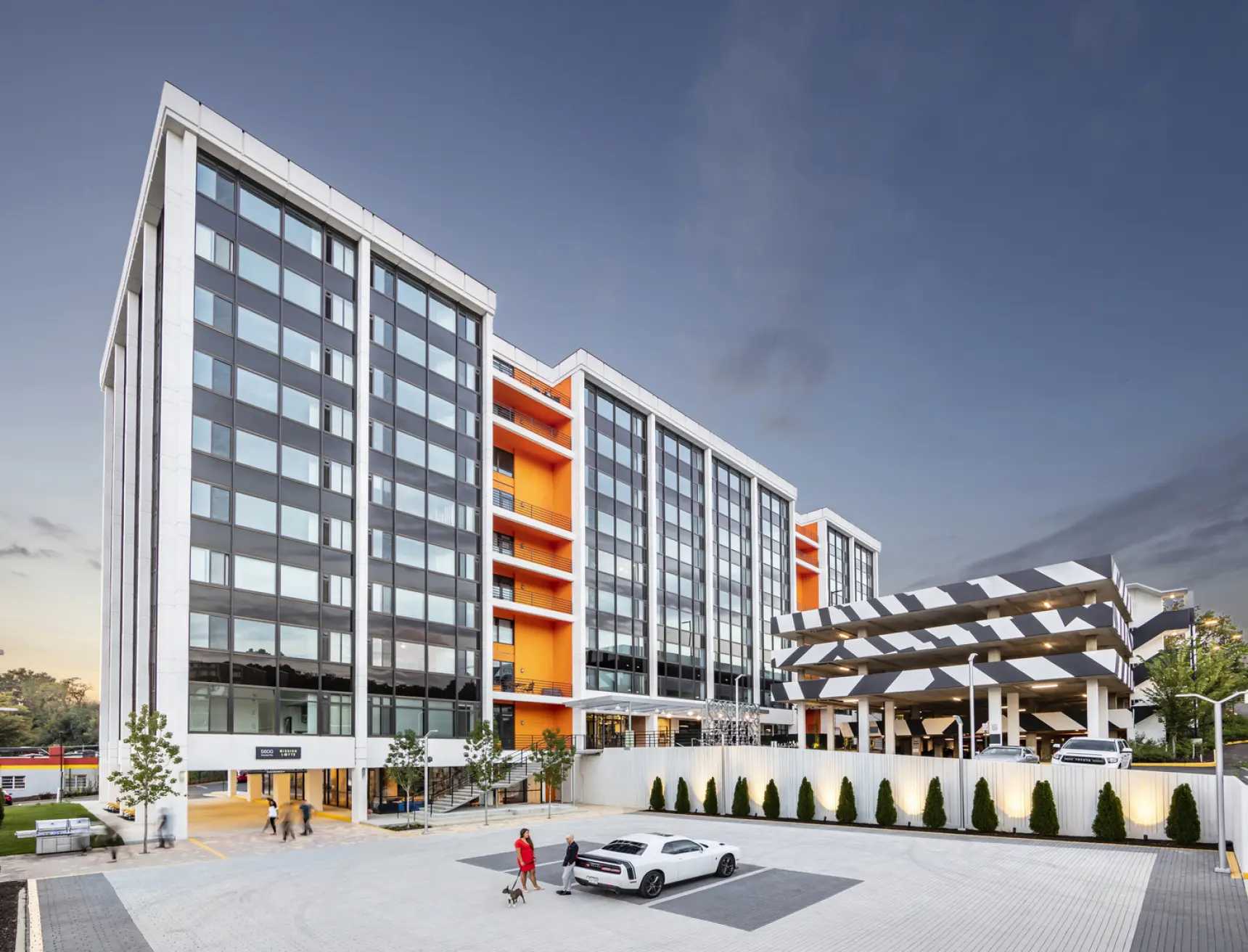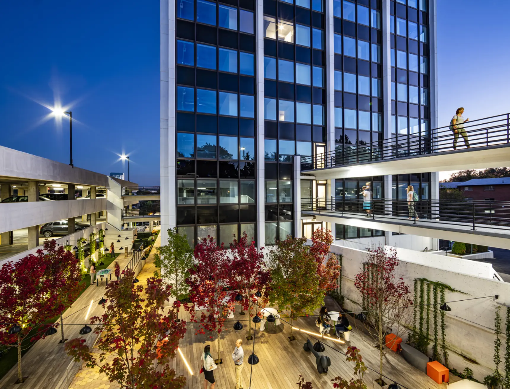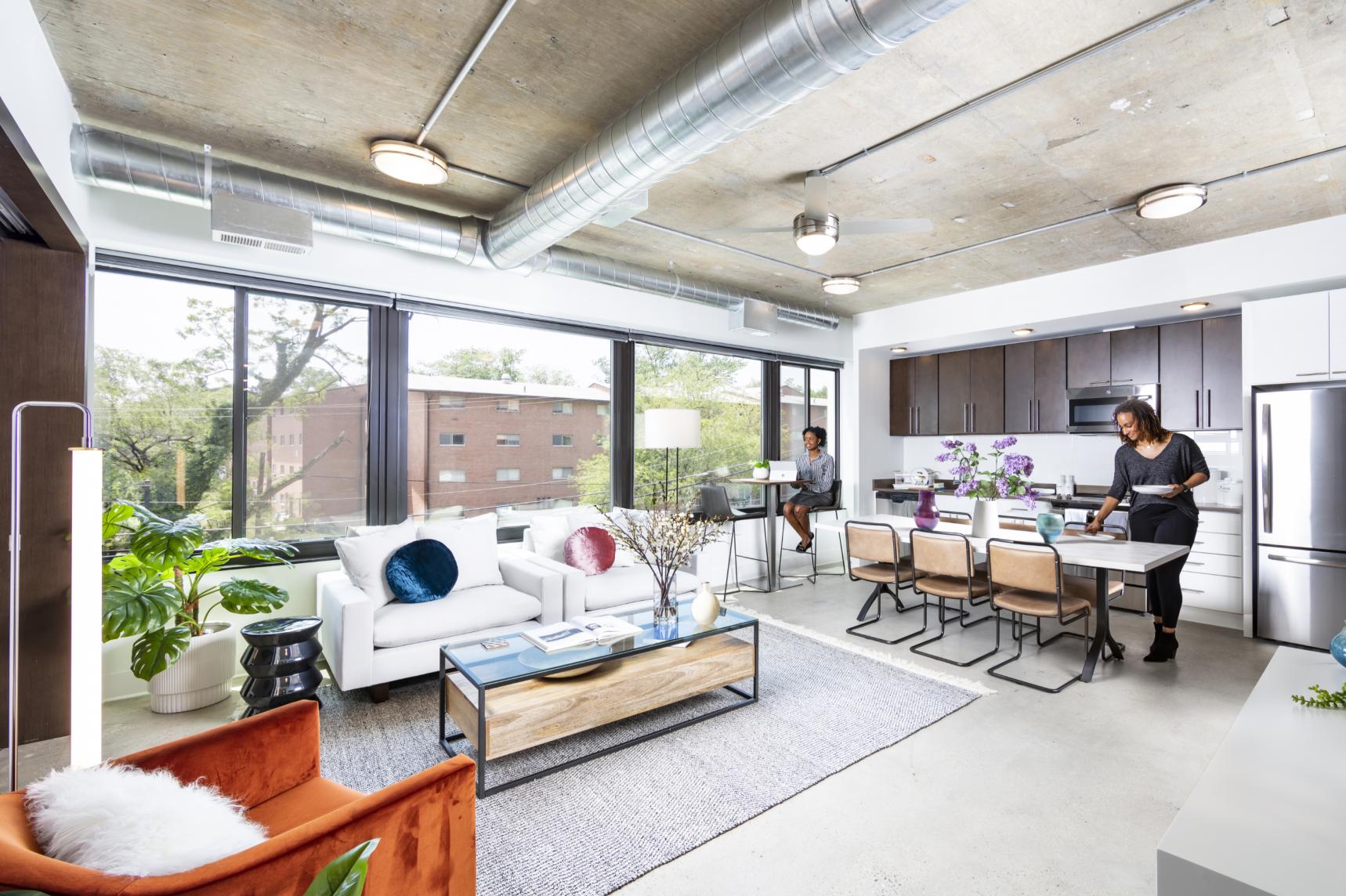 The Mission Lofts project at 5600 Columbia Pike in Fairfax County, Virginia, involved the adaptive reuse and renovation of a ten-story, 50-year-old office building into a vibrant mixed-use development comprising 156 high-end live/work units. The building's existing features, such as tall ceilings, large windows, and a concrete frame, were leveraged to support the live/work functionality. Key modifications included exposed concrete floors and ceilings, transforming a former mechanical pump room into a fitness center, and replacing surface parking with a wildflower meadow to enhance biodiversity. The design incorporated exterior courtyards, sundecks, conference rooms, varied workspaces, a community kitchen, fitness center, music practice rooms, and a dog wash, creating a variety of spaces for tenants to live, work, and socialize.