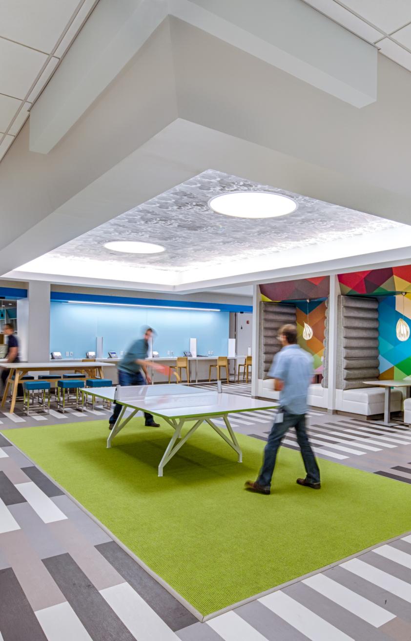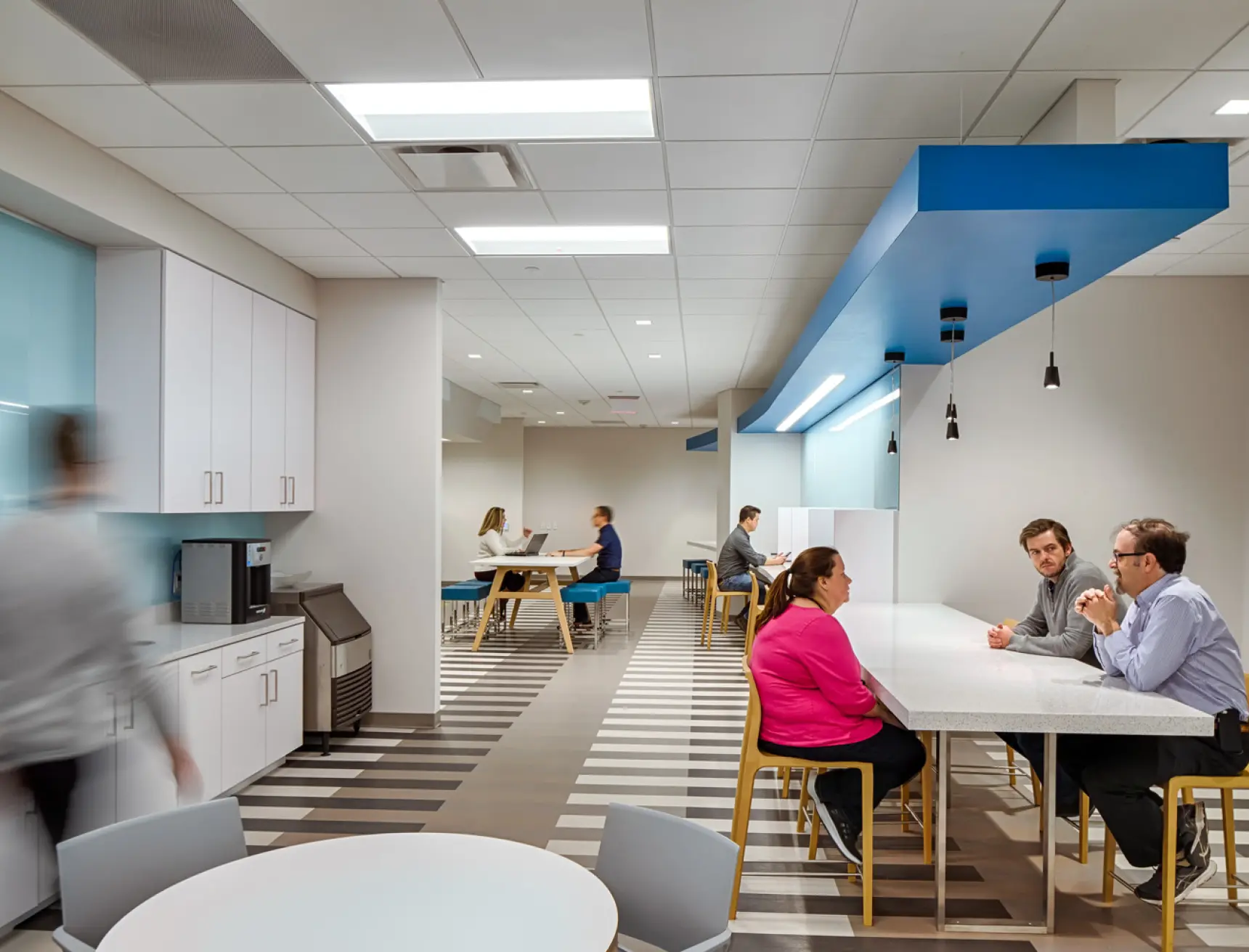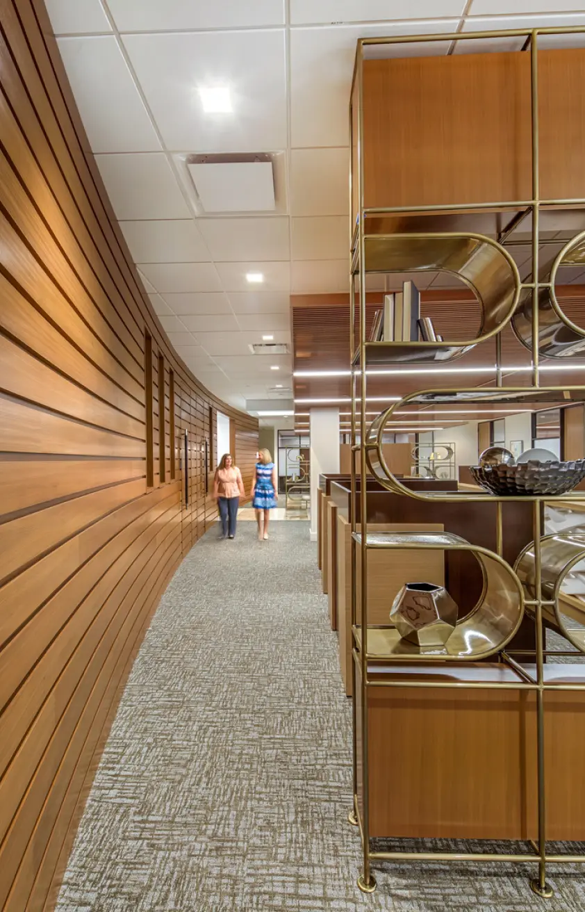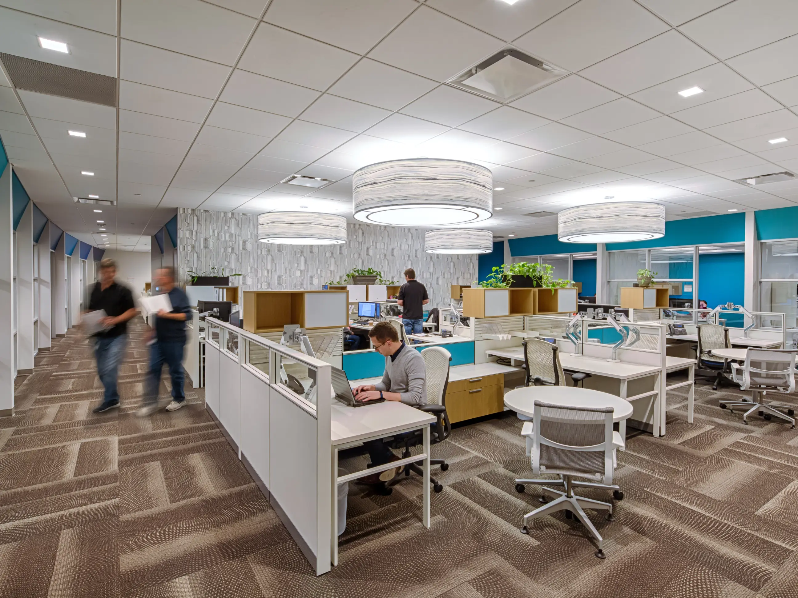 The Perimeter Park management office was envisioned as a dynamic and collaborative hub that reflects the corporate brand and fosters employee engagement. With an open office layout, workstations are centrally placed, surrounded by private offices behind curving glass walls. A spacious communal hub with food service and informal seating areas serves as the heart of the office, promoting casual interactions and collaborative meetings. The design merges contemporary workplace trends with inviting elements, such as drum-like light fixtures that add warmth and intimacy. Anodized aluminum storefront systems at office fronts impart a sleek, high-tech aesthetic, enhanced by gradating accent colors above each office, creating visual intrigue. This office space caters to current workforce needs and aims to attract and retain top talent by providing a modern, comfortable environment. The thoughtful integration of anodized aluminum accents and strategically placed lighting fixtures ensures that the space is both functional and aesthetically pleasing. This project exemplifies how innovative design can transform an office into a vibrant, collaborative space that aligns with a company's values and enhances employee satisfaction.