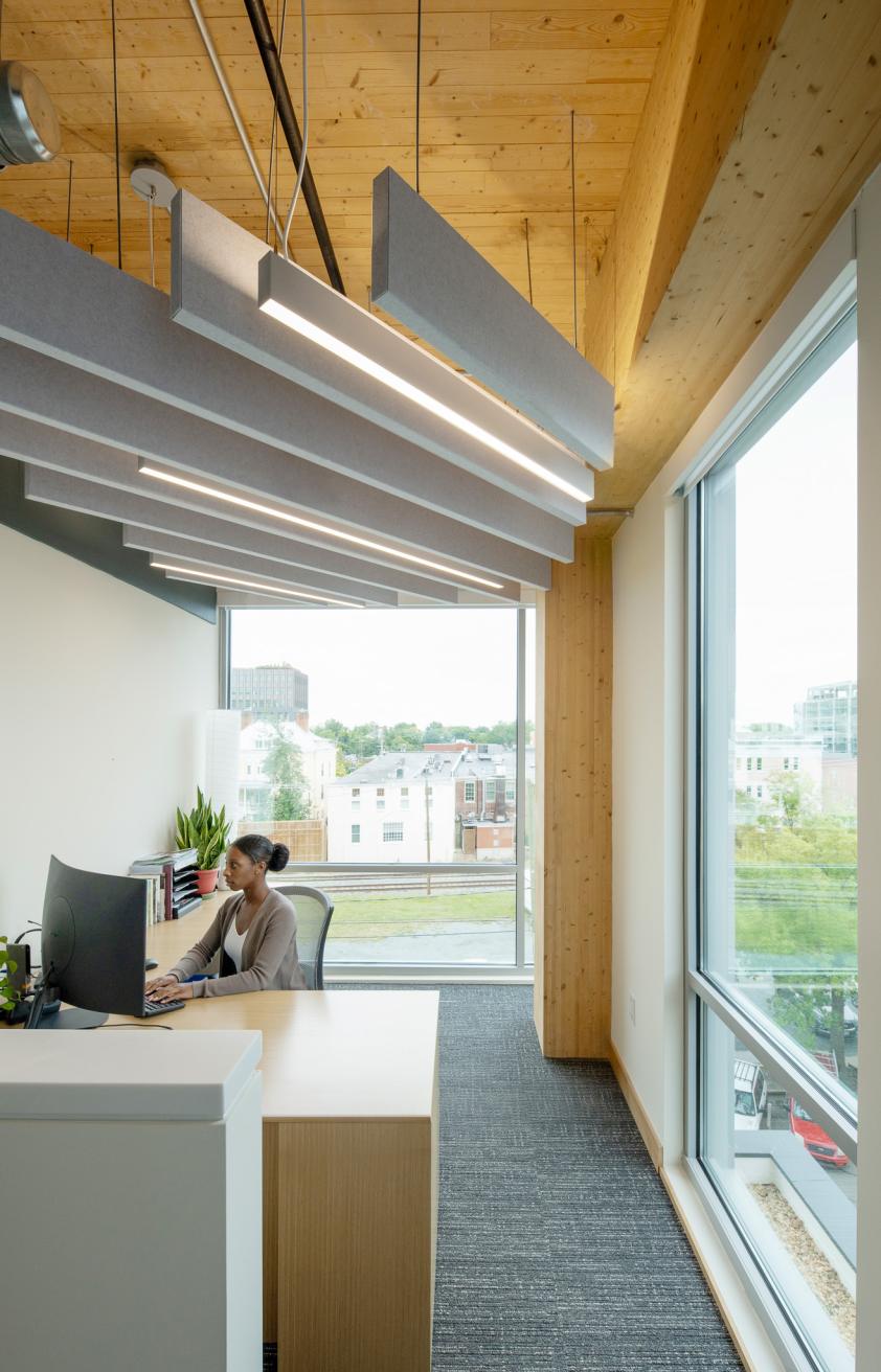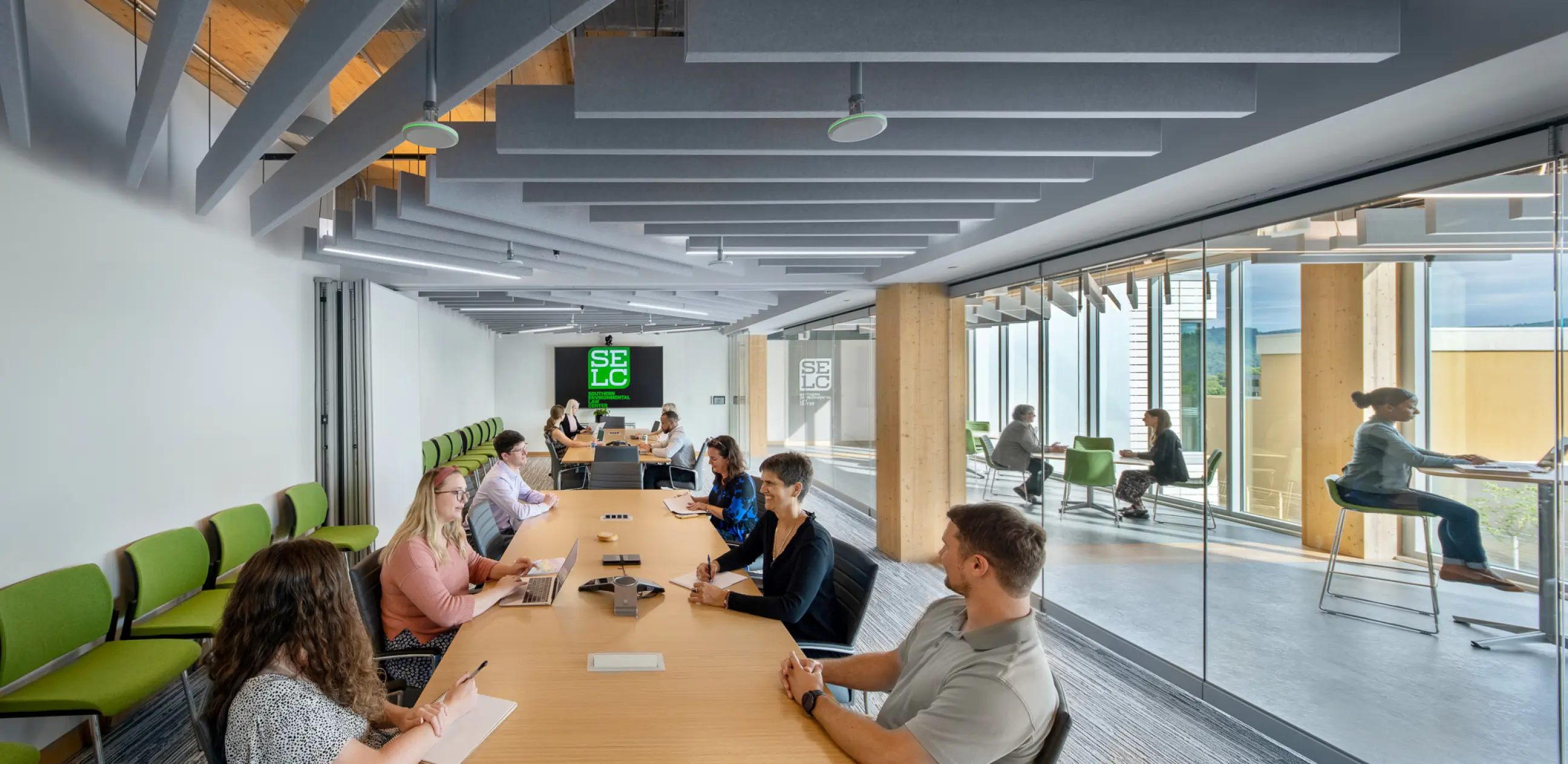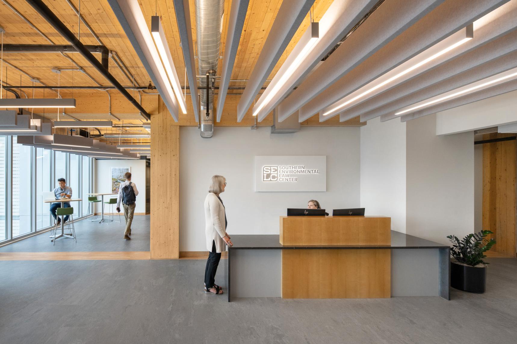 The Southern Environmental Law Center’s new regional headquarters in Charlottesville, Virginia, is a thoughtfully designed office space occupying the entire fourth floor of a recently constructed mass timber building. This 27,000-square-foot space showcases the building's primary structural elements, including mass timber columns, ceilings, and concrete floor slabs, to create a modern, low-maintenance environment. The interior design emphasizes open, collaborative workspaces with flexible layouts to support teamwork and future growth. Additionally, the headquarters includes well-equipped conference rooms, informal meeting areas, and amenities such as bike storage and shower facilities, promoting a healthy work-life balance for employees.