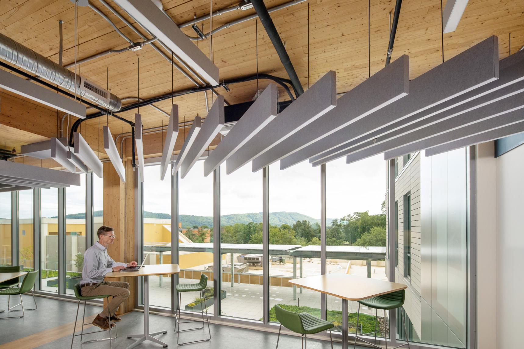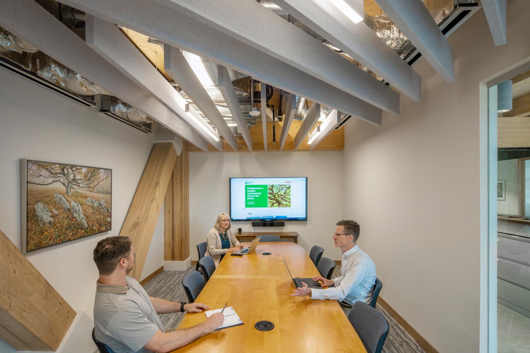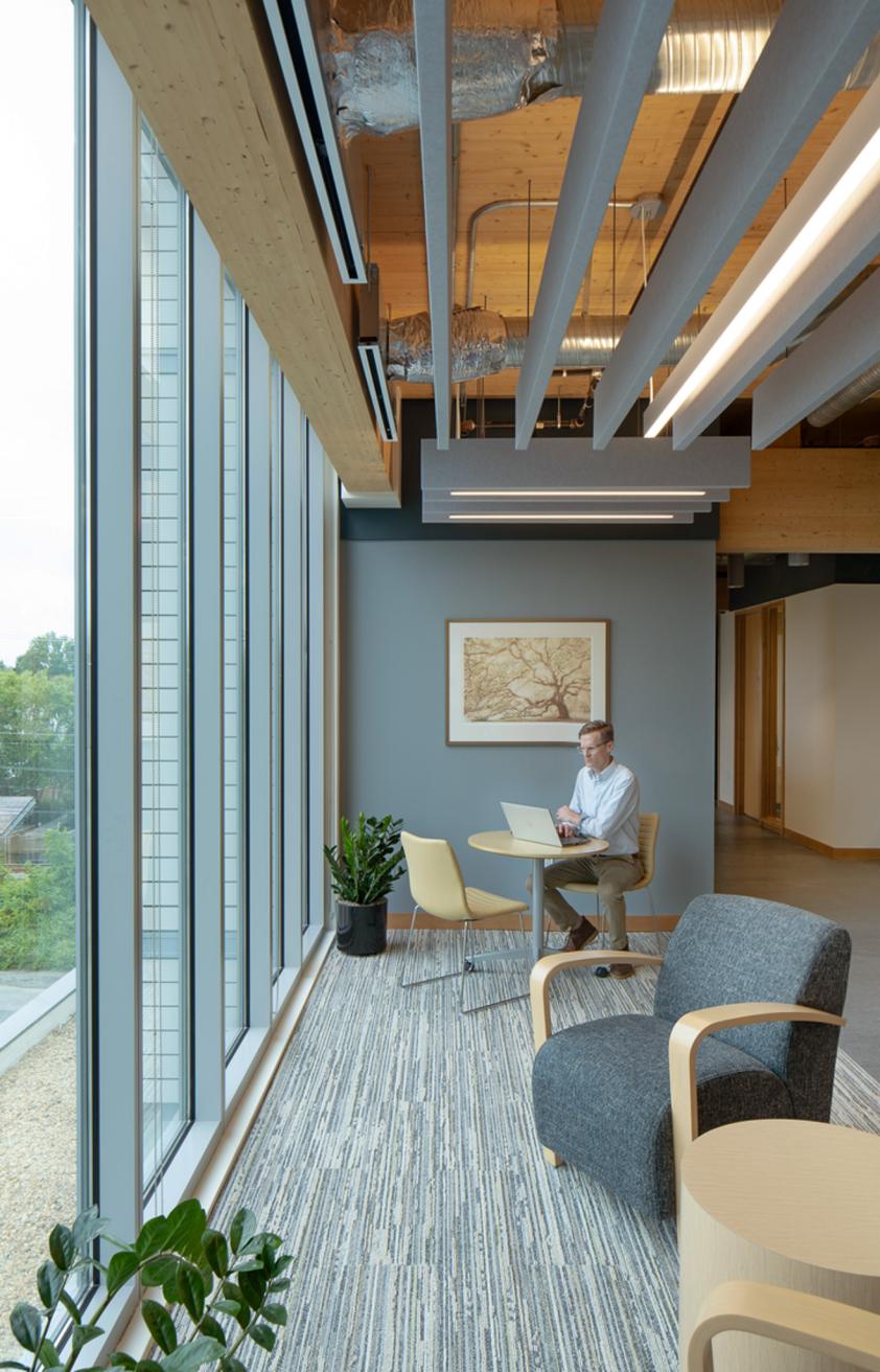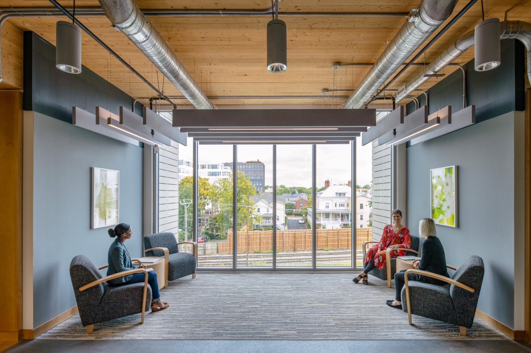 The Southern Environmental Law Center’s new regional headquarters in Charlottesville, Virginia, is a thoughtfully designed office space occupying the entire fourth floor of a recently constructed mass timber building. This 27,000-square-foot space showcases the building's primary structural elements, including mass timber columns, ceilings, and concrete floor slabs, to create a modern, low-maintenance environment. The interior design emphasizes open, collaborative workspaces with flexible layouts to support teamwork and future growth. Additionally, the headquarters includes well-equipped conference rooms, informal meeting areas, and amenities such as bike storage and shower facilities, promoting a healthy work-life balance for employees.