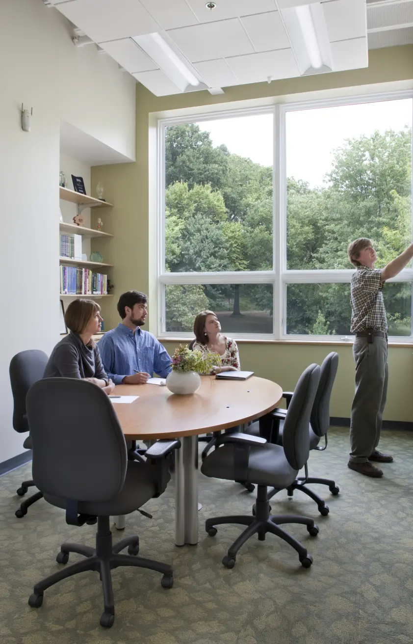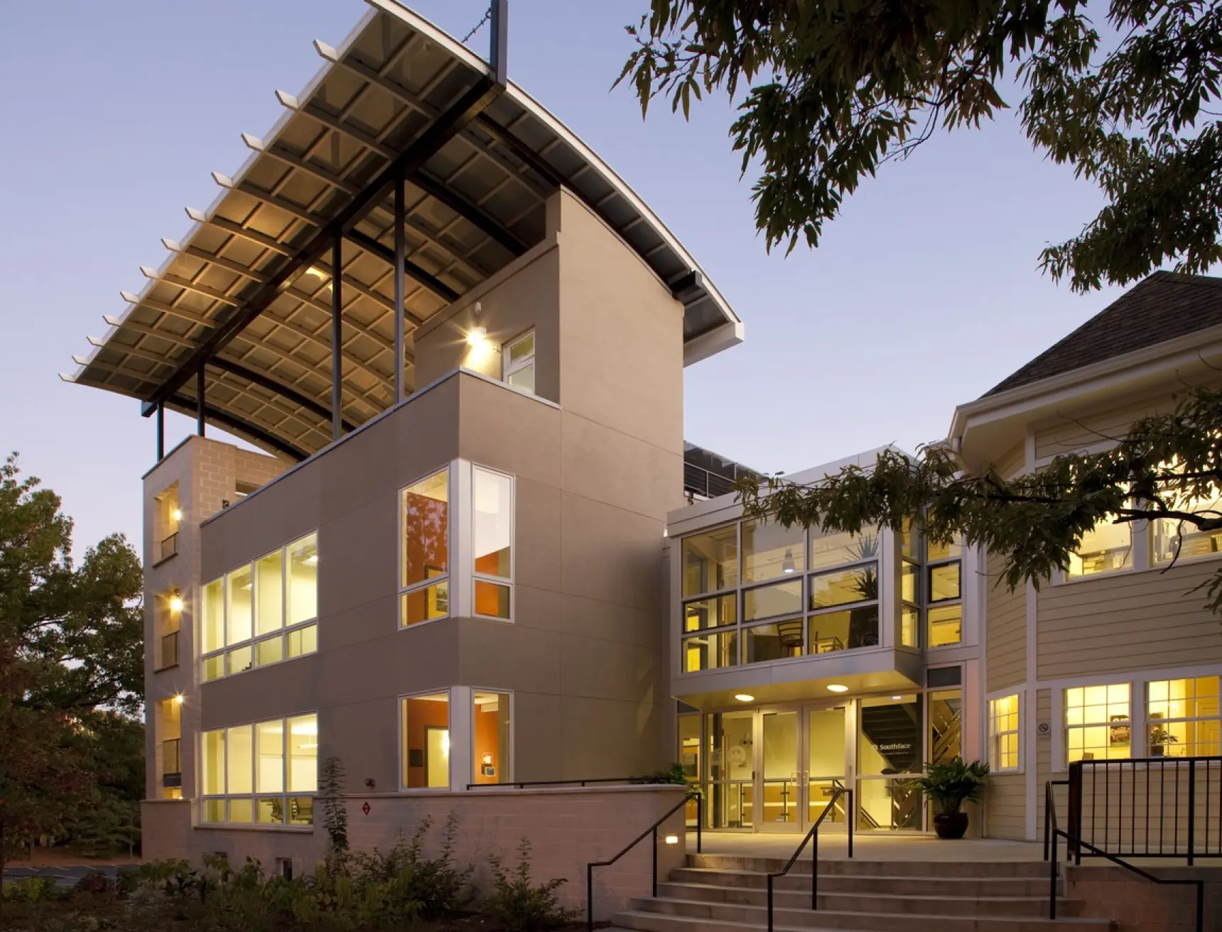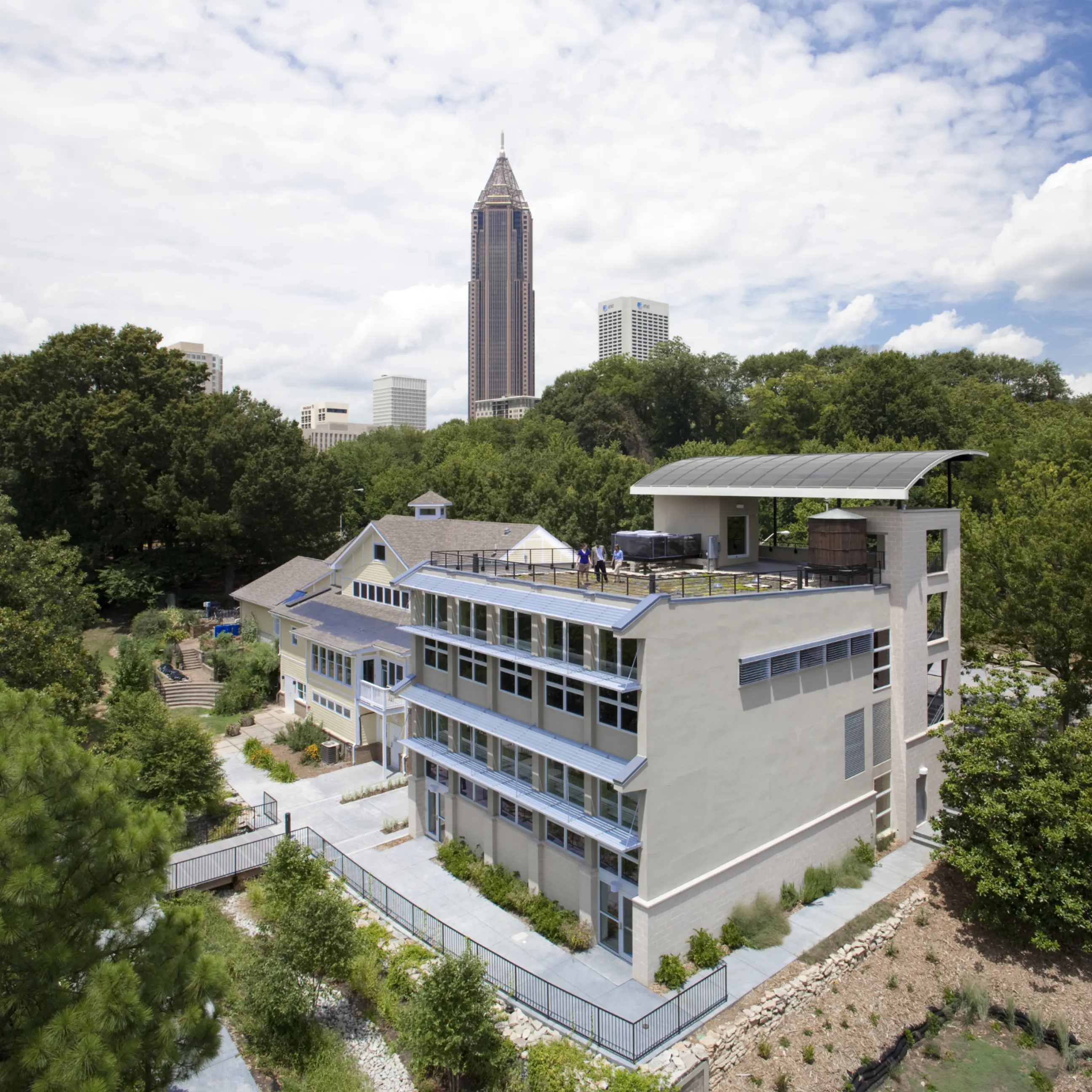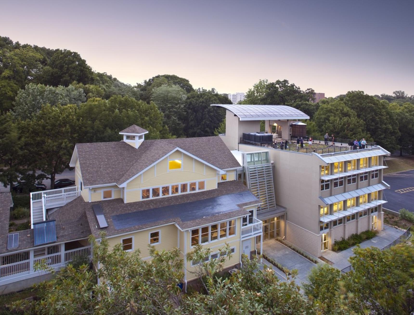 Lord Aeck Sargent designed the Southface Eco Office as a state-of-the-art commercial facility adjacent to Southface's Resource Center. The office includes well-equipped classrooms, modern office spaces, and versatile conference areas. Its design emphasizes functionality and flexibility, catering to various professional needs and fostering a collaborative work environment. The building features advanced technological integrations for enhanced productivity, including high-speed internet, audio-visual systems in conference rooms, and ergonomic office furniture. The facility supports dynamic use, with spaces designed for both formal meetings and informal interactions, making it a vibrant hub for Southface's educational, research, and advocacy activities. Additionally, the Eco Office serves as an exemplary green demonstration building, showcasing innovative environmental design and construction practices. It provides a practical example of high-performance commercial building solutions, seamlessly integrating functional areas with the natural surroundings through a whole-systems approach. Beyond its role as a functional workspace, the Eco Office acts as an educational resource, offering insights into sustainable building practices through tours, classes, and an accessible online performance dashboard. This project demonstrates a commitment to creating an efficient, versatile, and environmentally responsible workspace that supports the diverse needs of Southface's staff and visitors.