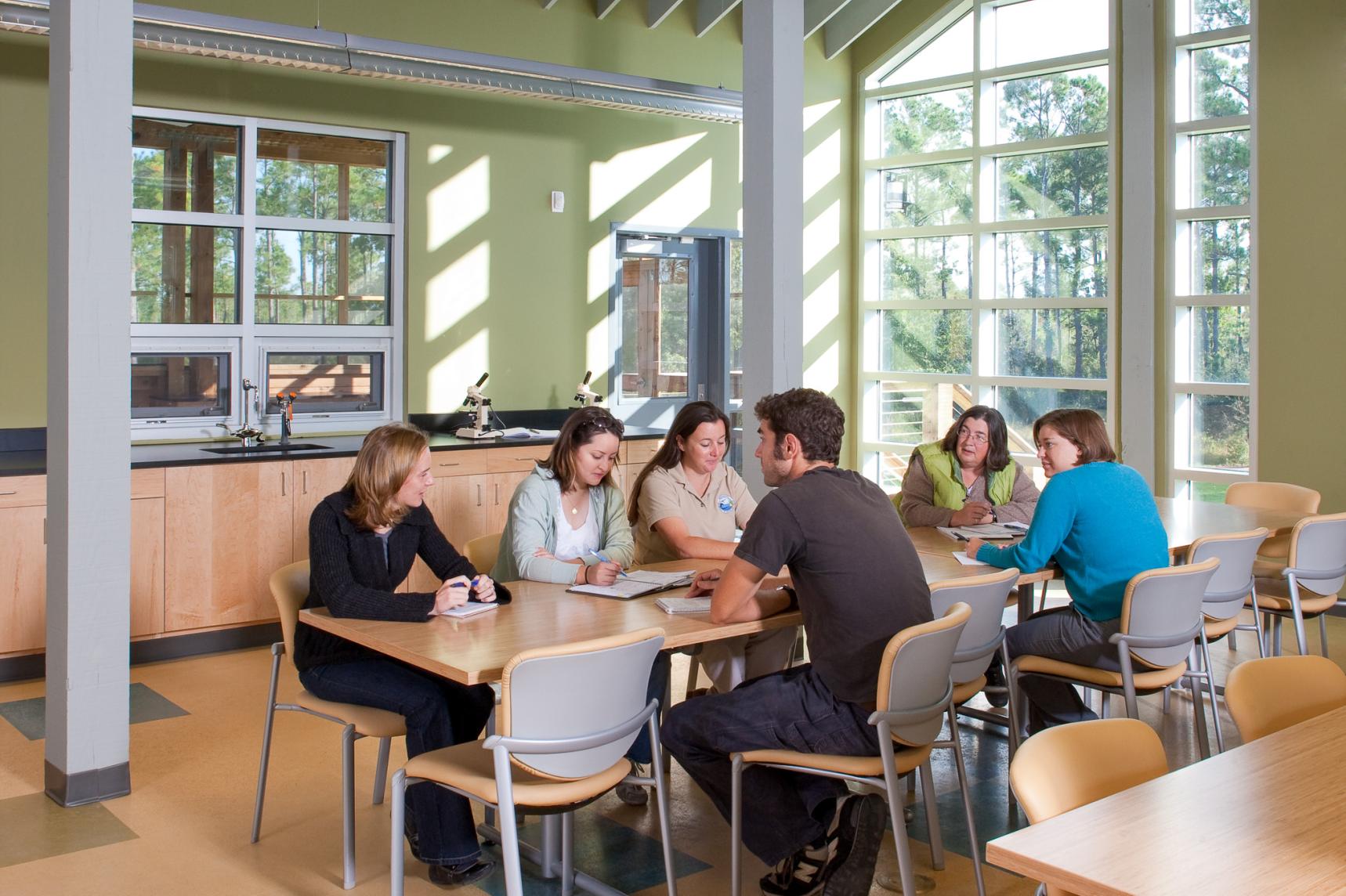The project’s design was inspired by the traditional coastal vernacular and features an elevated structure, deep overhangs, shutters, screened-in porches, and boardwalks. With its remote location in a hurricane-prone area, where power can be interrupted for extended periods, Passive Survivability was a key design driver. Extensive daylighting (daylit area 86%) and operable windows with insect screens for passive ventilation not only reduce energy use (project 40% reduction, ASHRAE 90.1-1999), but also make the building habitable when power is interrupted. The roof forms were oriented to support the future installation of a PV array. With nitrogen loading from failing septic a key threat to the surrounding estuary, the building’s wastewater is treated to tertiary standards on site with a peat filter biofiltration system. Rainwater is collected in two 6,500 gallon cisterns for toilet flushing, irrigation, and washing research boats (76% reduction in water use), with constructed wetlands and porous paving further reduces stormwater runoff.
