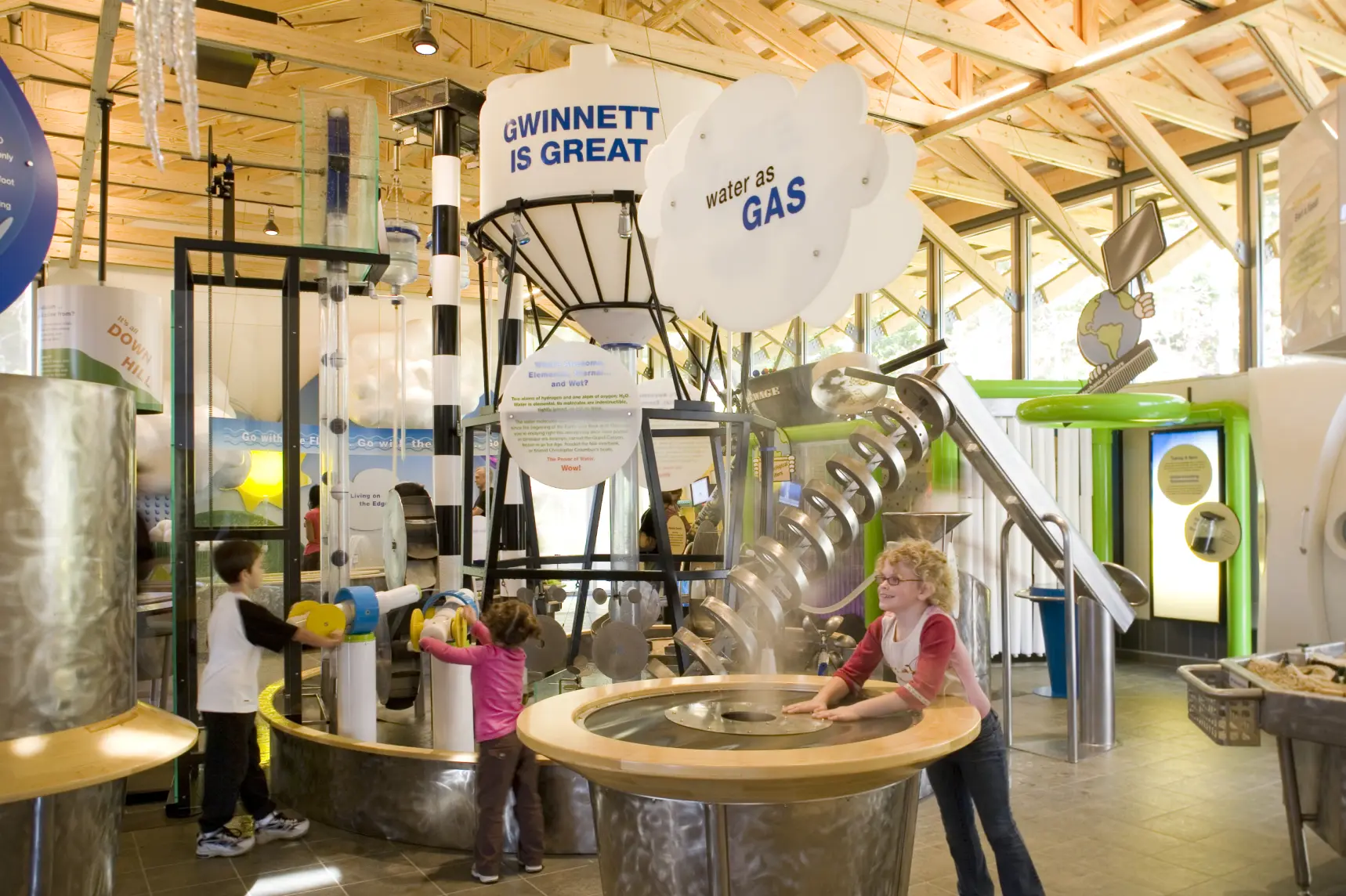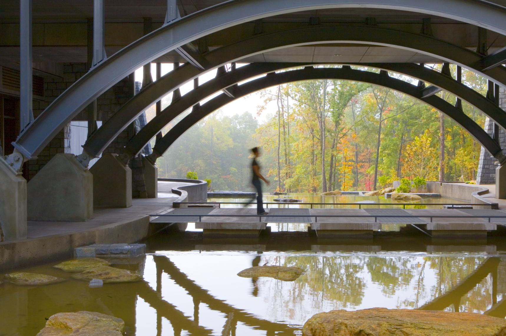 The Gwinnett Environmental & Heritage Center, designed as a collaborative project among various local stakeholders, serves as both an educational resource and a model of sustainability. The facility integrates innovative building technologies and sustainable strategies to enhance environmental awareness. The building is designed to minimize disruption to its 700-acre natural surroundings and incorporates sustainable features such as a one-acre vegetative roof, pervious pavement, and the use of gray water for non-potable applications. Inside, energy efficiency is achieved through systems like daylight harvesting, fan-assisted natural ventilation, and efficient HVAC design, all of which contribute to significant reductions in both energy and potable water use compared to traditional facilities of similar size. The center also features interpretive exhibits focused on the interrelationship between water and life, while its outdoor trails and water features, including a natural stream that cools the building, further integrate the facility with its environment. With these measures, the center achieved LEED Gold certification and continues to function as an exemplar of sustainable design.