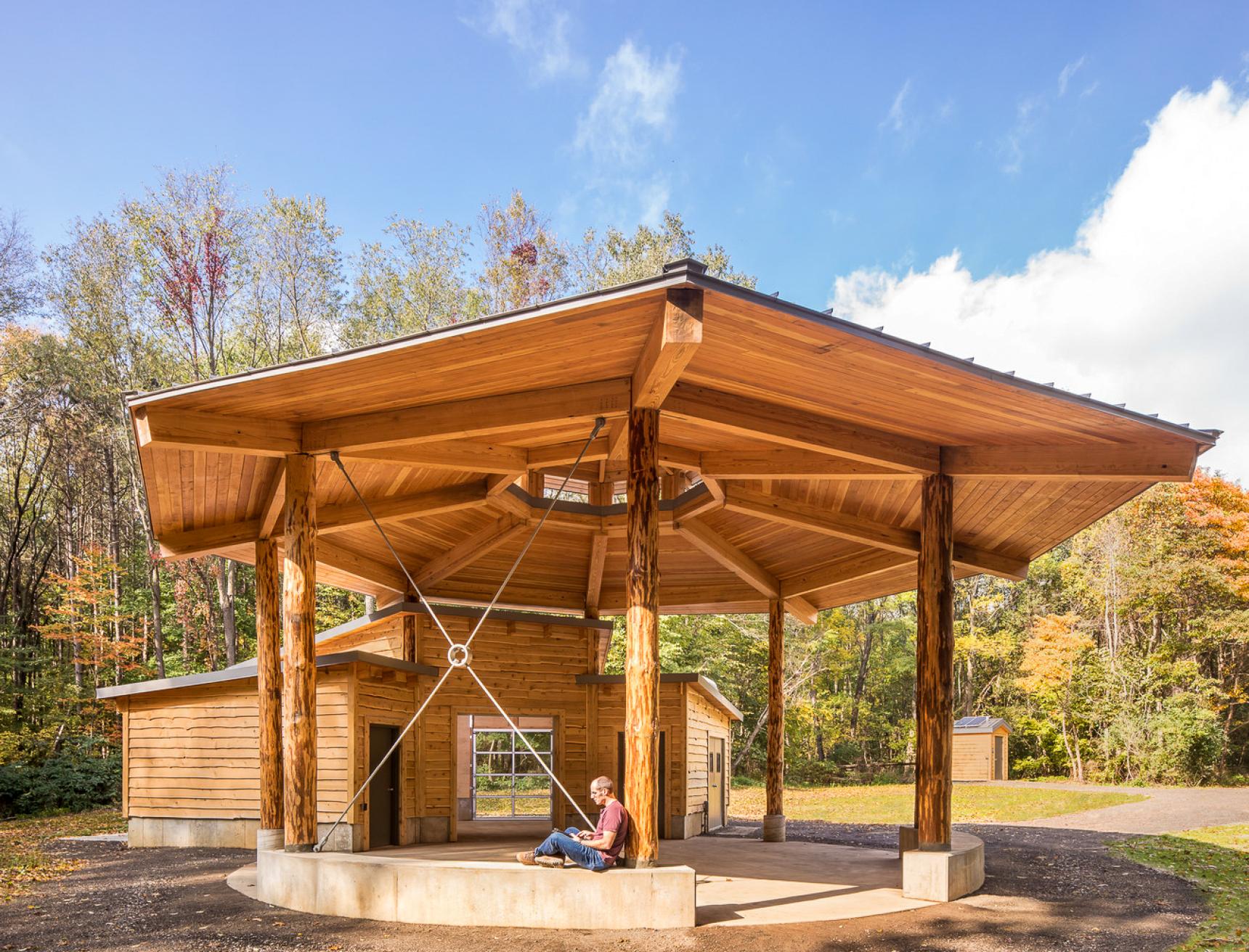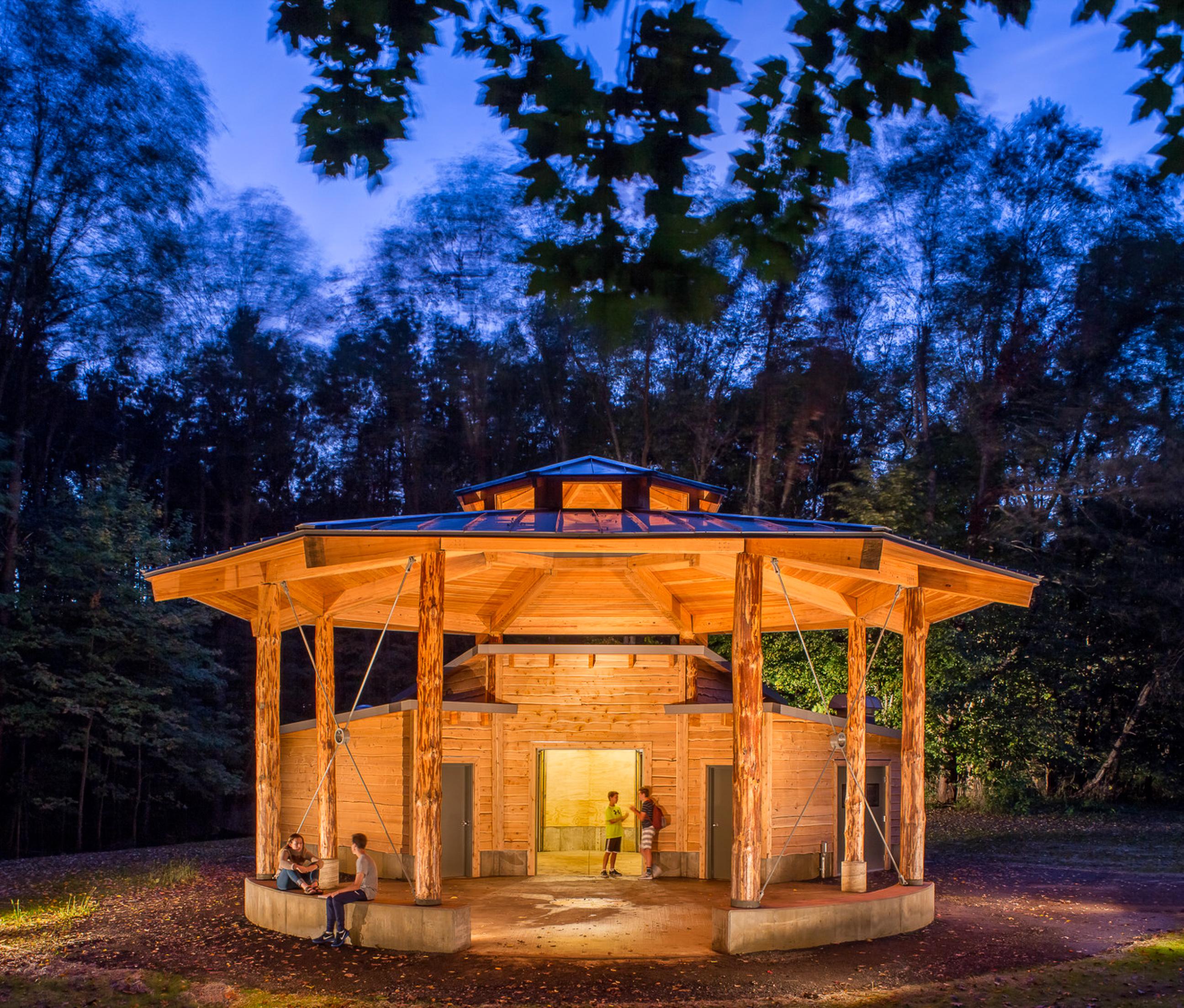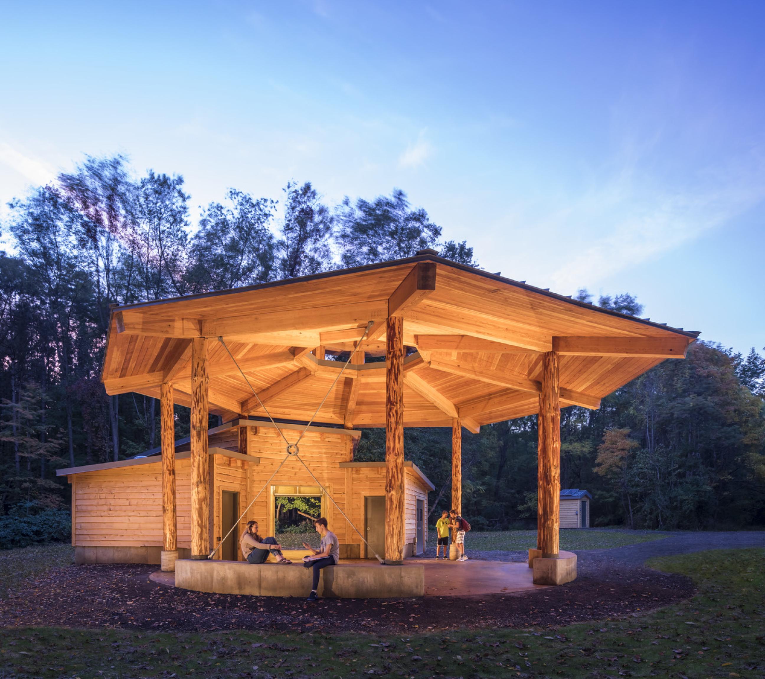 The team used design to acknowledge indigenous cultures for Batts Pavilion, which is located on the ancestral lands of the Pokagon Band of the Potawatomi. The off-grid educational pavilion was inspired by the traditional Potawatomi wigwam, round in form and opening to the east with a central fire pit.