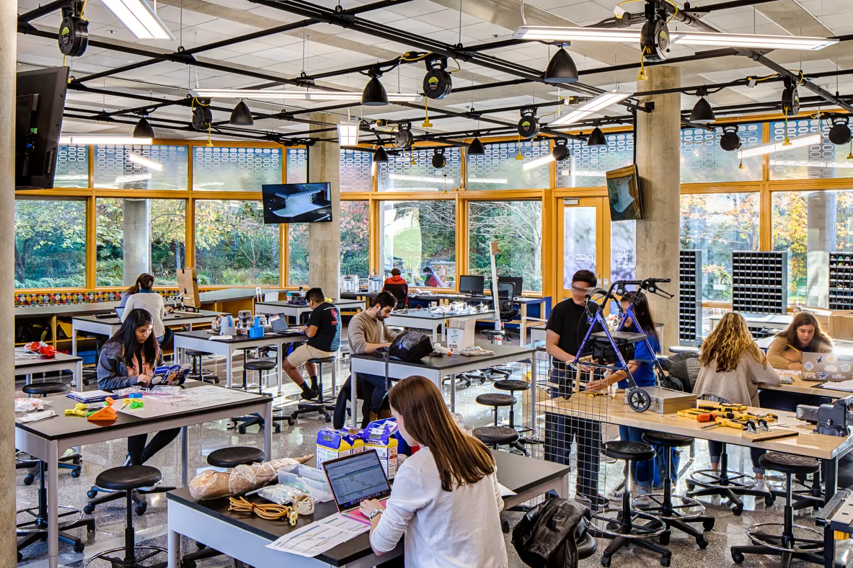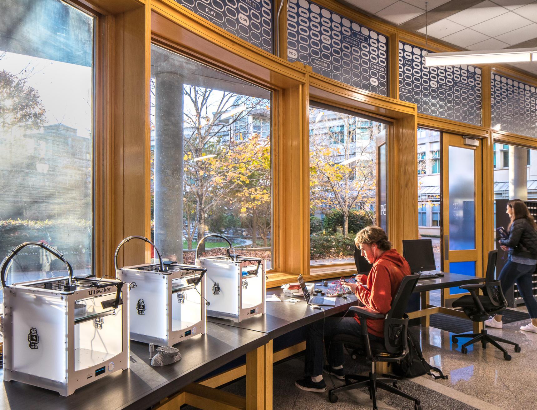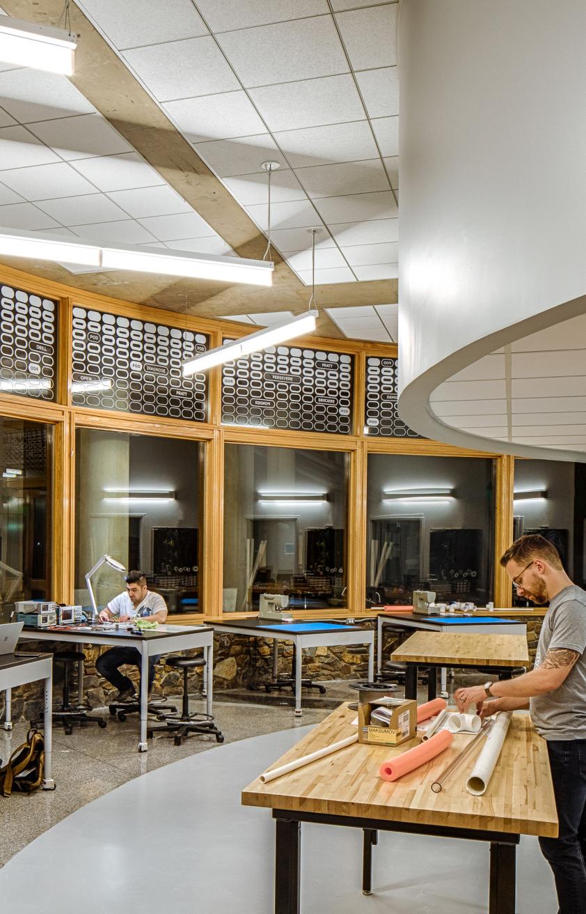 Each area of the POD was designed with purpose—lecture, lounging, and work areas—and stocked with equipment and tools in clear sight of instructors and lab managers. Digital screens and a major sound system ensure all students are comfortably able to engage in active learning.