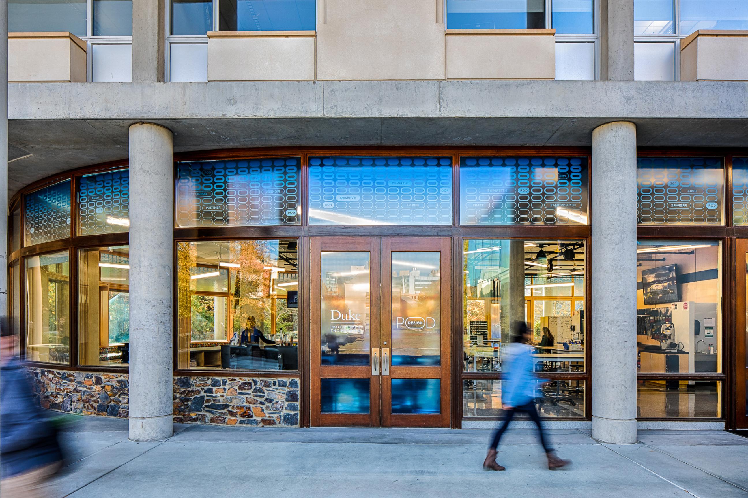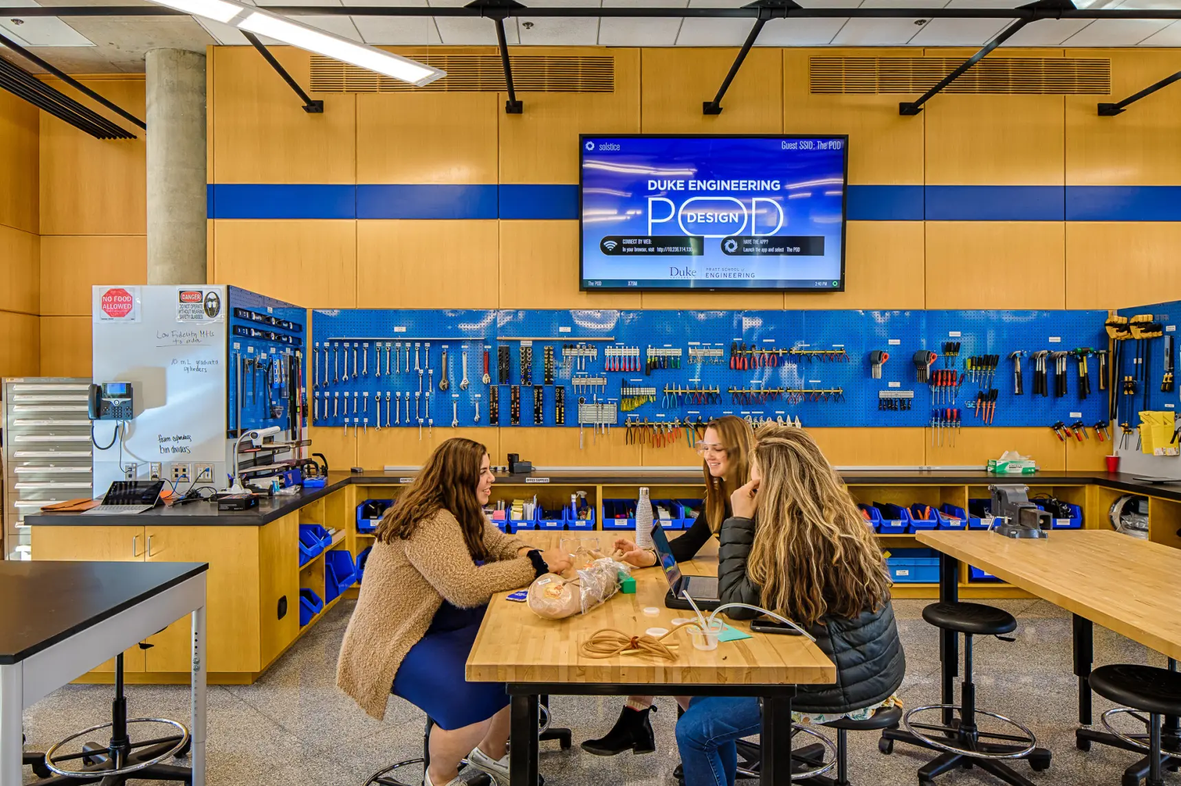 The Freshman Design Learning Lab, known as “the POD,” is a newly established maker-space located within Duke University’s Levine Science Resource Center. Developed for the Pratt School of Engineering, this facility repurposes a former café space, converting it into a versatile environment for first-year engineering students. The project was completed within a five and a half month timeline, utilizing readily available materials to ensure both visual appeal and functional flexibility. Key features include a flexible overhead pipe grid for power and lighting, movable storage units, and integrated systems for specialized tools such as saws and laser cutters. Additionally, the lab features new audiovisual capabilities and vibrant graphical elements, fostering a dynamic setting that supports 24-hour access and active student engagement.