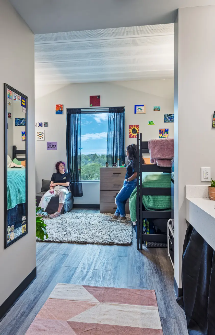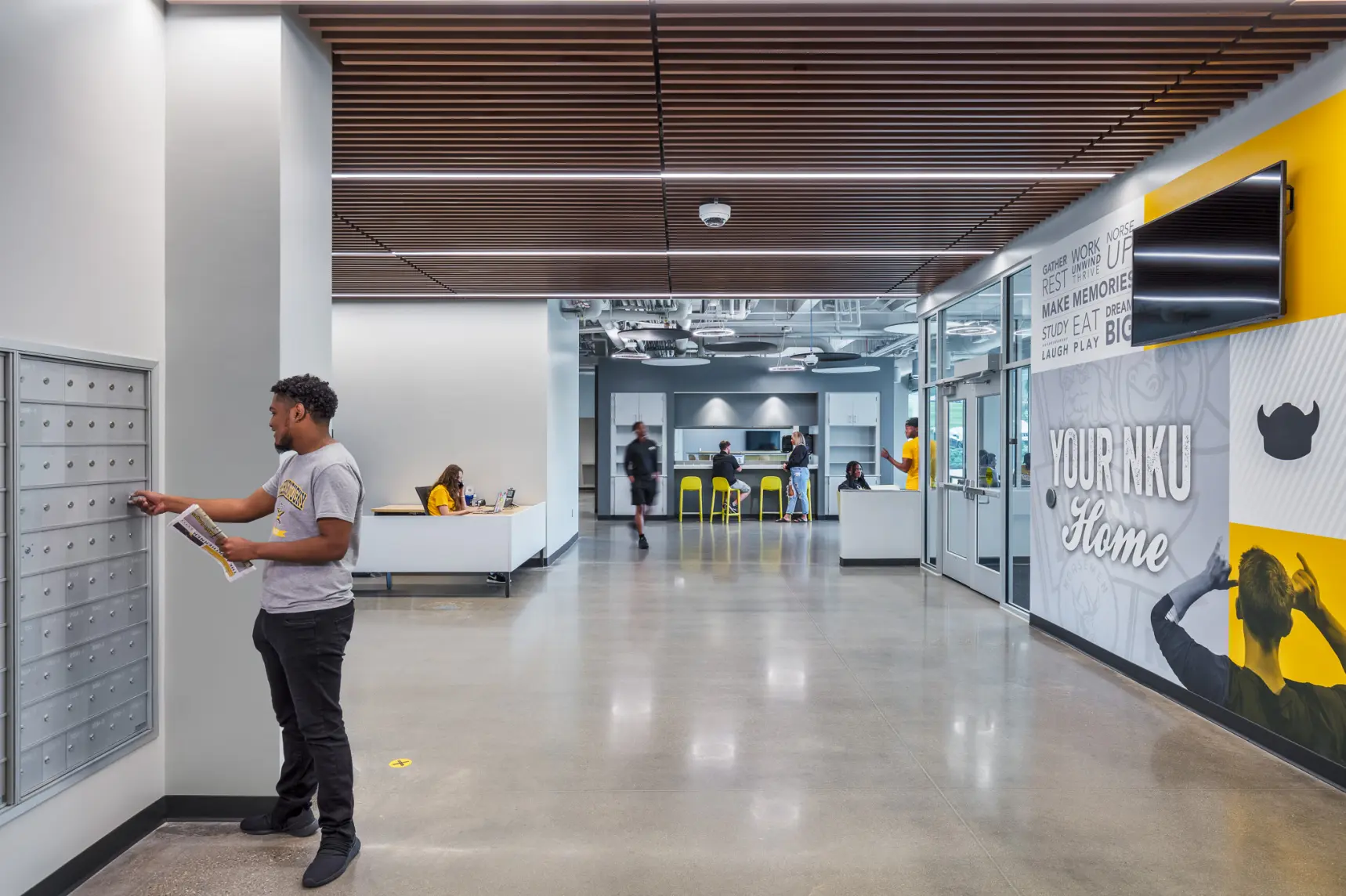 As the design architect, Lord Aeck Sargent partnered with Moody Nolan and Northern Kentucky University to envision a new student housing project. In alignment with NKU's updated campus master plan, the team evaluated ten potential sites and building types to identify the optimal location. The selected prominent site at the entrance to the north campus allows for a podium level featuring student community space and an outdoor plaza to accommodate the sloping terrain. The five-story, L-shaped building accommodates 297 students in semi-suite-style units, maintaining a 34:1 student-to-resident-advisor ratio. Each floor includes common areas, study rooms, and open gathering spaces to foster community interaction. The podium level is home to key amenities such as a laundry room, community kitchen, and multi-purpose room. Opened in 2021, this project achieved LEED Silver certification, offering a modern, sustainable living and learning environment for NKU students.