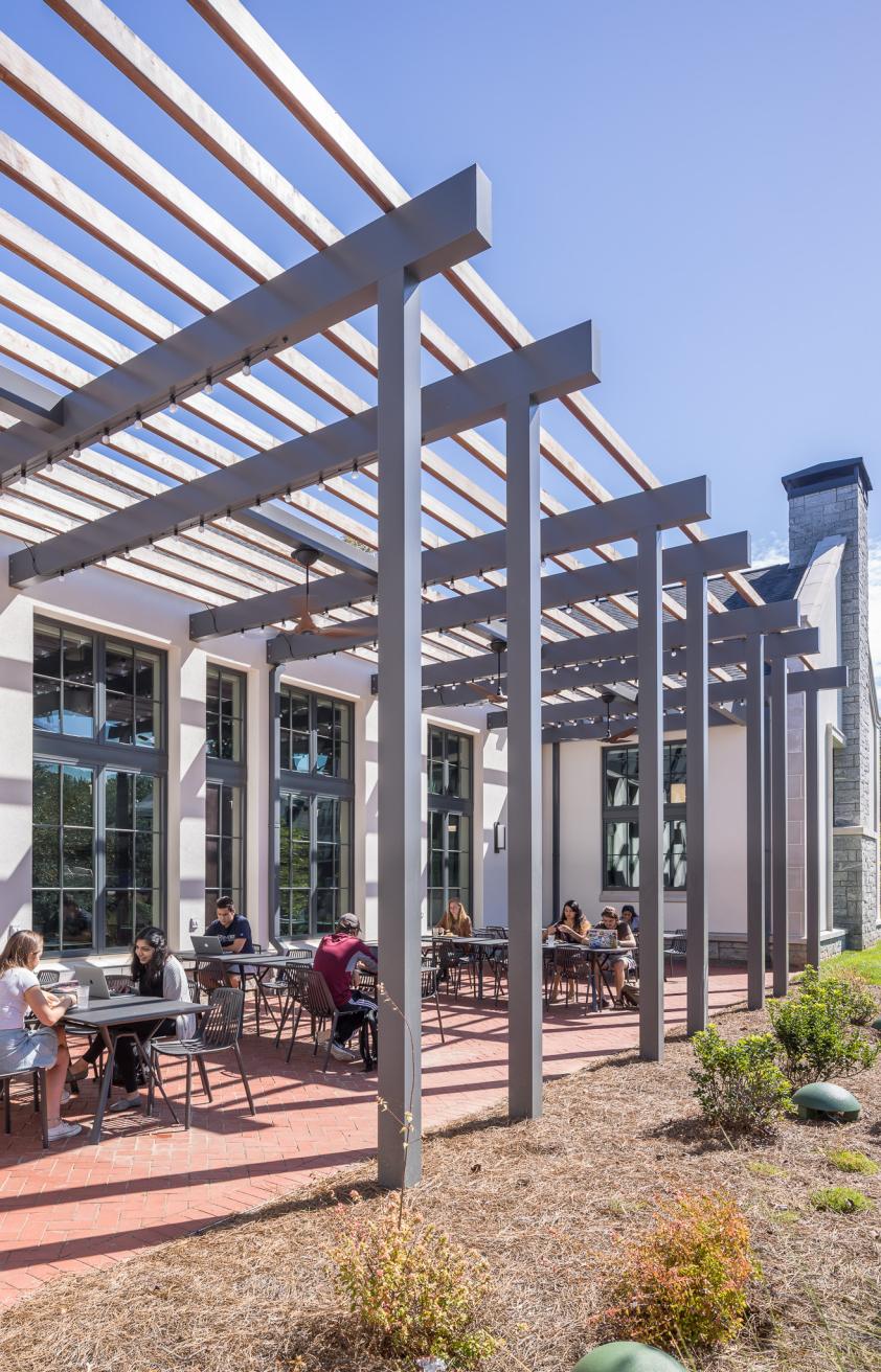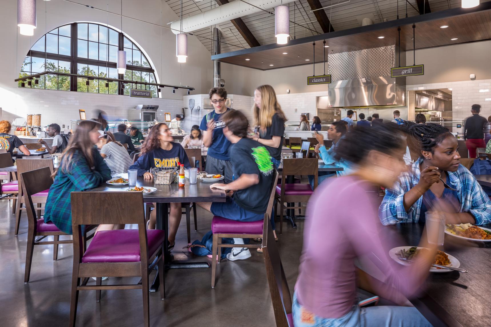 Emory Oxford's commitment to sustainability and locally sourced food is embodied in its new dining facility, designed by Lord Aeck Sargent. Situated on the edge of the intimate campus, the building's layout harmonizes with the trapezoidal site shape and traditional stucco-clad architecture. The spacious interior, featuring exposed wood trusses, can accommodate 400 diners in the main area and an additional 100 in the Dean's Dining Room. Market-style food stations showcase vegan and non-vegan options, while a large lunette window invites guests to witness the preparation of oven-baked delights. Inspired by historic market halls, the design offers cozy nooks for socializing, ensuring a diverse and engaging dining experience that celebrates Emory's farm-to-table ethos.