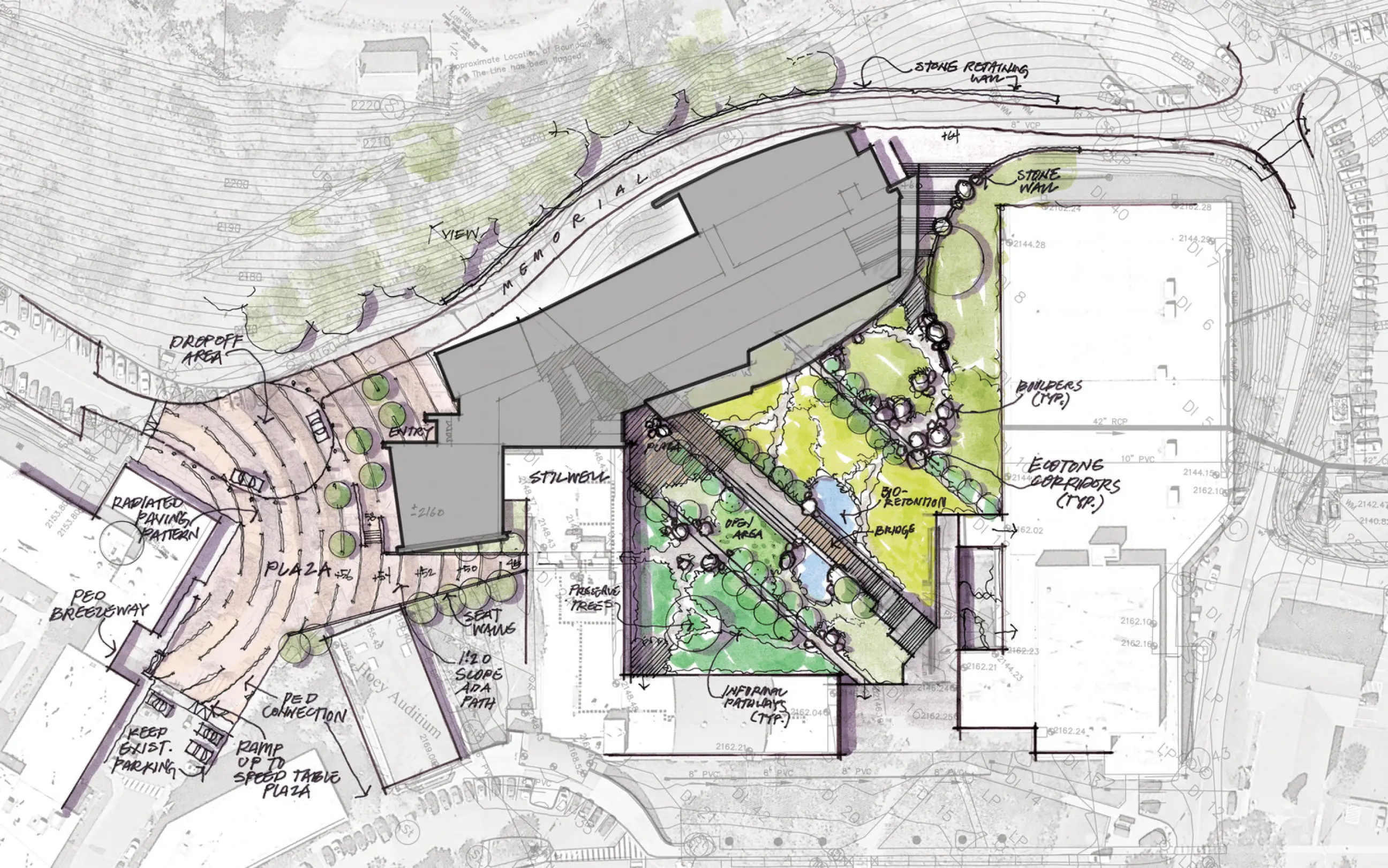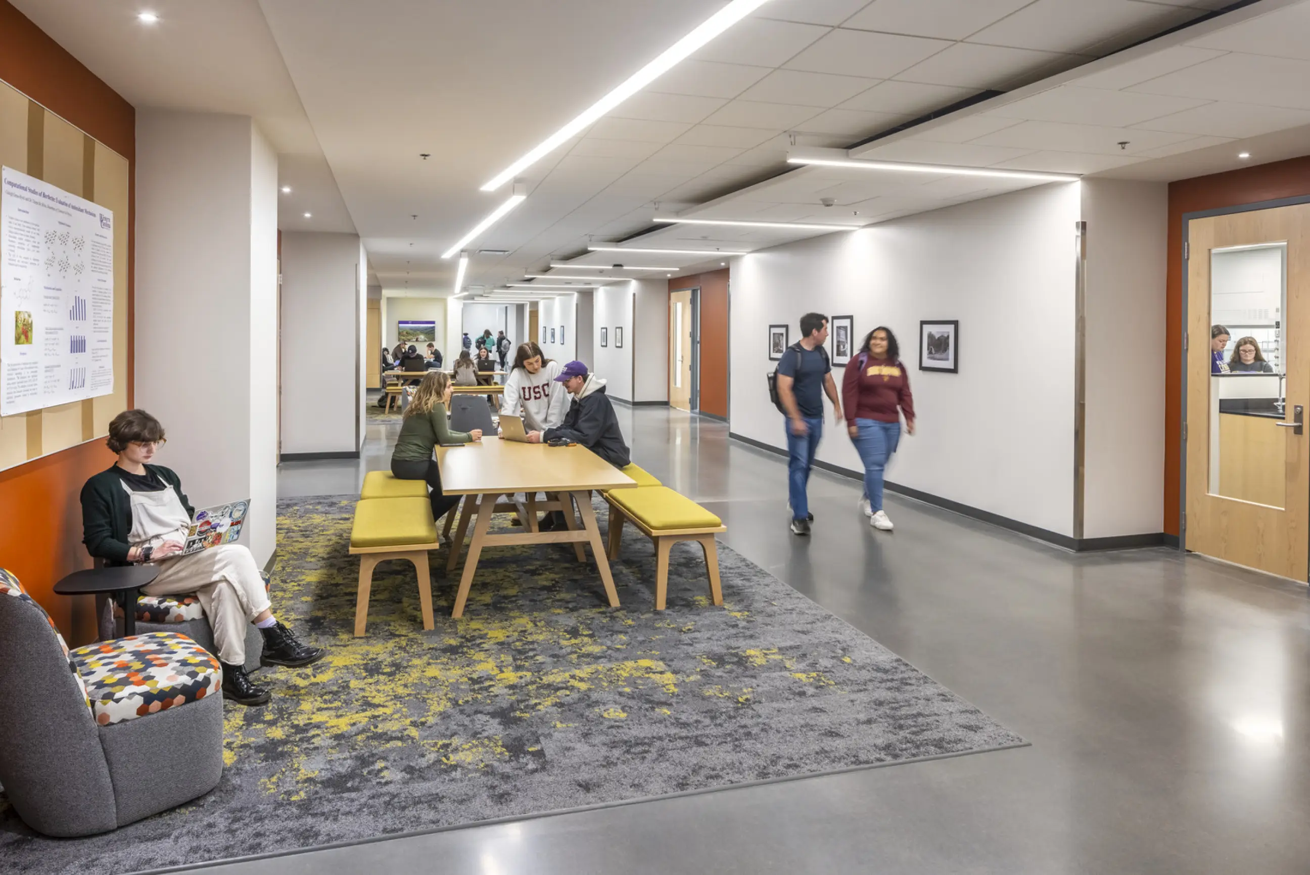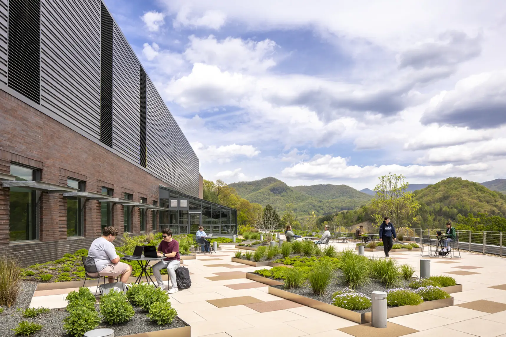 The new building seamlessly connects with the existing Stillwell Science Building, promoting interdisciplinary collaboration. Featuring a rooftop terrace with mountain views, sustainable elements like a 15,000-square-foot greenhouse, and community-focused spaces such as 'the gorge' and 'the commons,' it embodies the university's commitment to interactive, interdisciplinary learning grounded in the region's heritage and natural beauty.