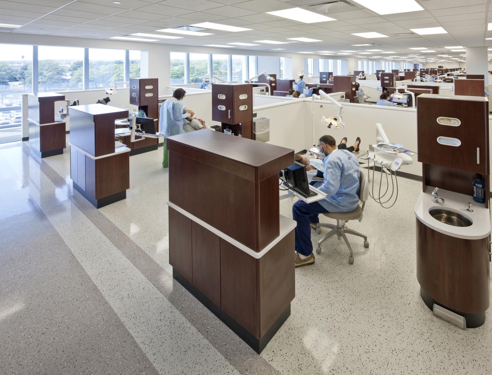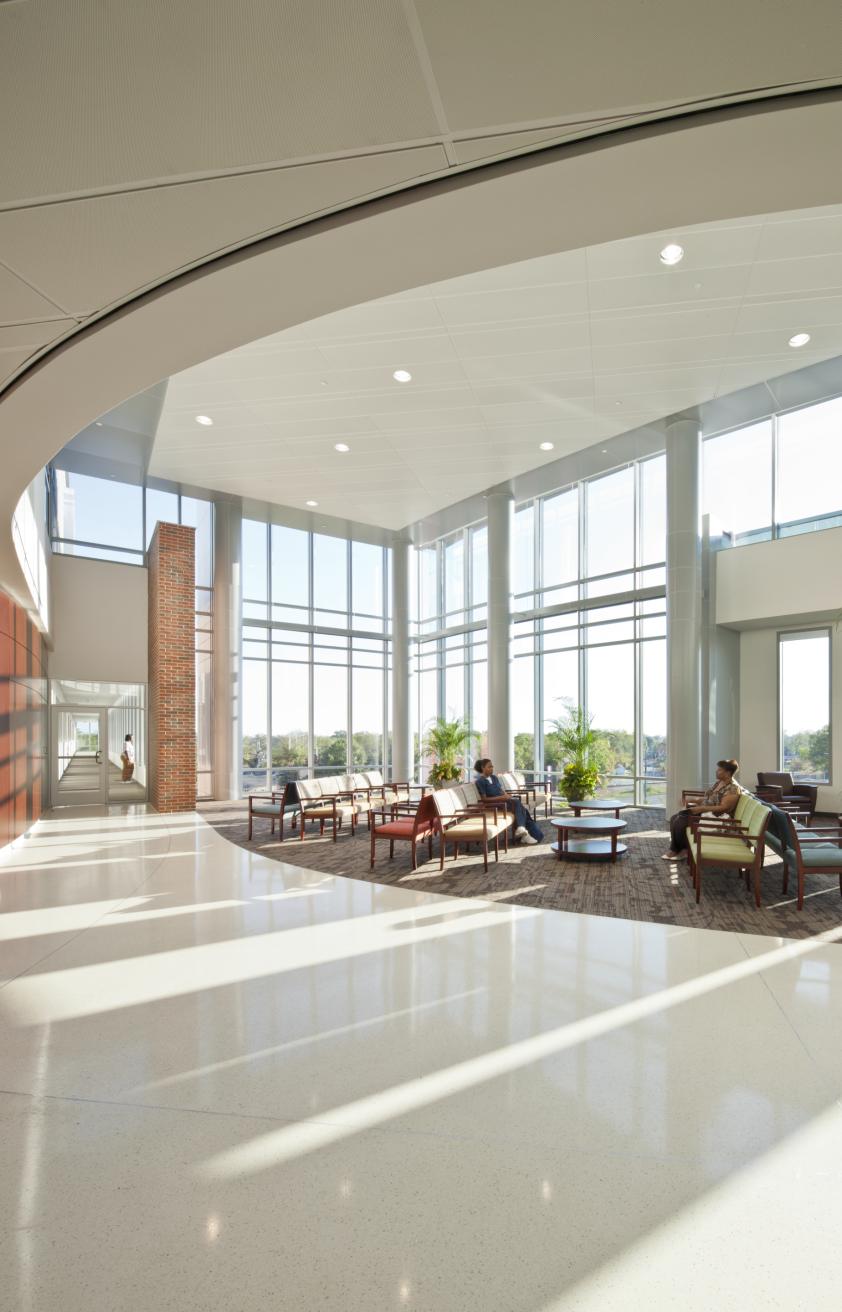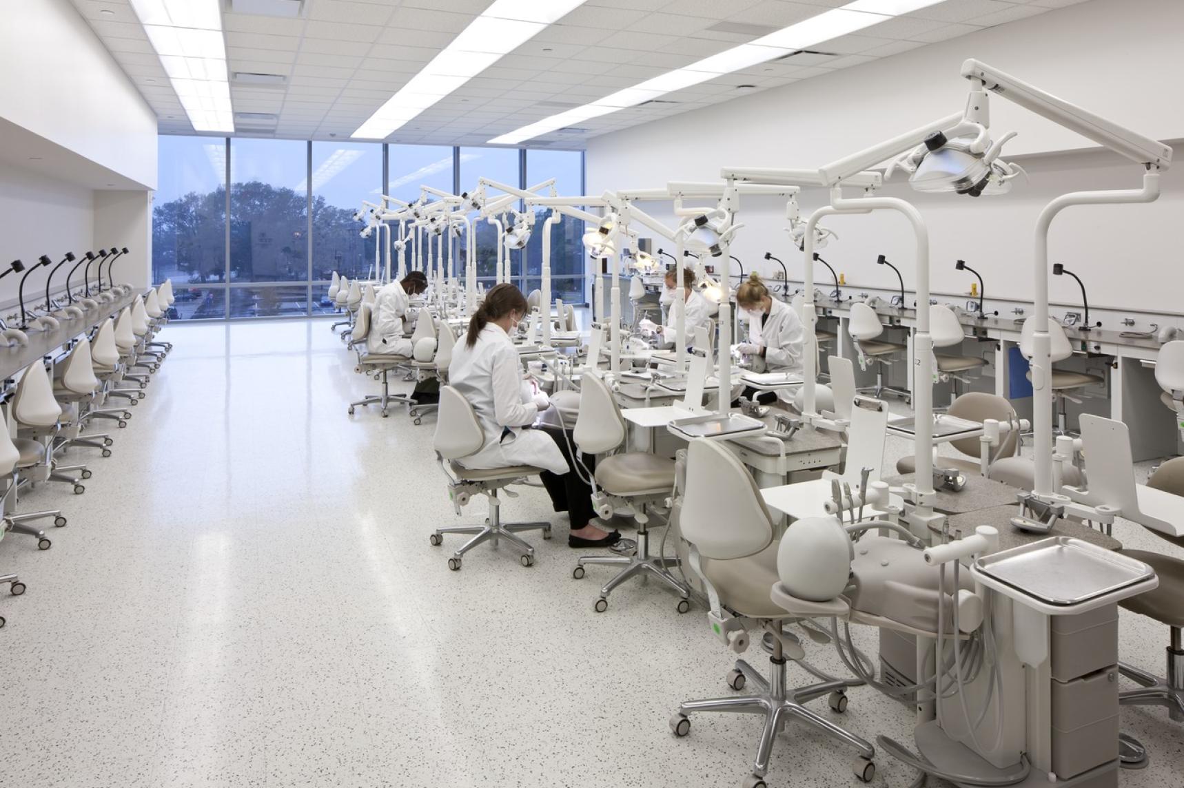 Lord Aeck Sargent, in collaboration with Francis Cauffman, crafted a state-of-the-art dental education center designed to seamlessly integrate the college’s educational objectives with adaptable spaces for teaching, research, and patient care. The facility encompasses a wide range of specialized areas including simulation labs, dental clinics, and research spaces covering various dental specialties from orthodontics to endodontics. Supporting these are clinical facilities like sterilization and production labs, complemented by faculty offices and informal learning zones. Embodying an open, modular design, the center fosters adaptability, enabling departments to adjust with evolving needs. Shared spaces, such as conference areas and an inviting central atrium, promote collaboration and serve as orientation points for visitors. The building's emphasis on natural light, achieved through extensive glass usage, creates a bright and welcoming environment conducive to learning and innovation.